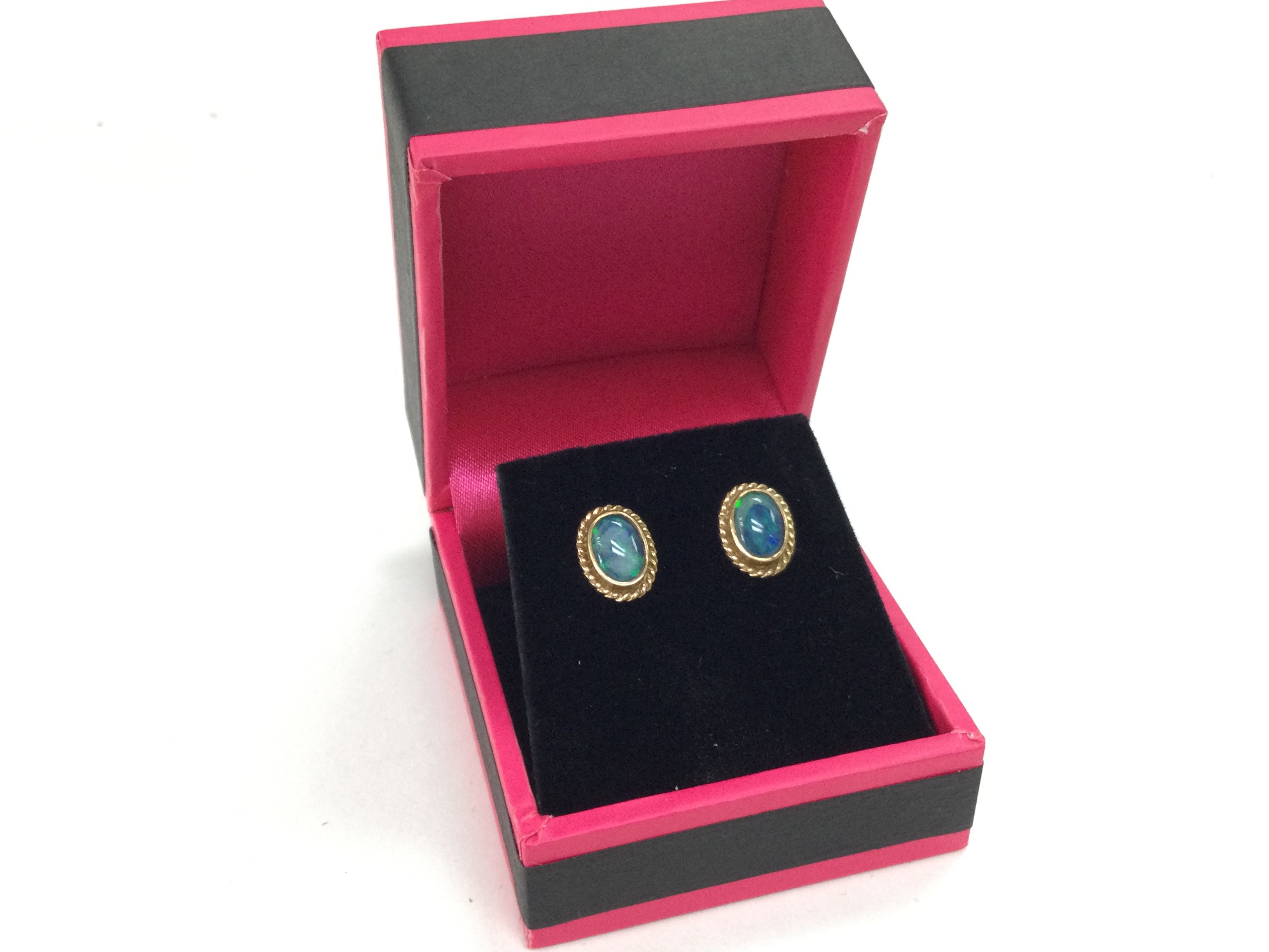 A pair of 9ct gold earrings set with opal doublet. Postage category A