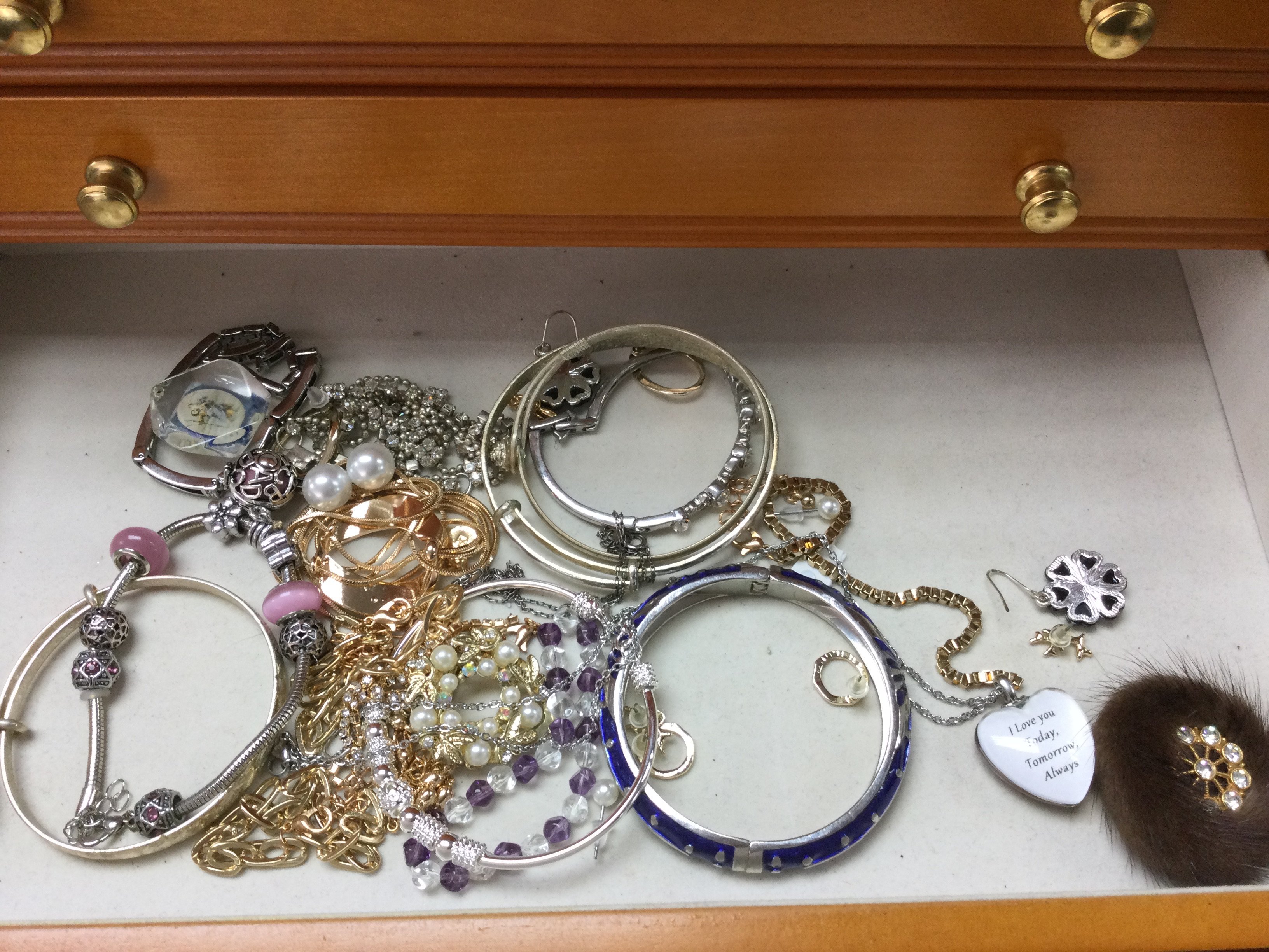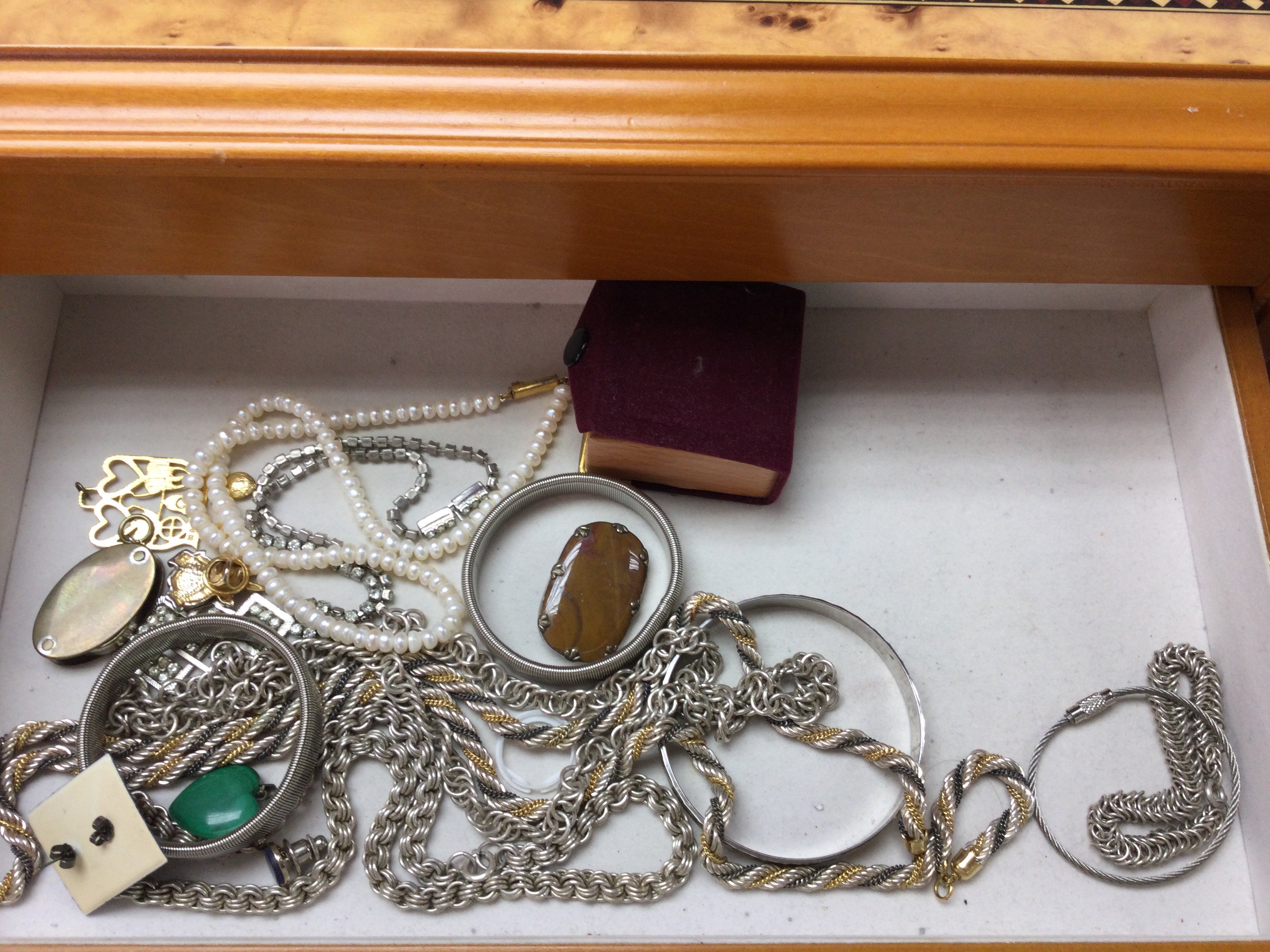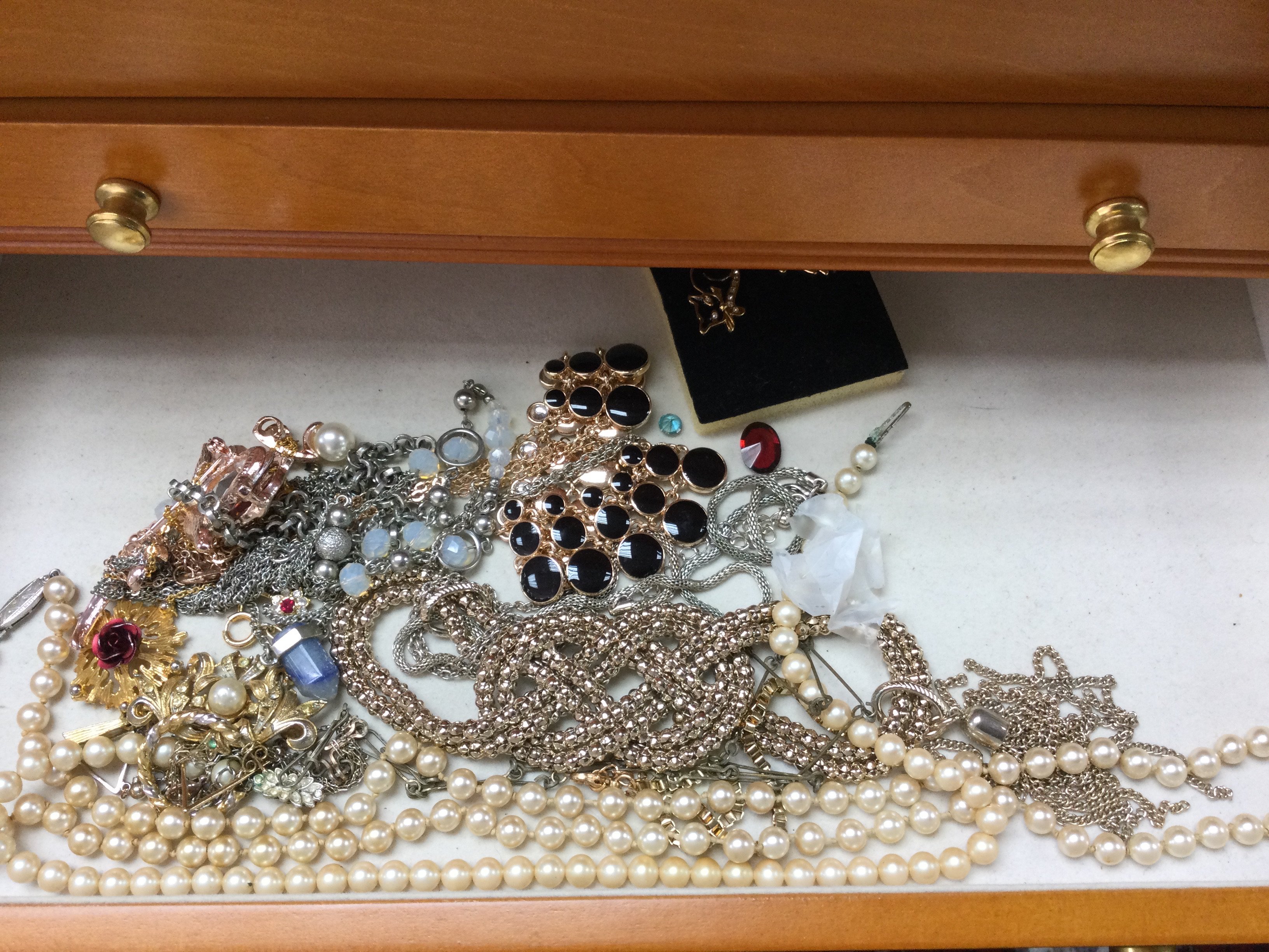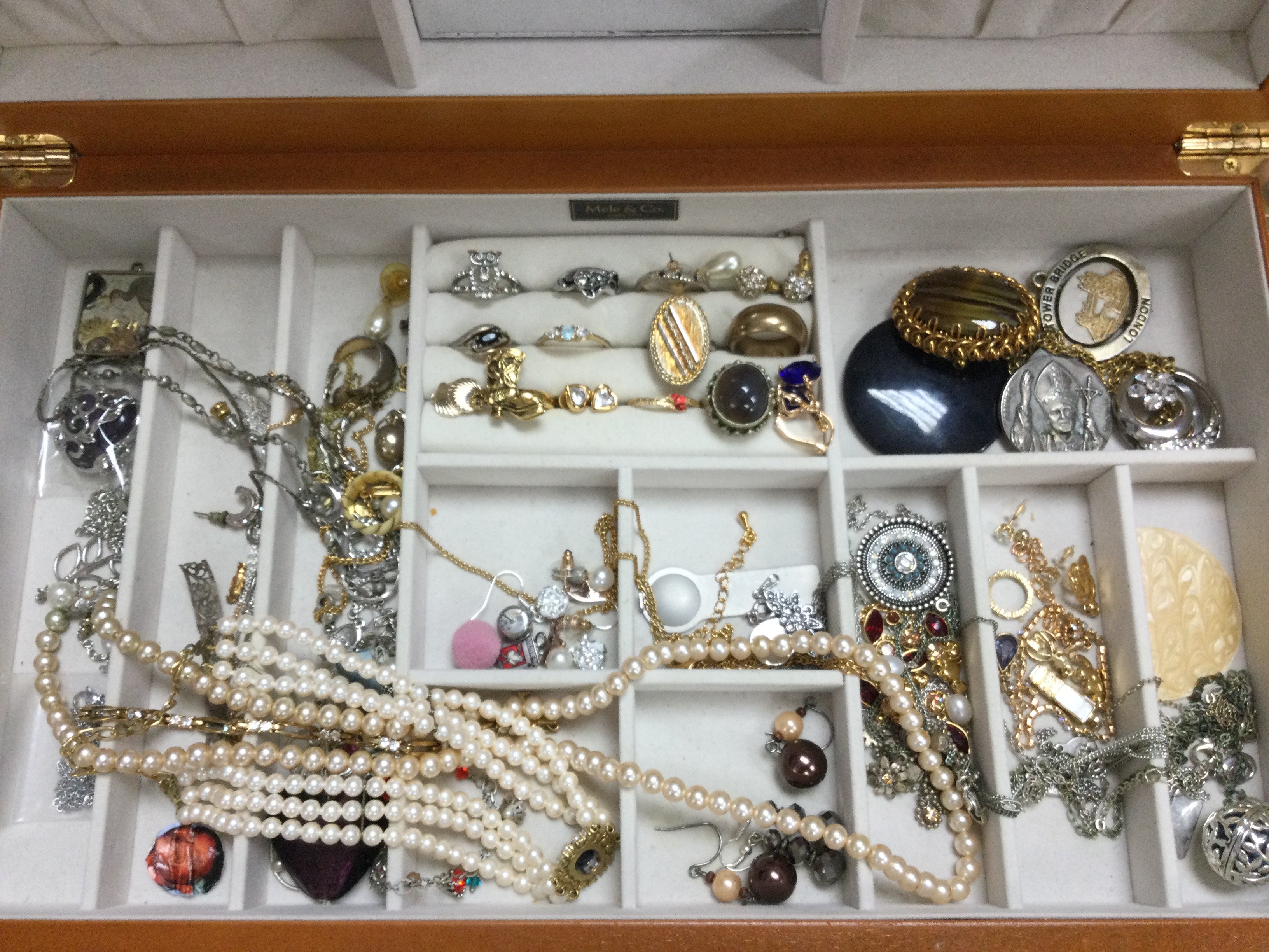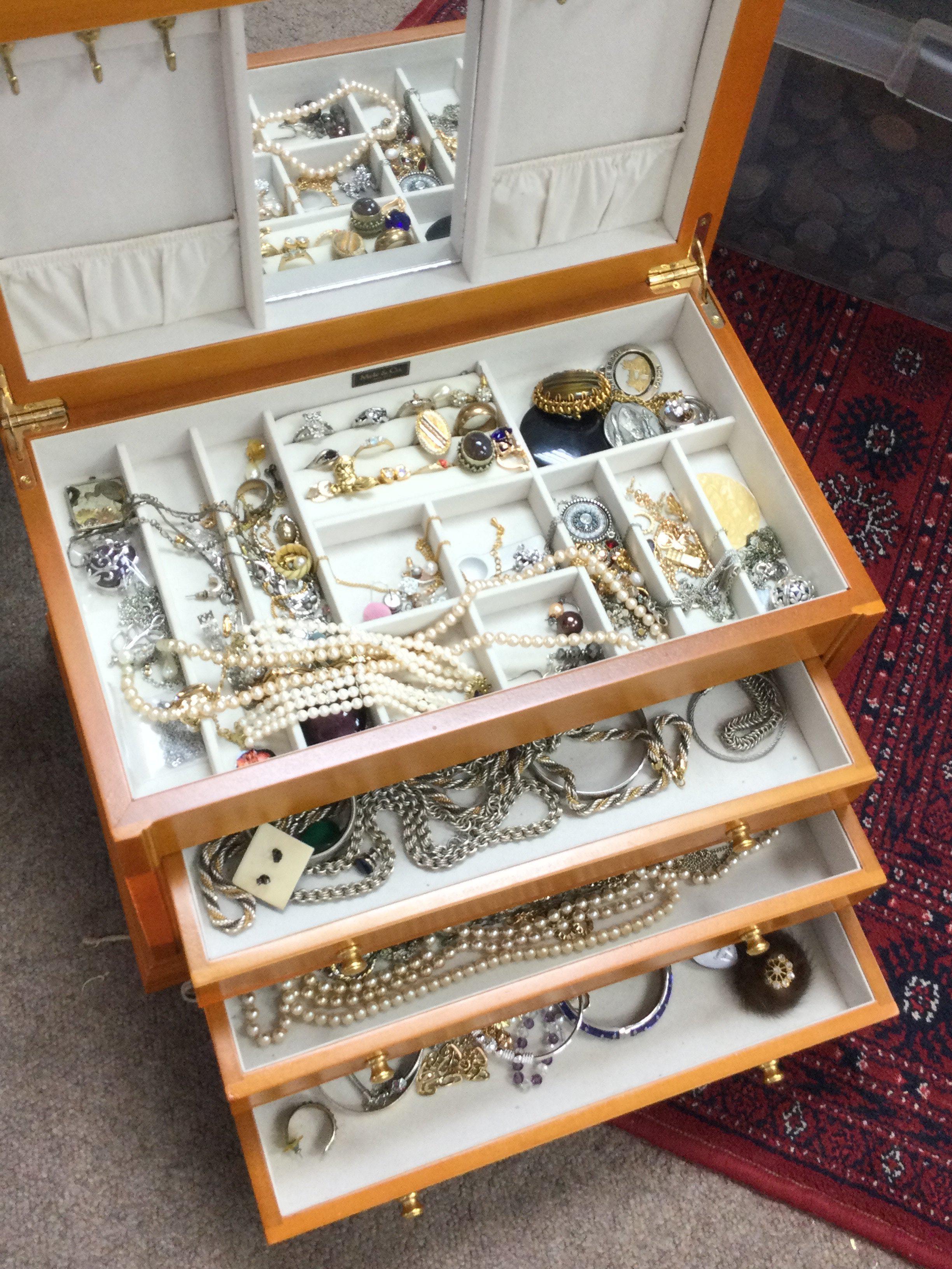 A box of costume jewellery including necklaces, brooches, bracelets etc. postage category C