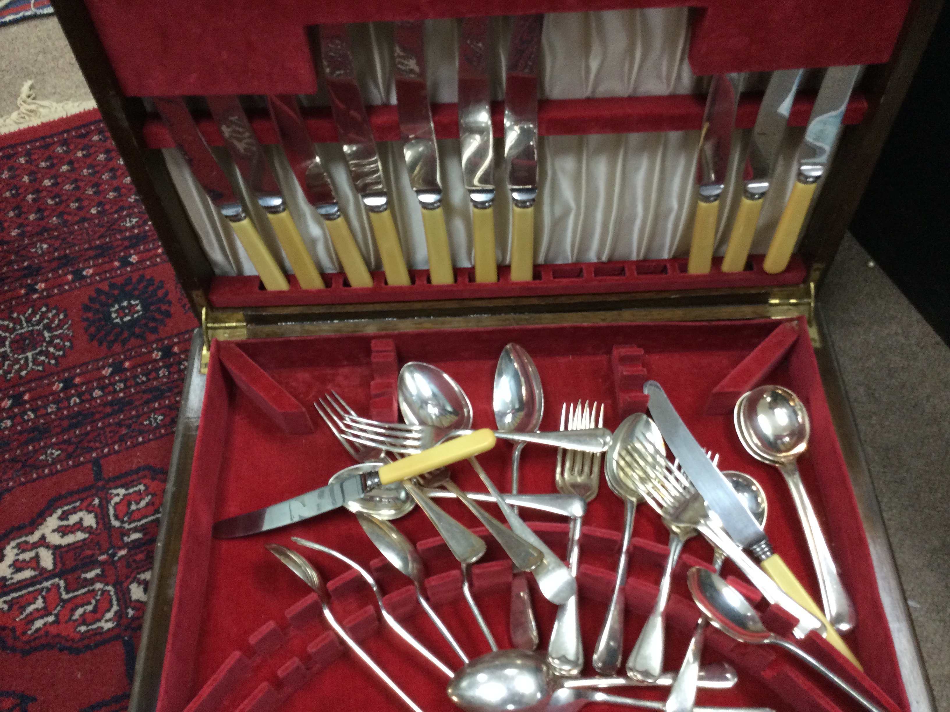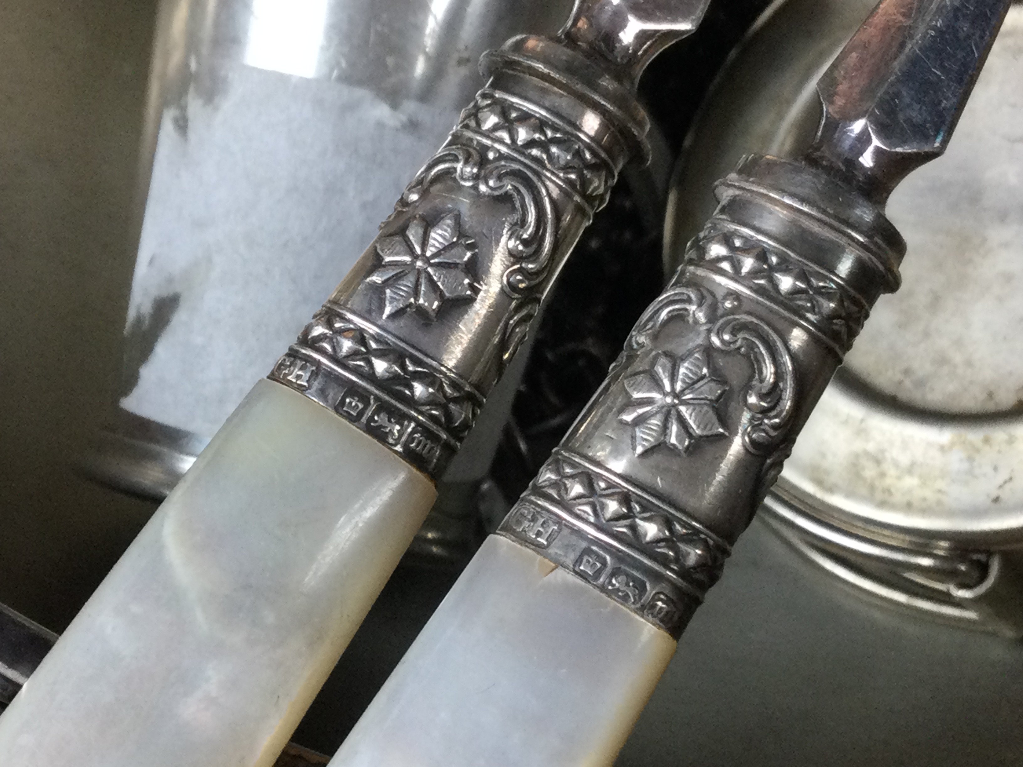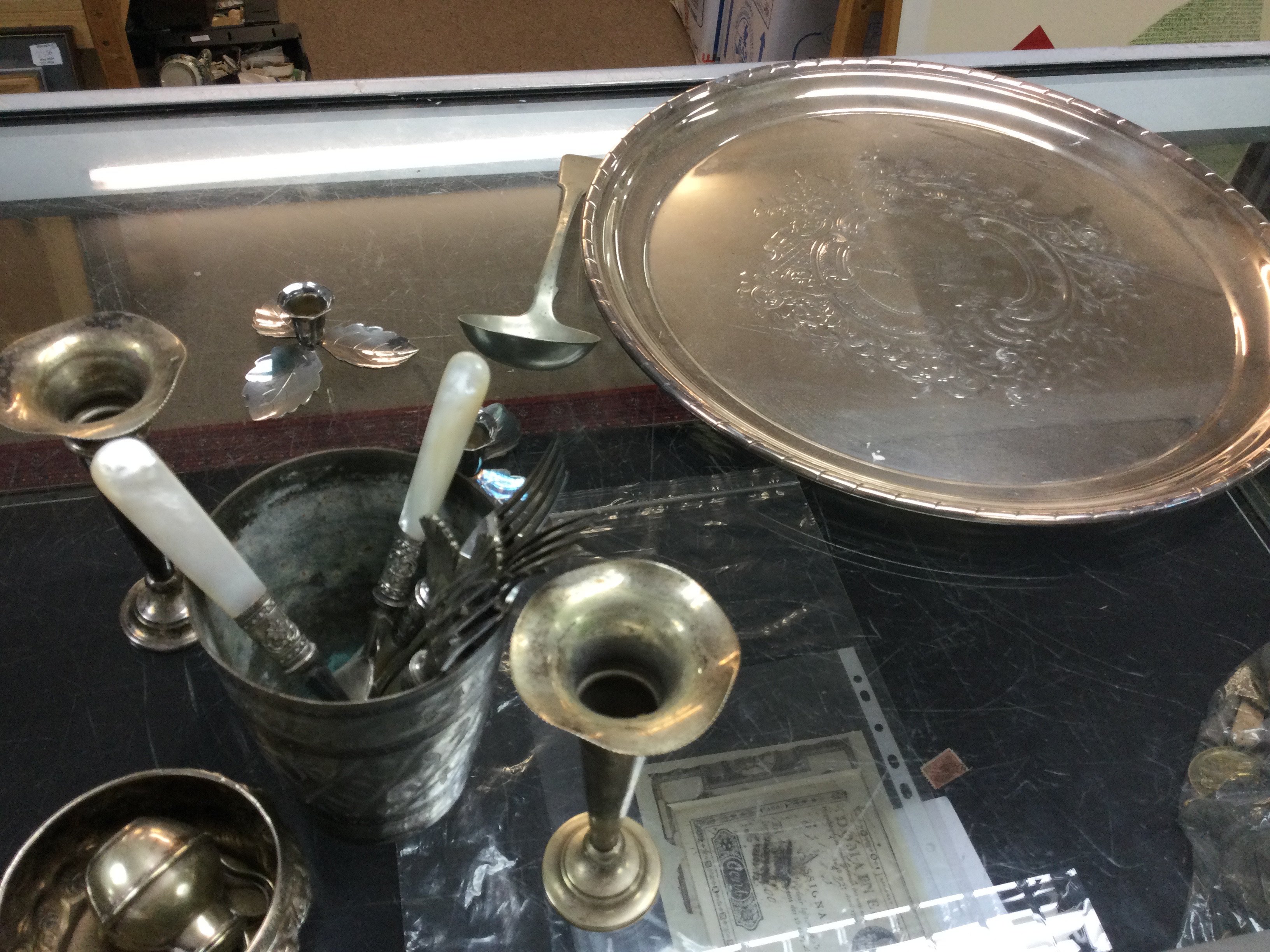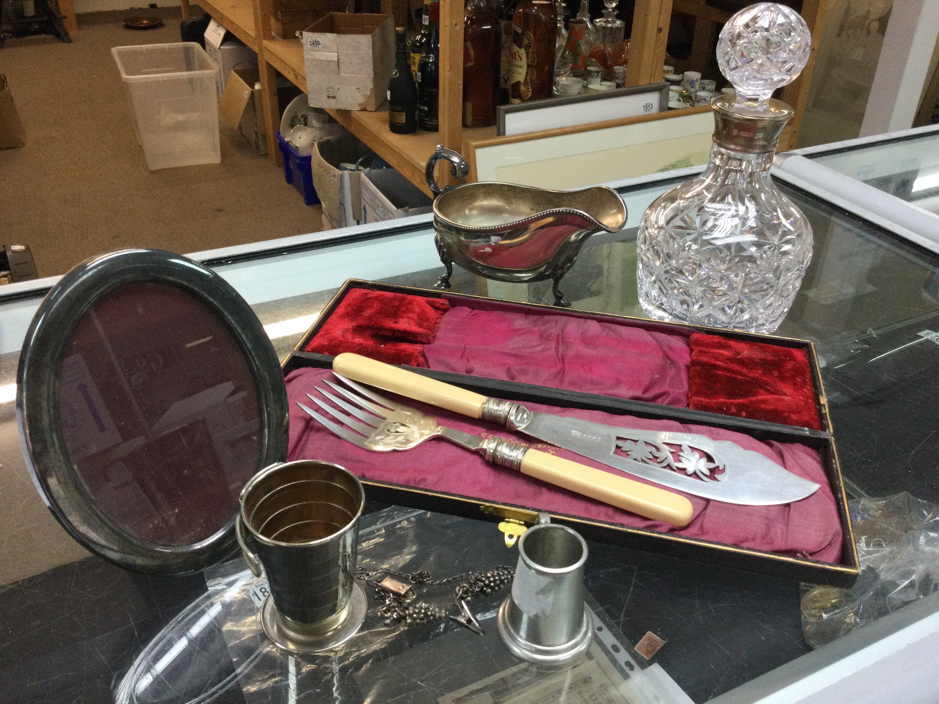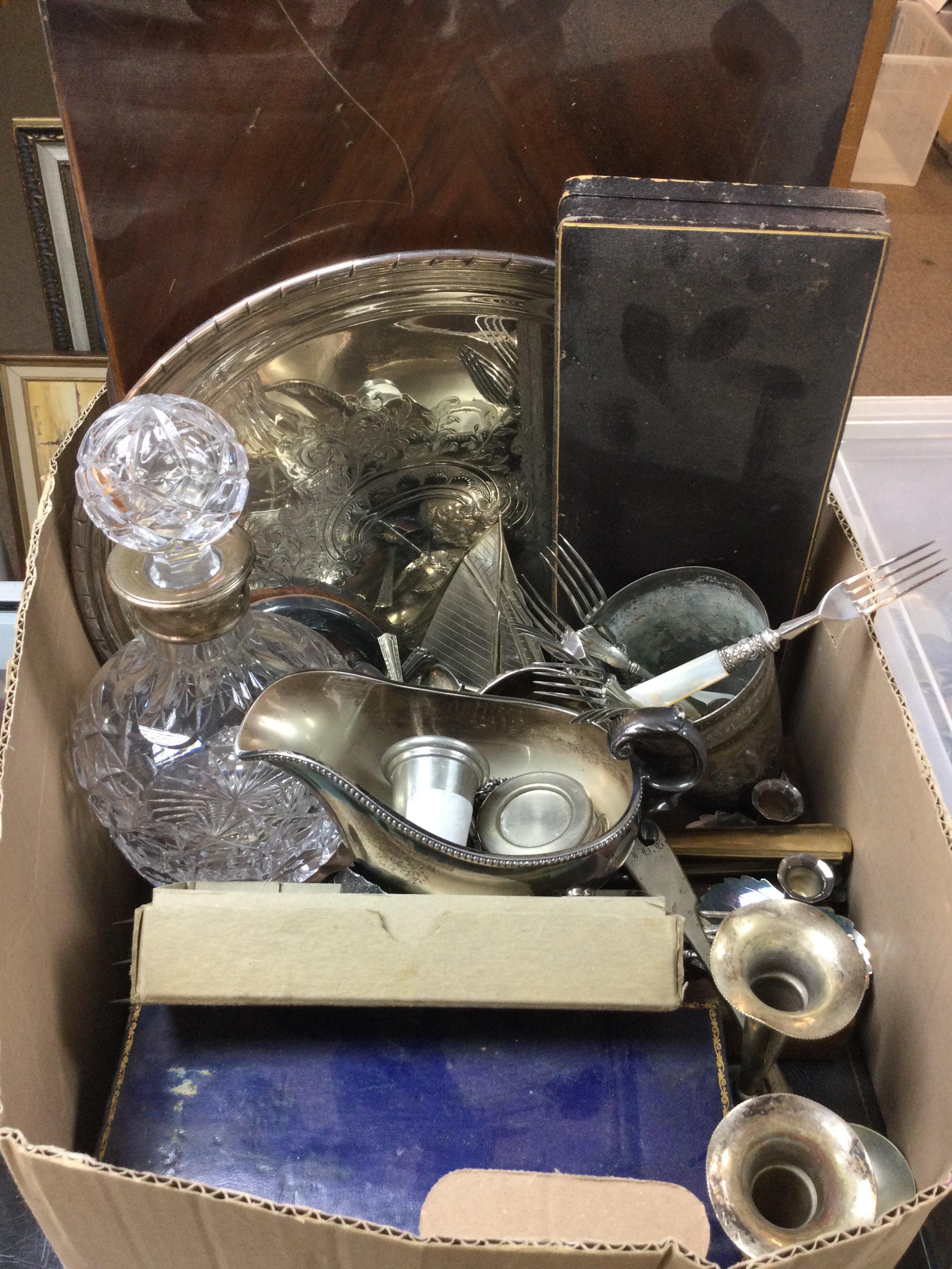 A collections of silver plate items including some silver hallmarked including cutlery and a cut glass decanter. This lot cannot be posted
