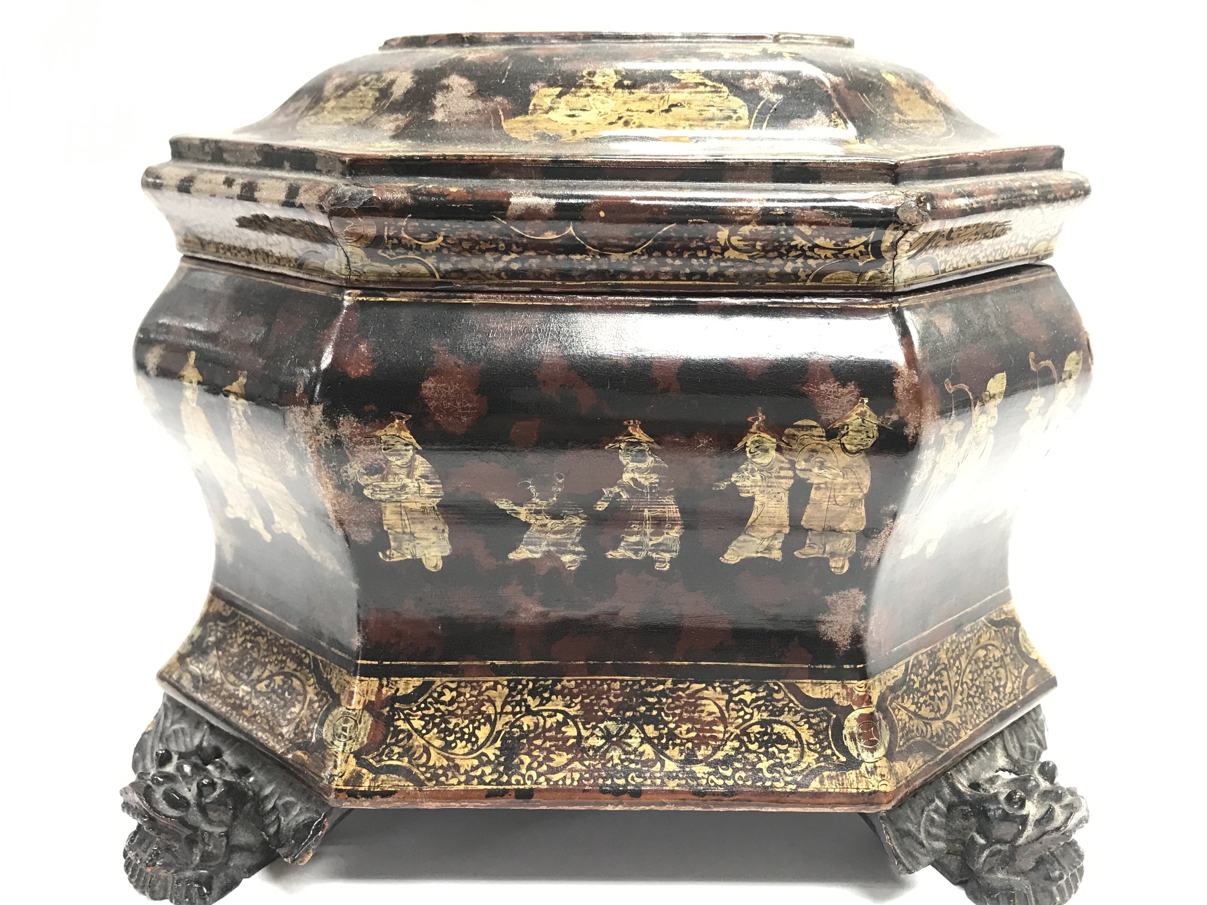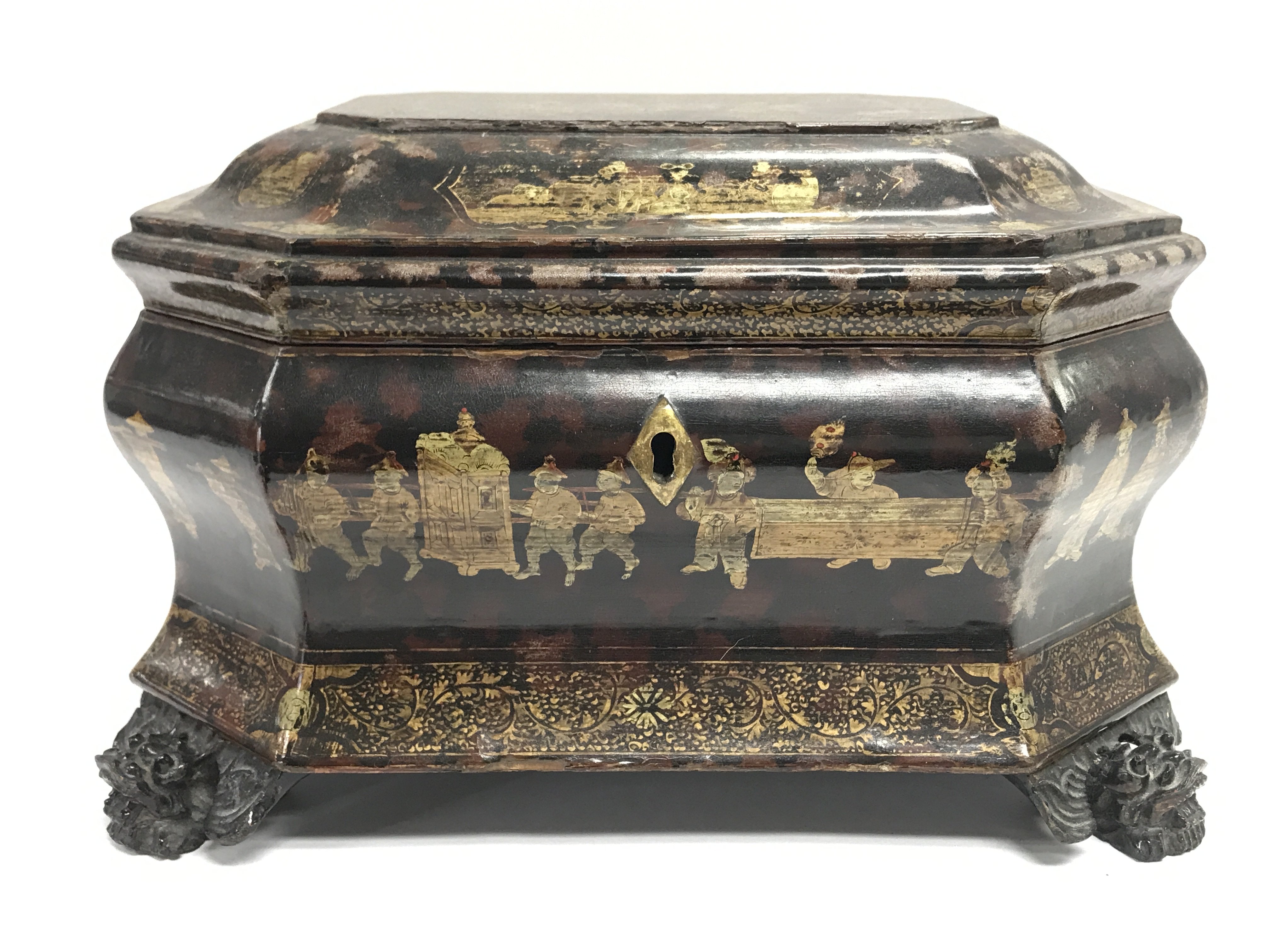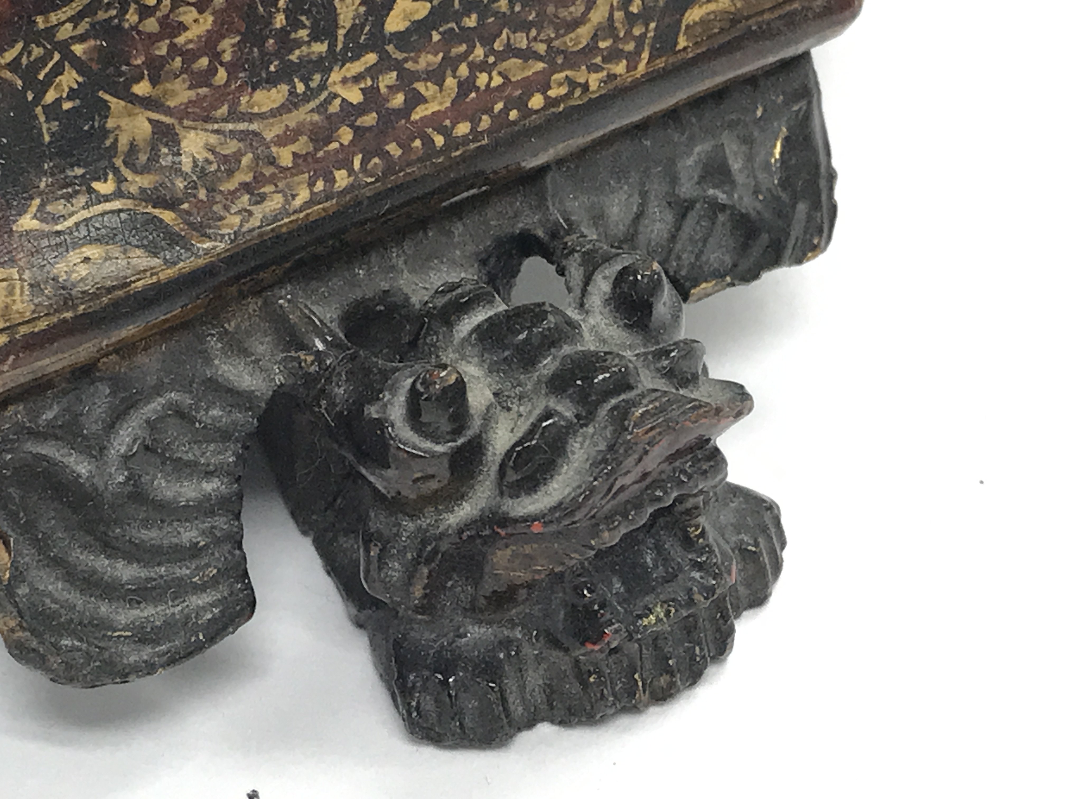 A Chinese black lacquer box with gilt decoration and dragon head feet, dimensions 25x19x16cm approximately. Postage category C