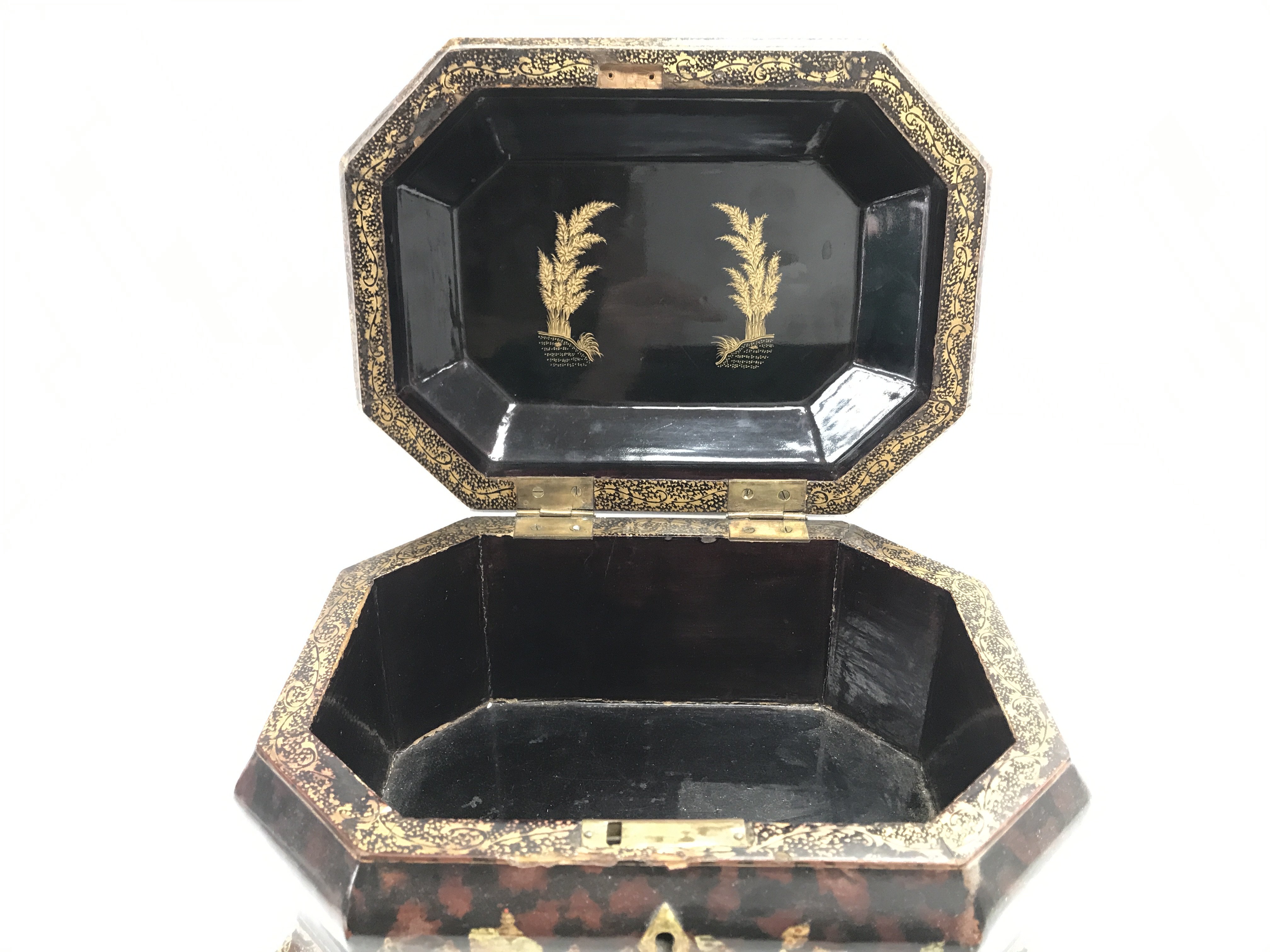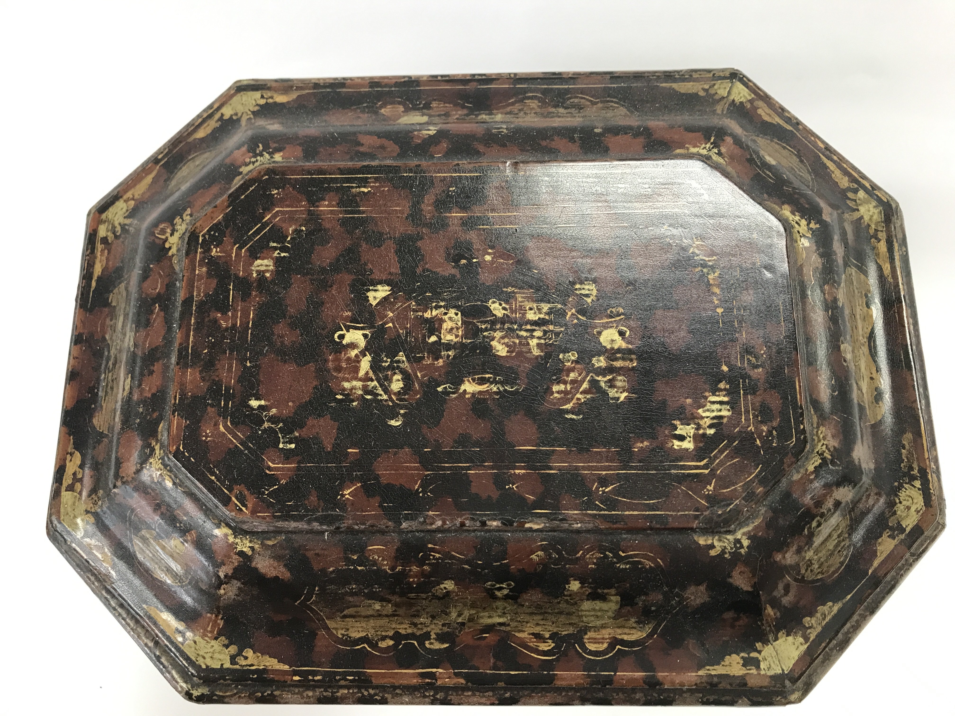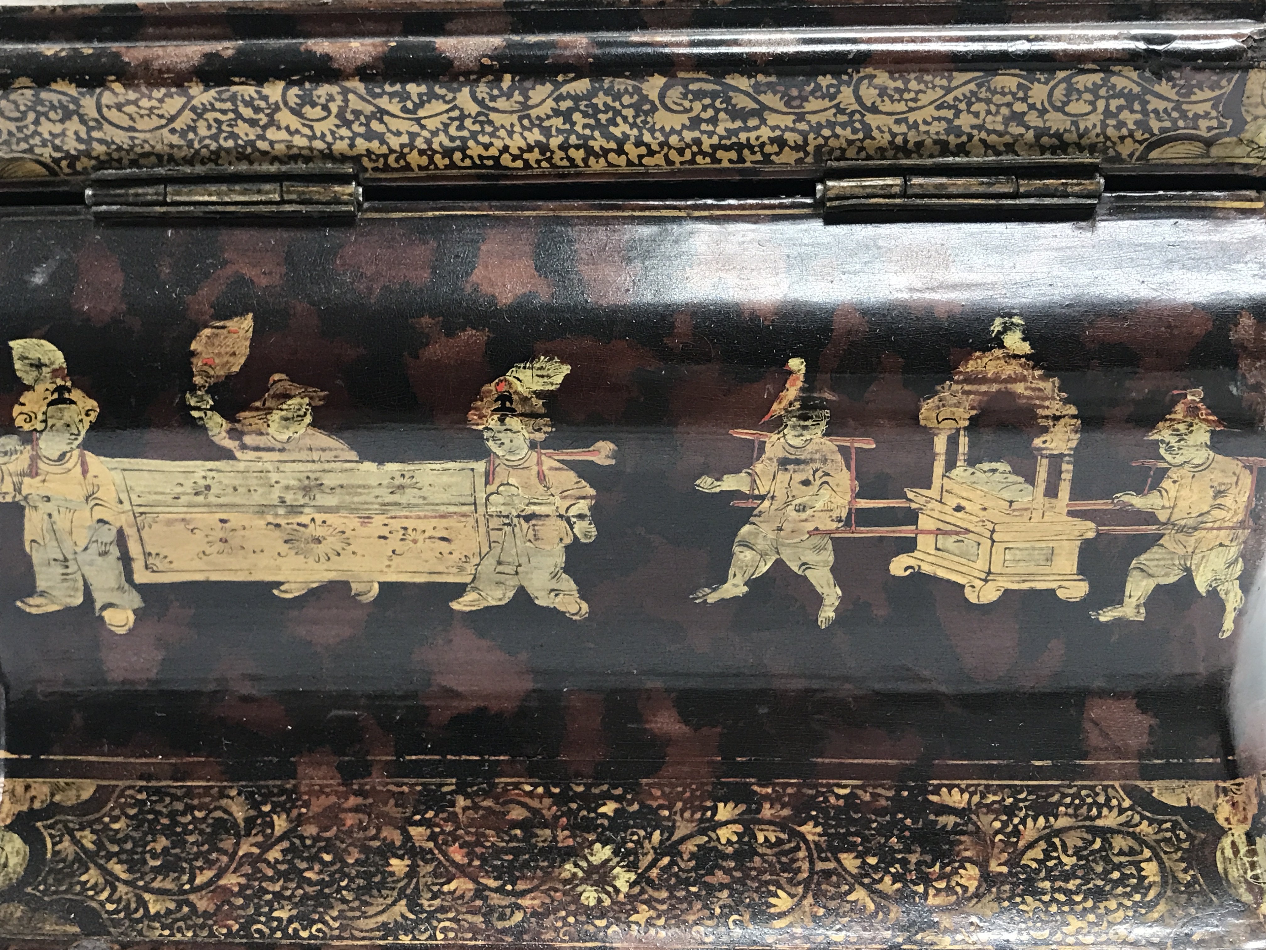 A Chinese black lacquer box with gilt decoration and dragon head feet, dimensions 25x19x16cm approximately. Postage category C