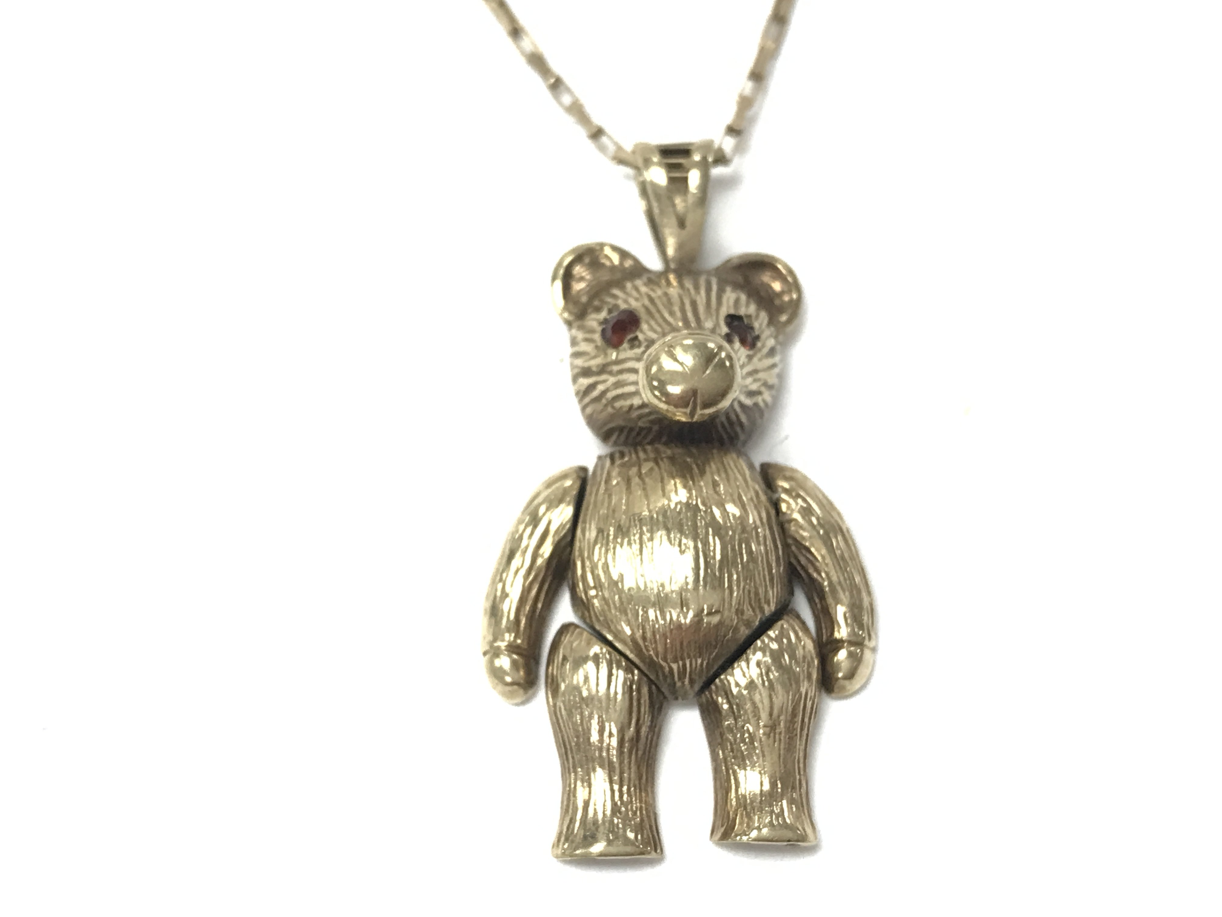 A 9ct gold teddy pendant with a 9ct gold chain. 8.35g Postage A