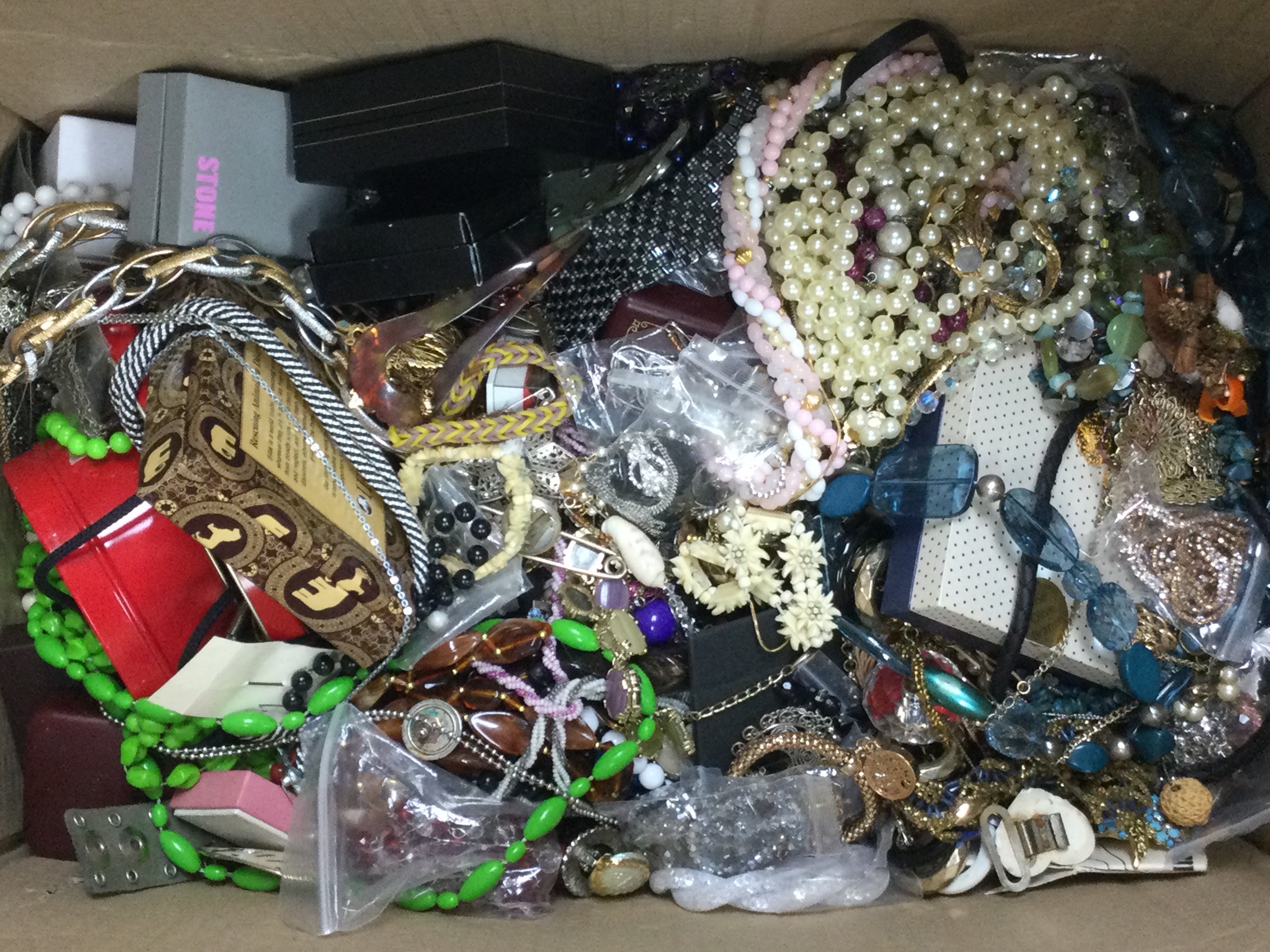 A large box of costume Jewellery including necklaces, bracelets etc . This lot cannot be posted