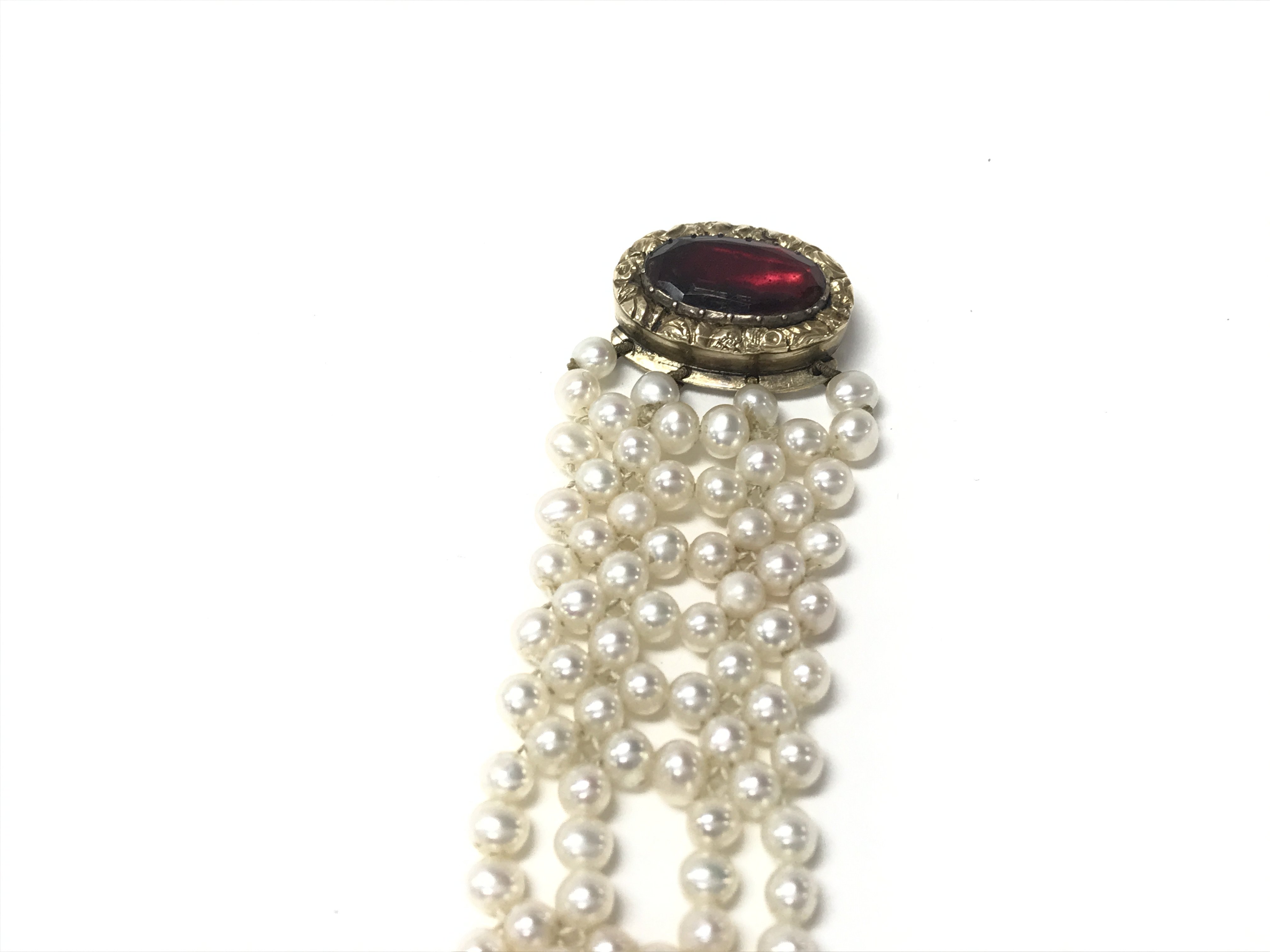 A cultured Pearl necklace with gold and garnet clasp. 39cm long. Postage A