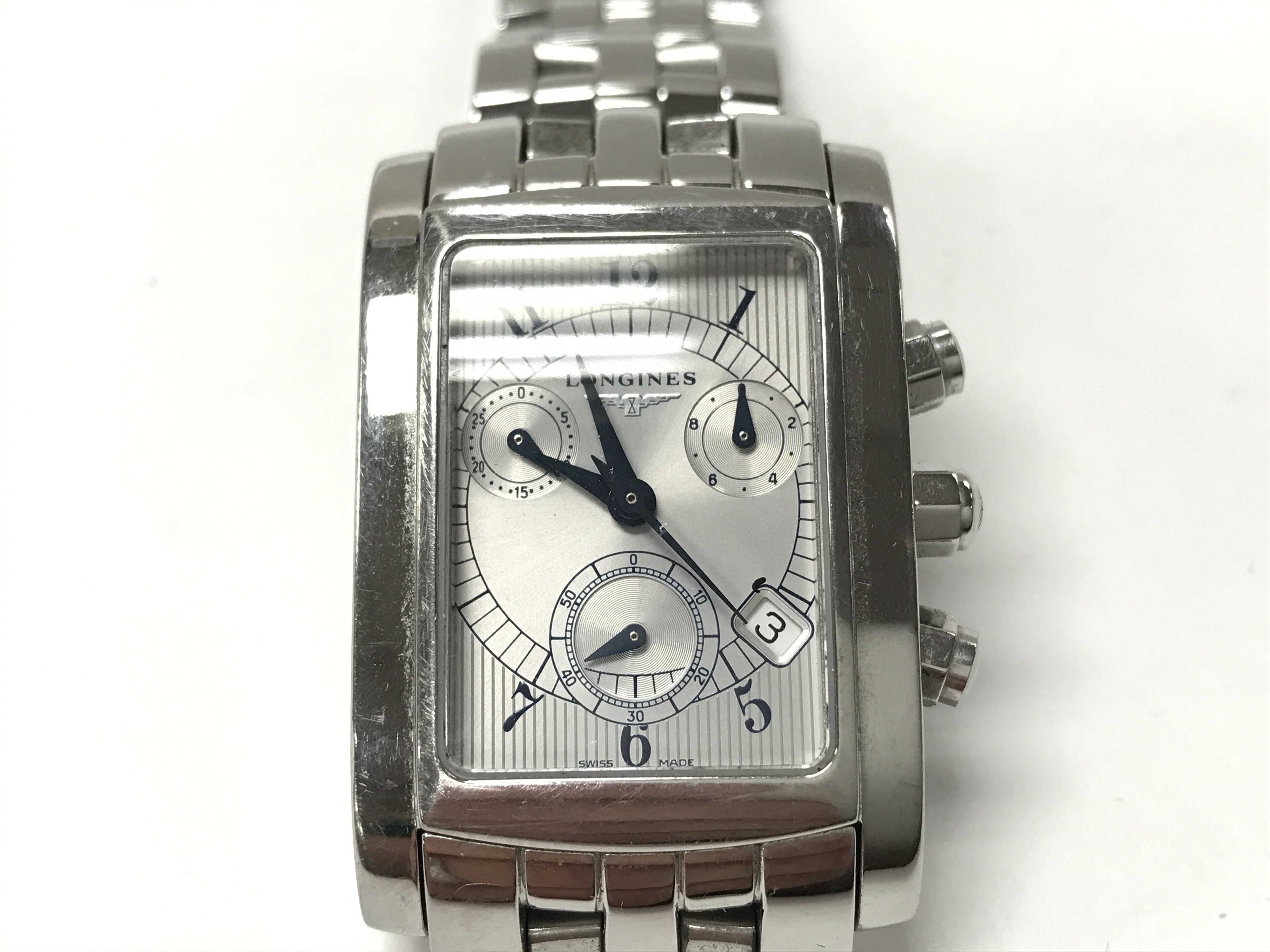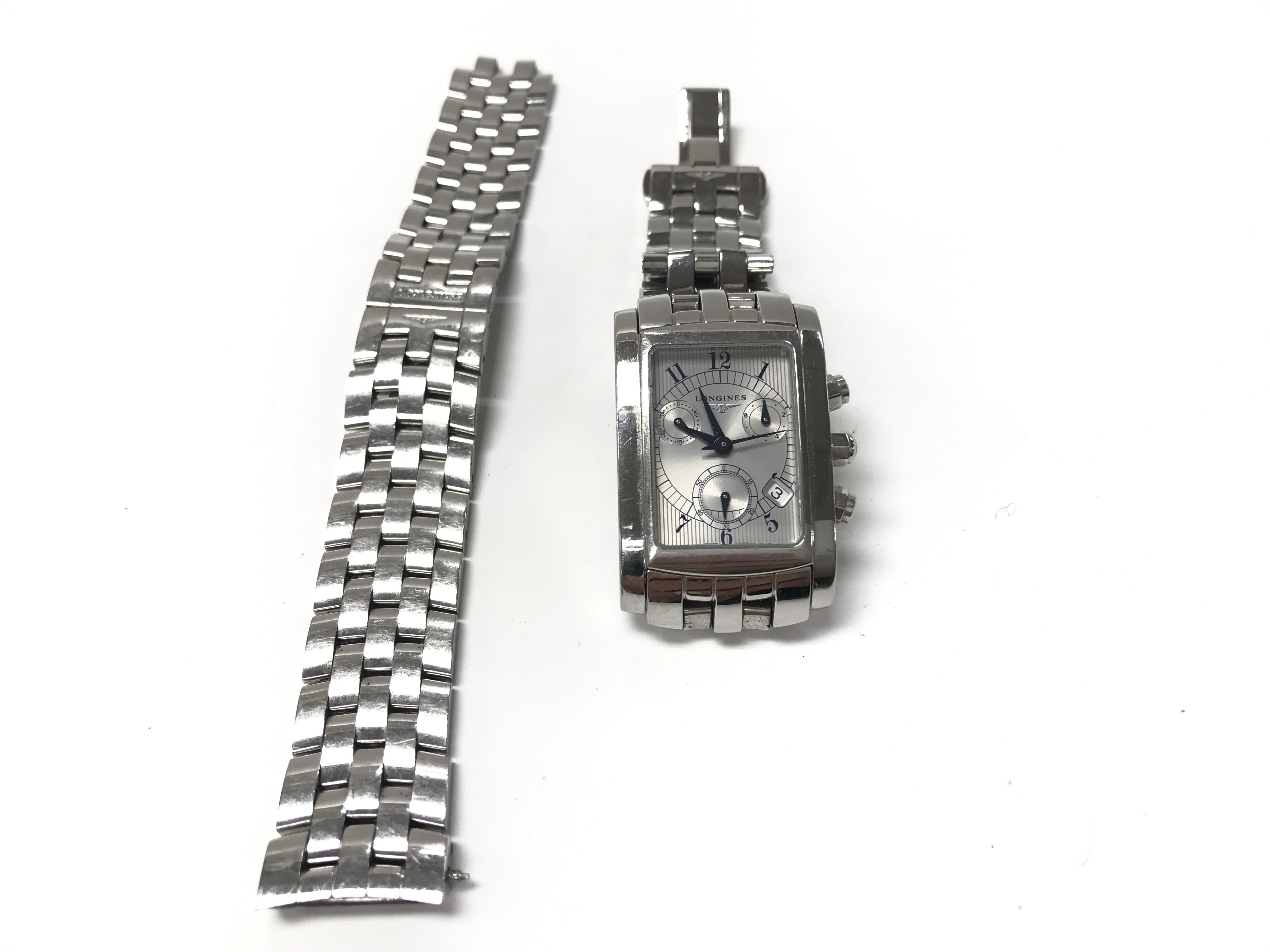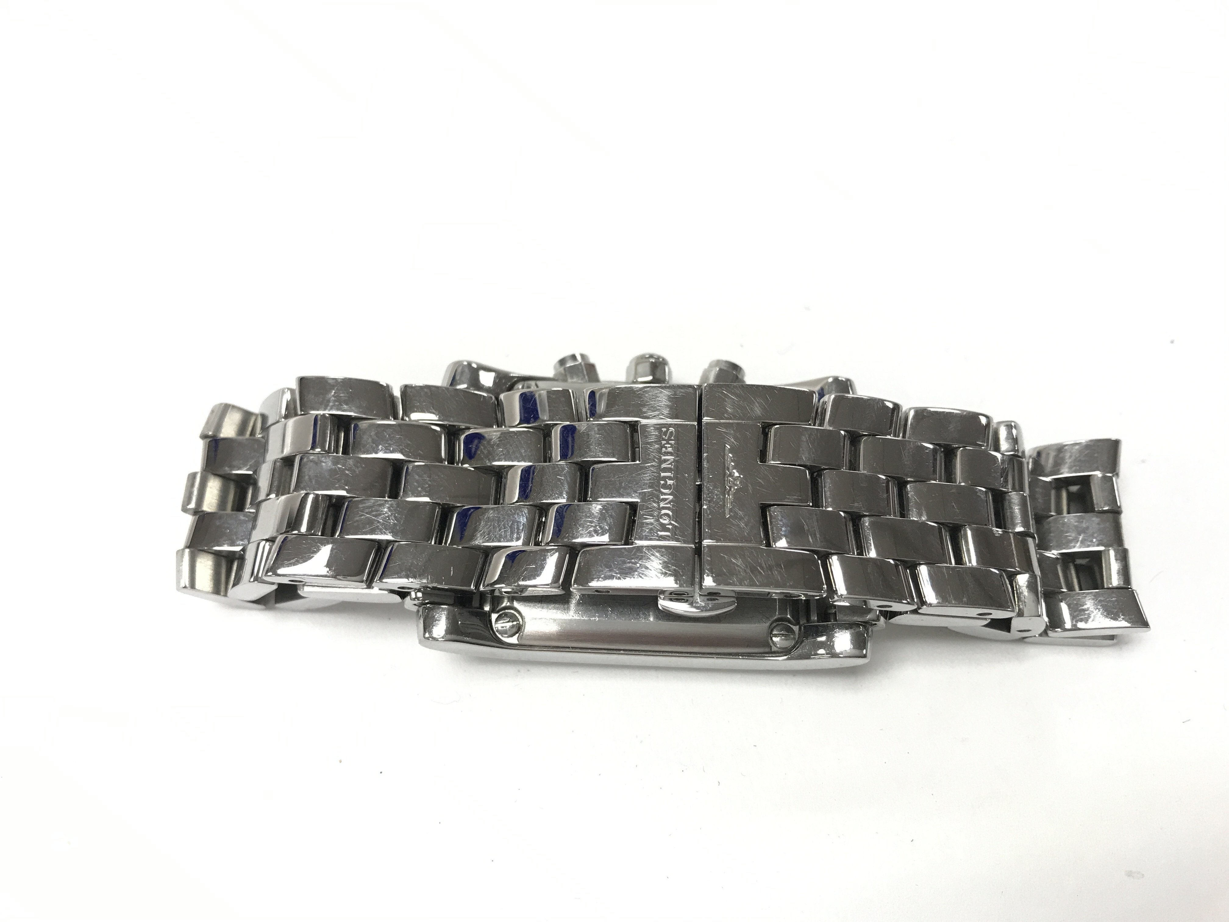 A gents Longines stainless steel chronograph calendar wrist watch. Running. Comes with spare strap. Postage B