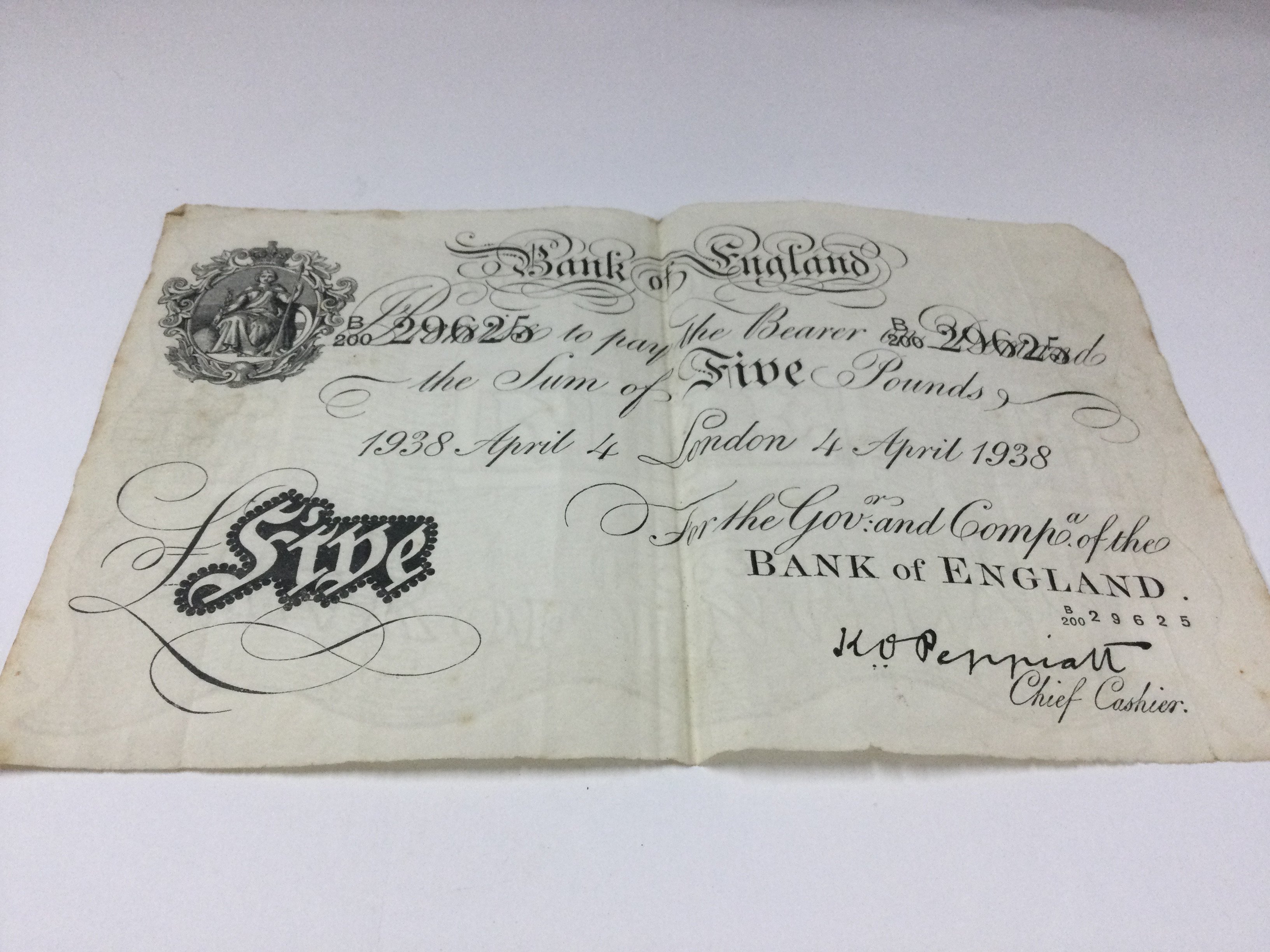 a collection of bank notes including a 1938 white five pound note.