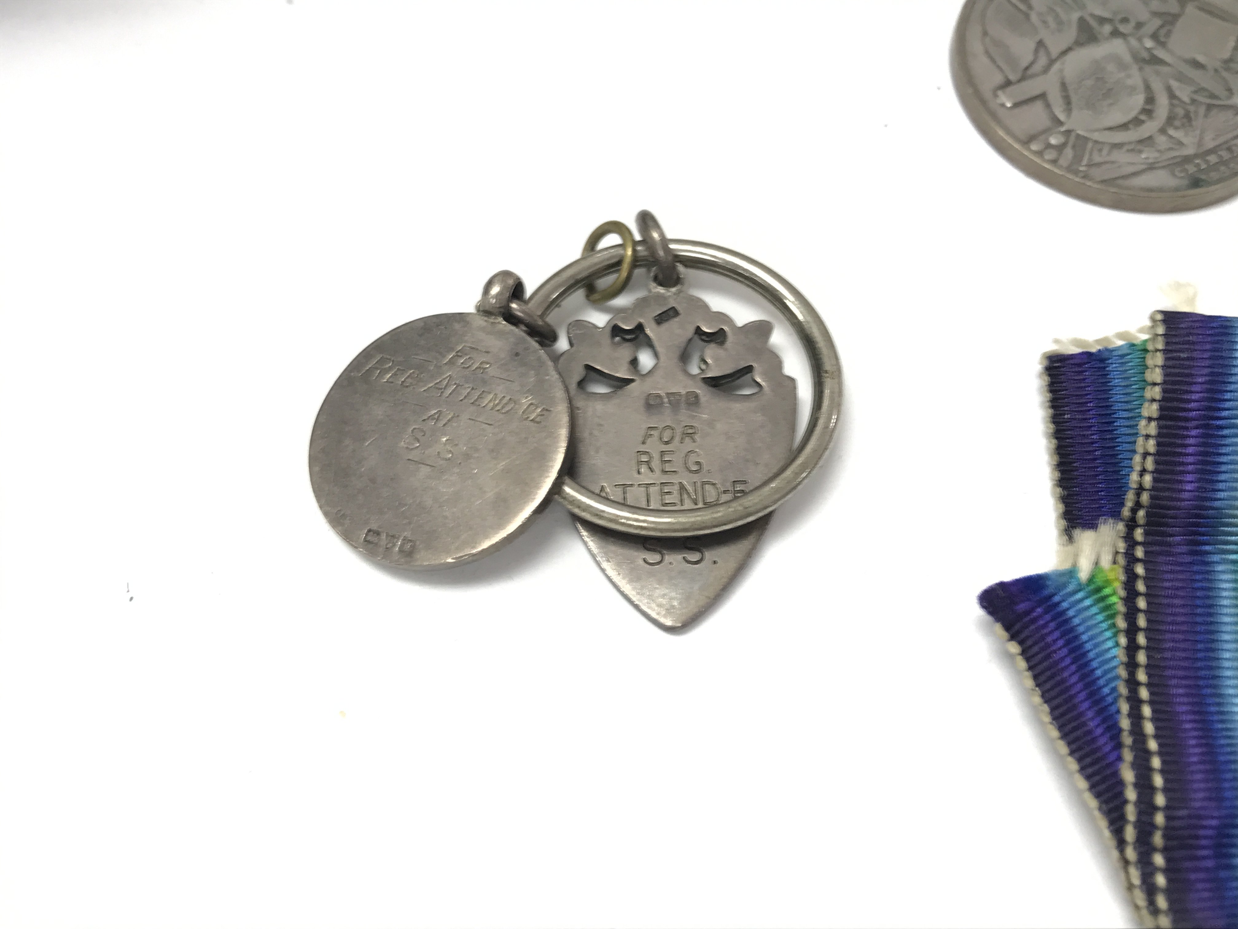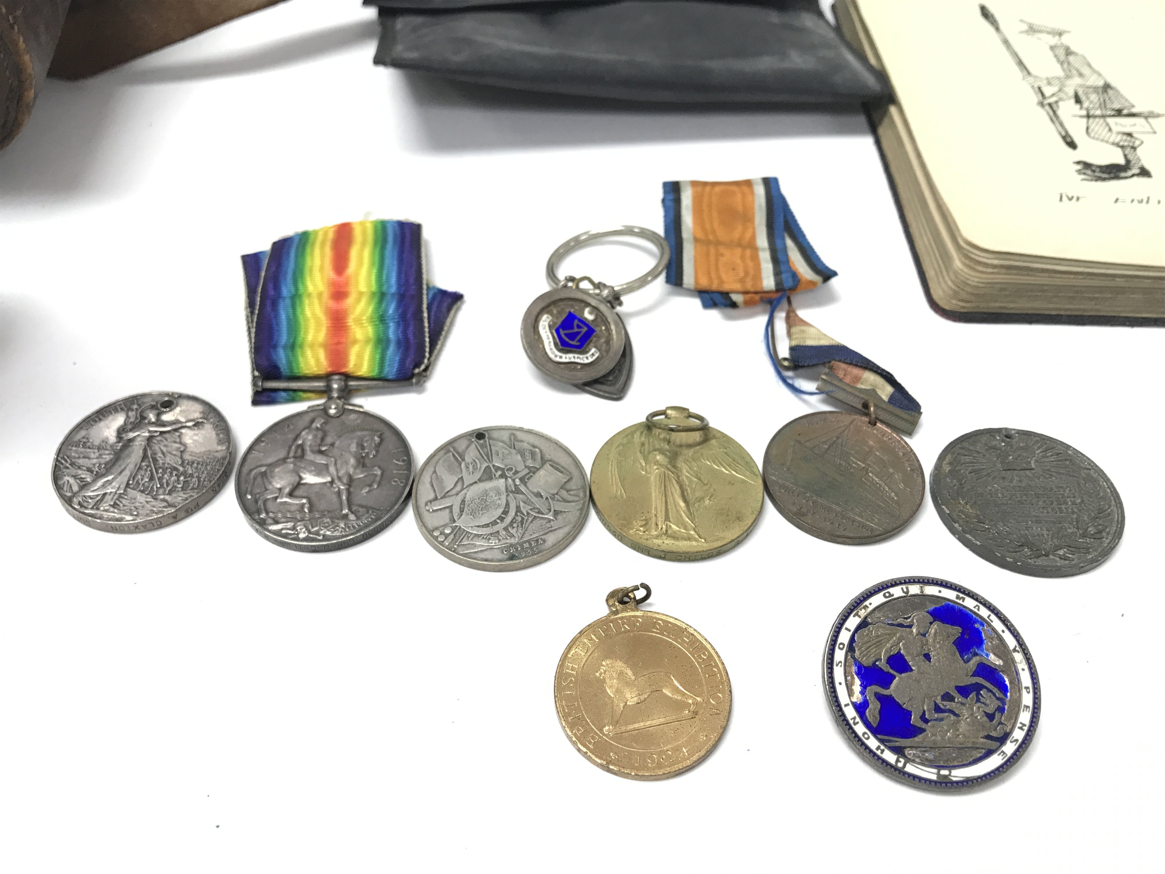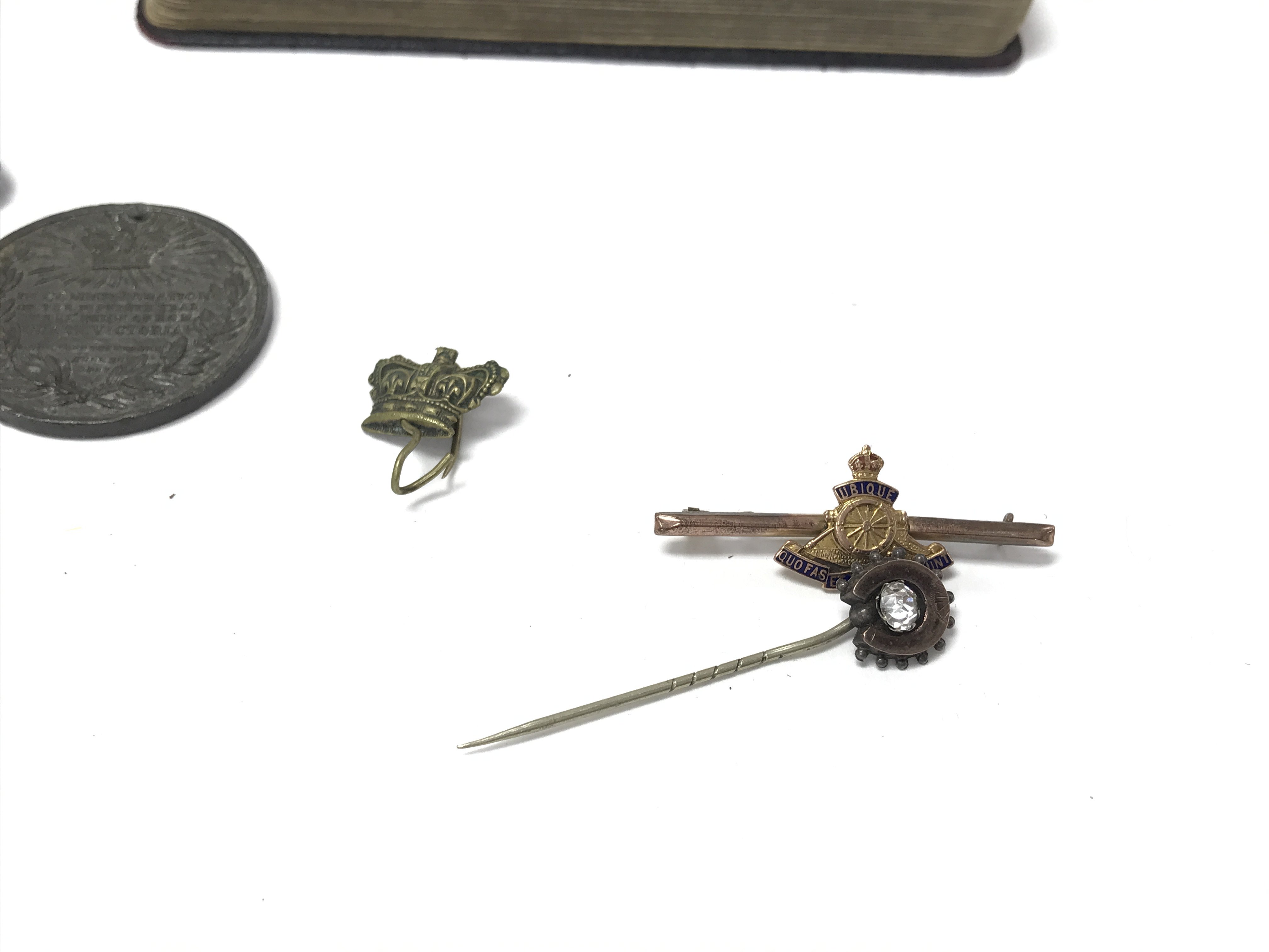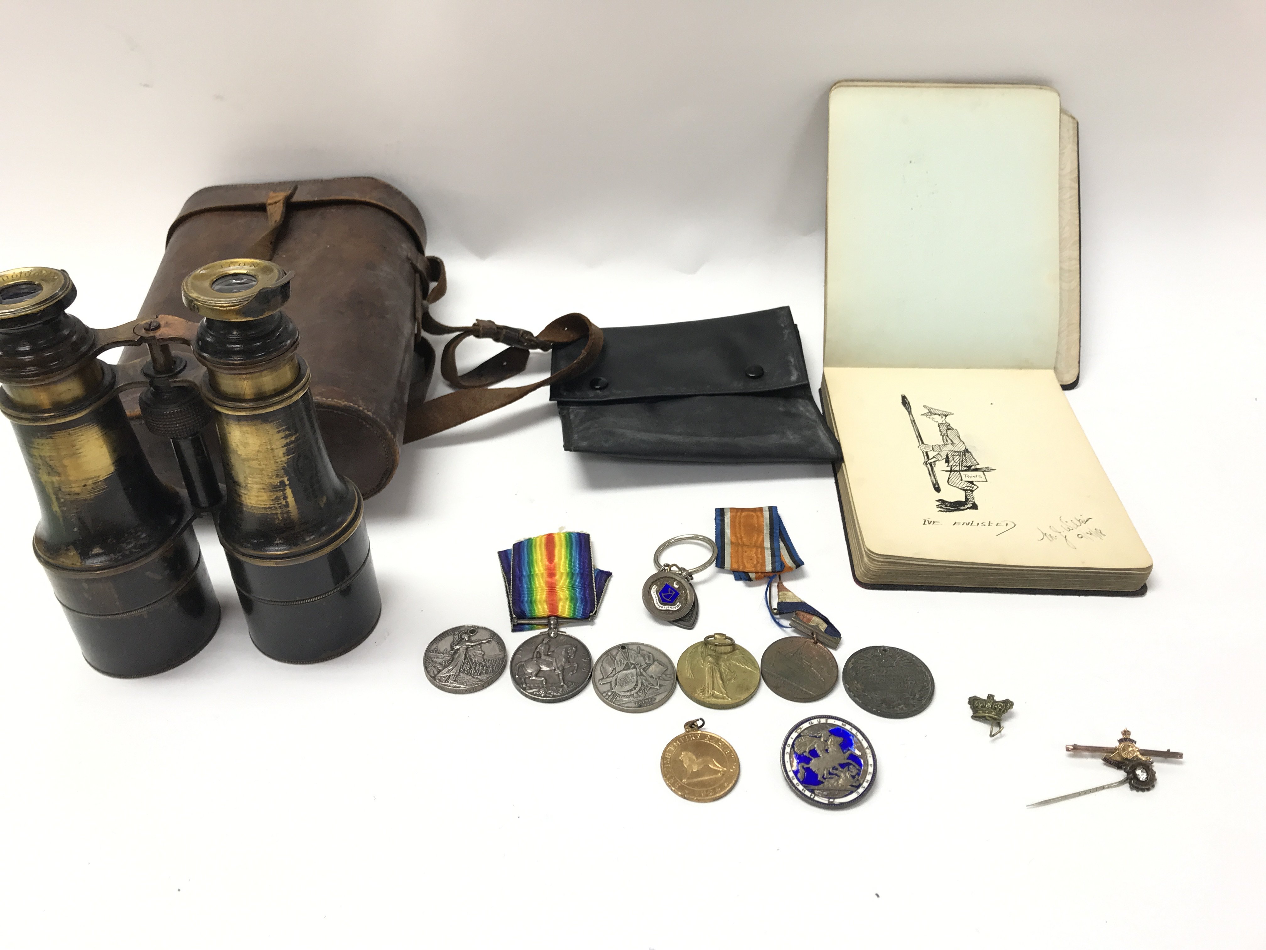 A collection of assorted medals and badges including a 9ct gold example. Lot including book with some hand sketches and also a set of binoculars. Postage B