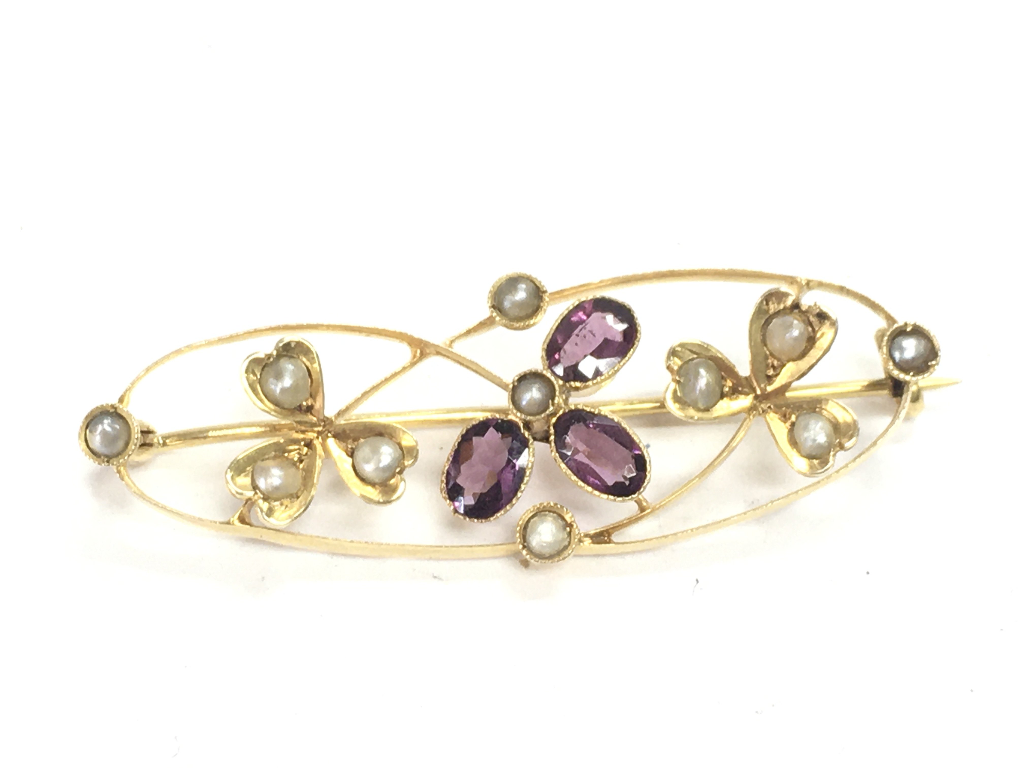 A 9ct gold edwardian seed pearl and amethyst brooch, 2g. Postage category a
