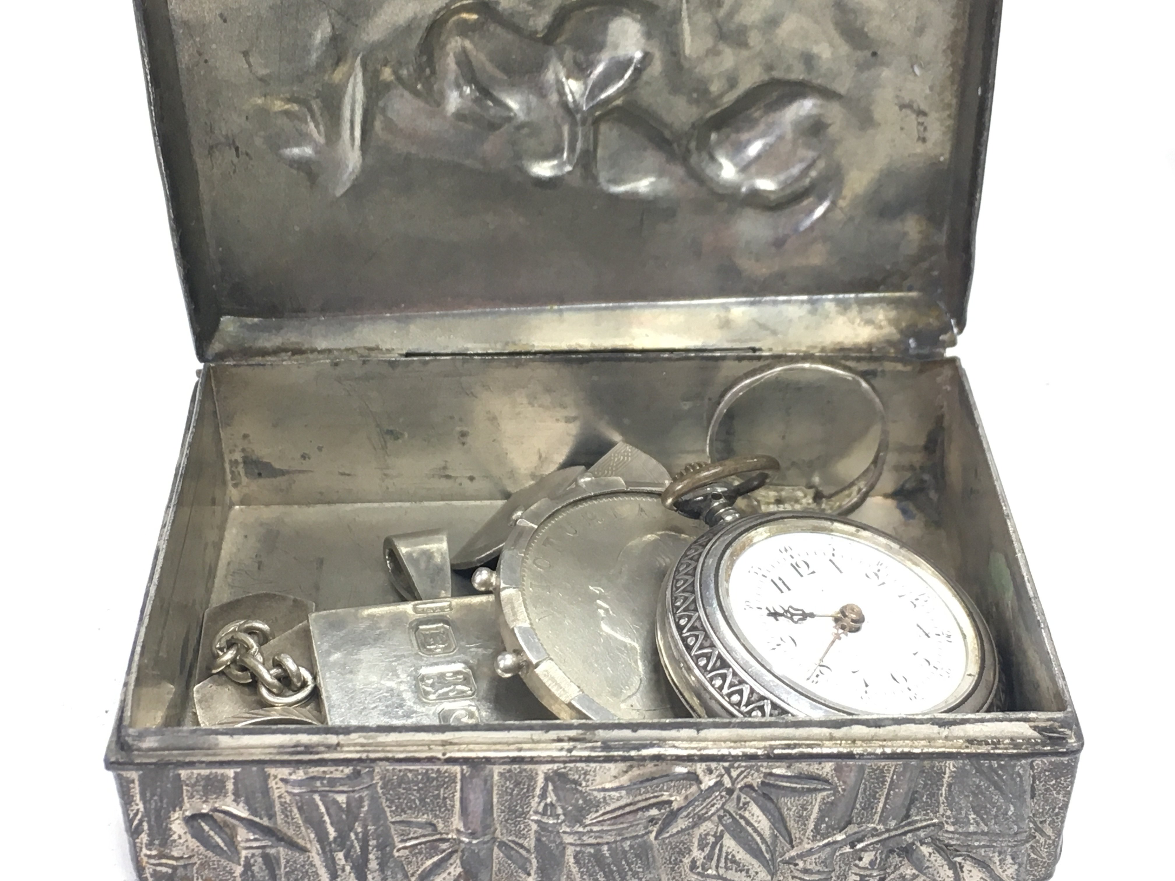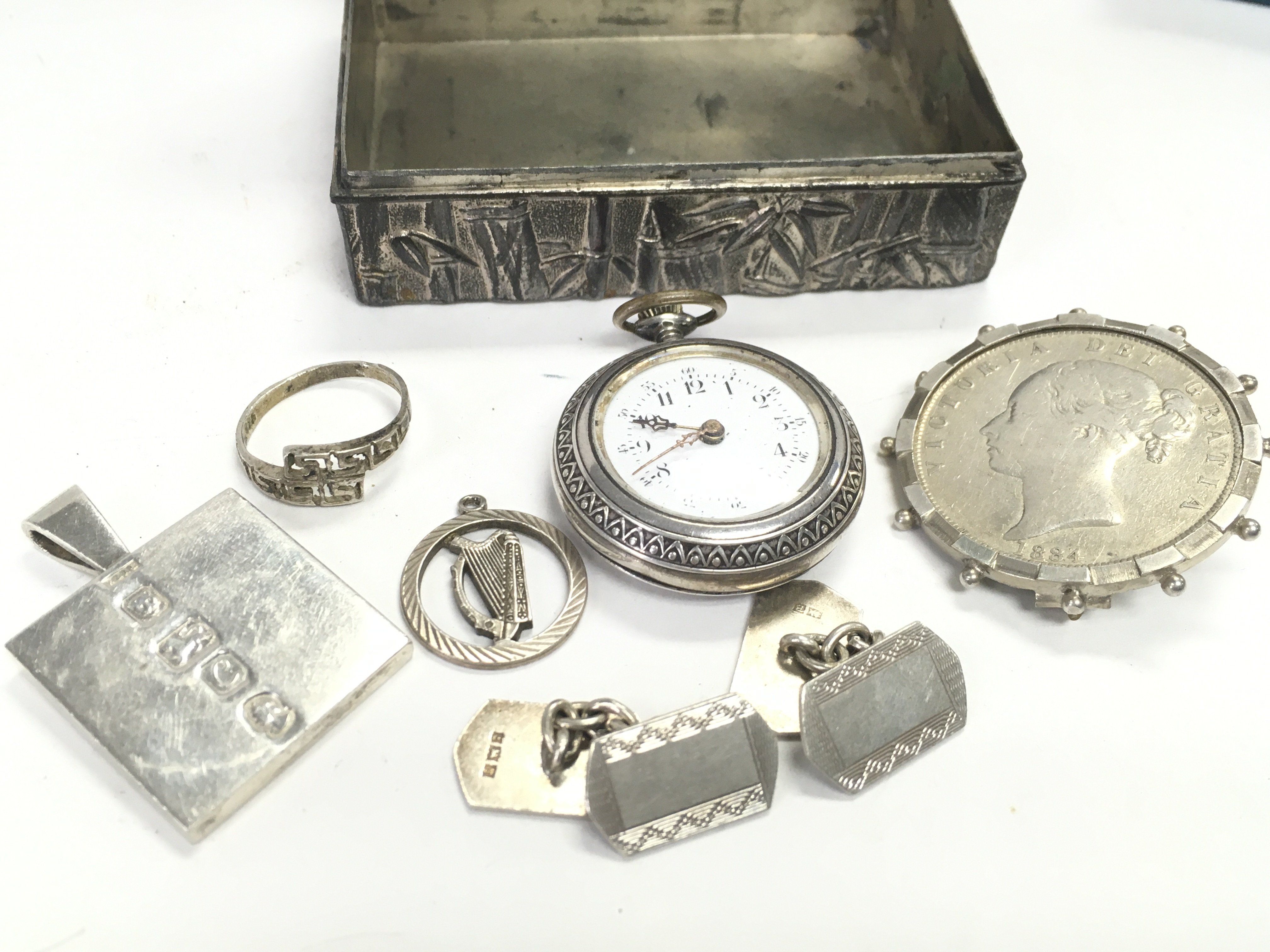 Mixed silver jewellery including pendants, cufflinks, a ring, Victoria silver coin etc with a Iris flower design box. Postage category a