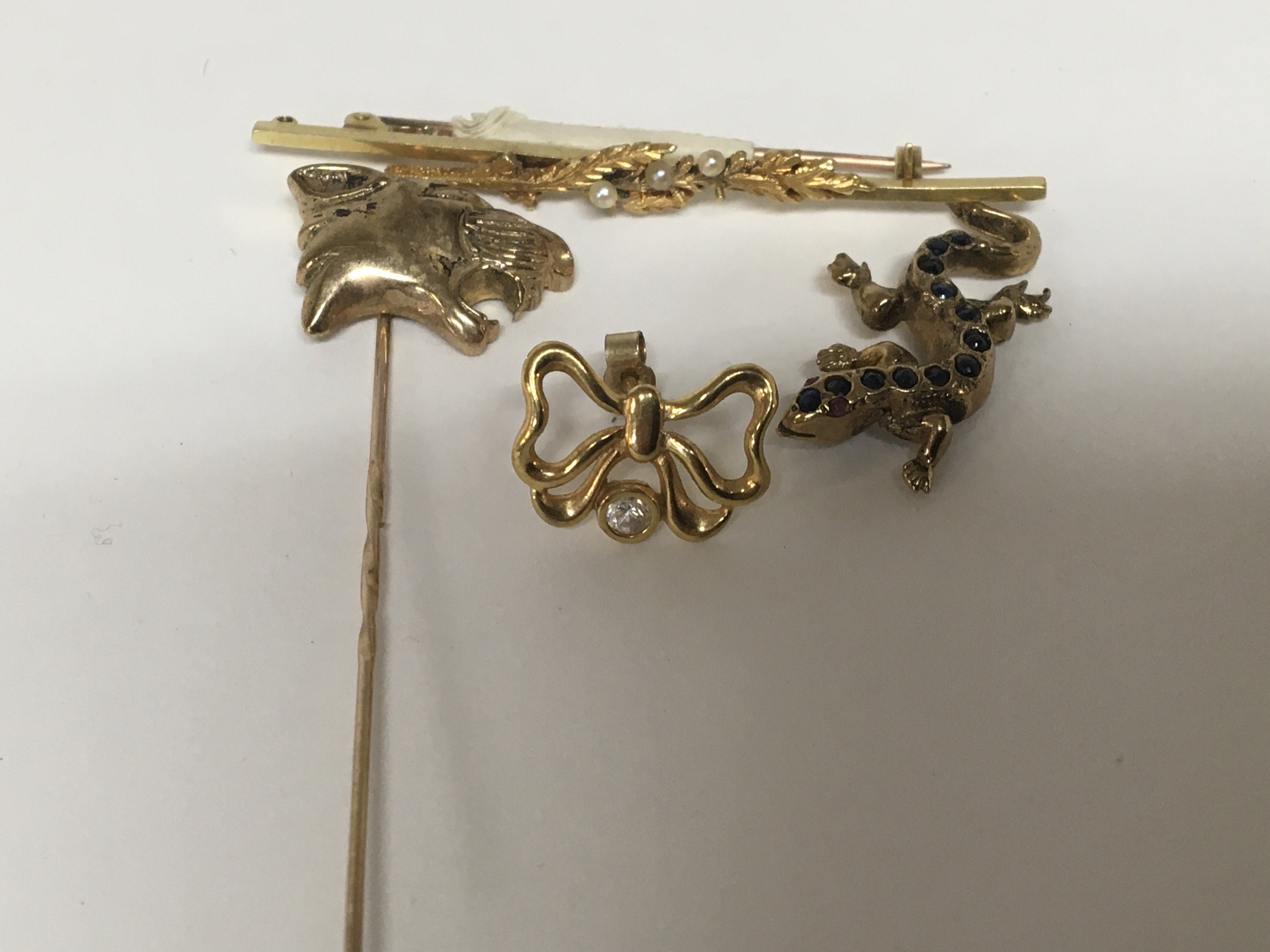 A 9carat gold stick pin a stone set 9carat gold lizard pendent gold earring and a gold brooch weight 10g (4)