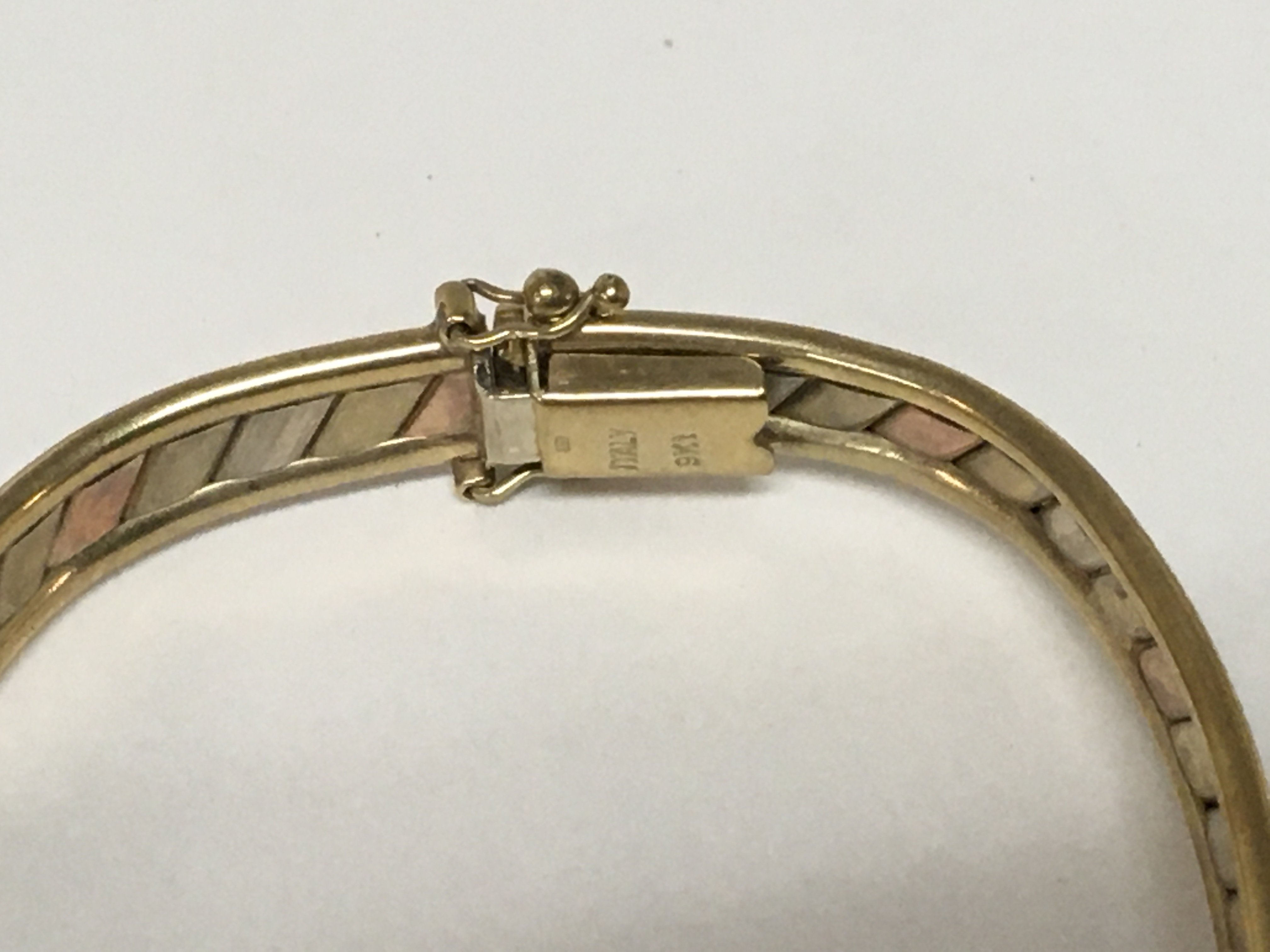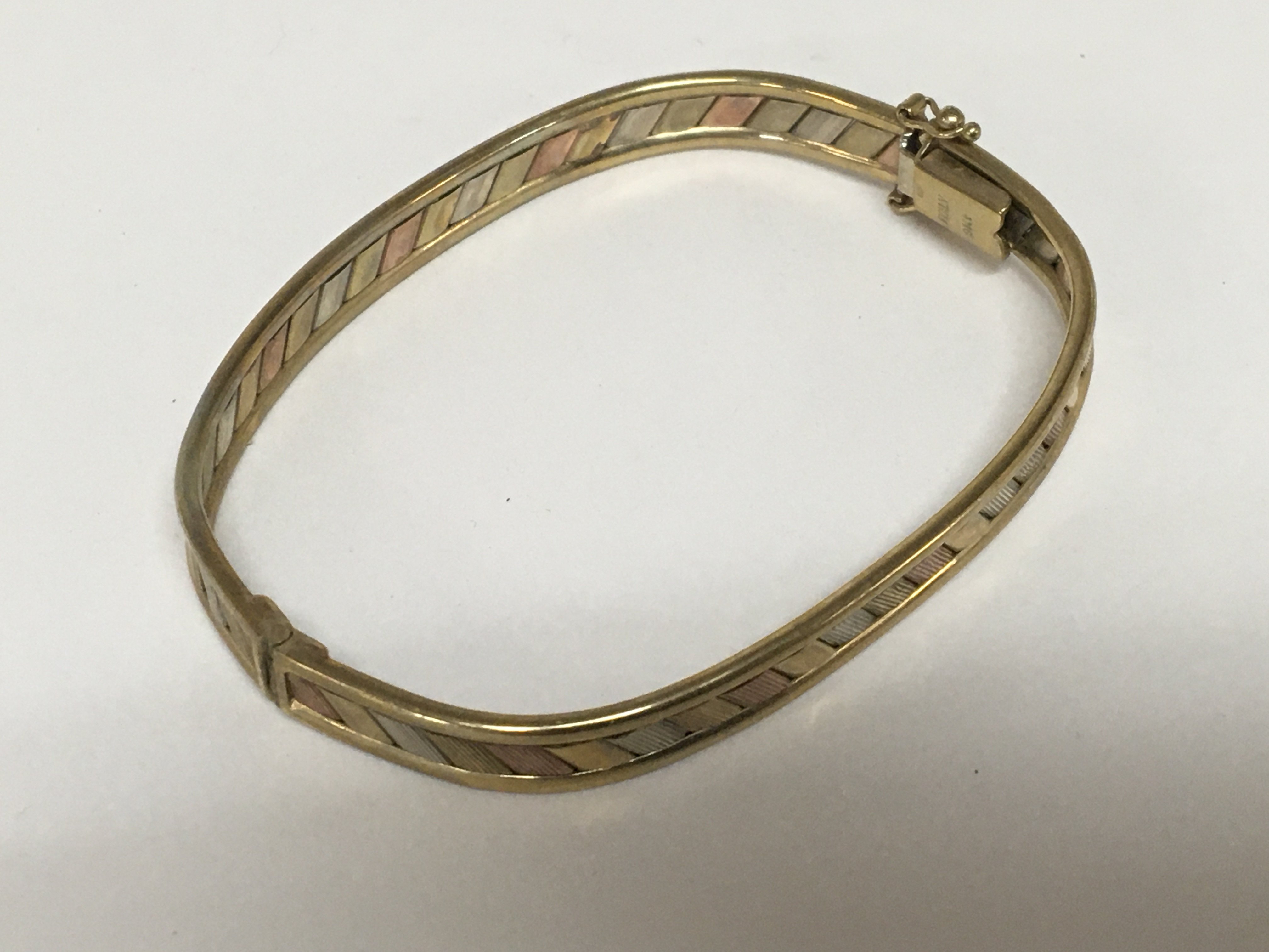 A 9carat gold tri-colour bangle. Weight 10.5g.