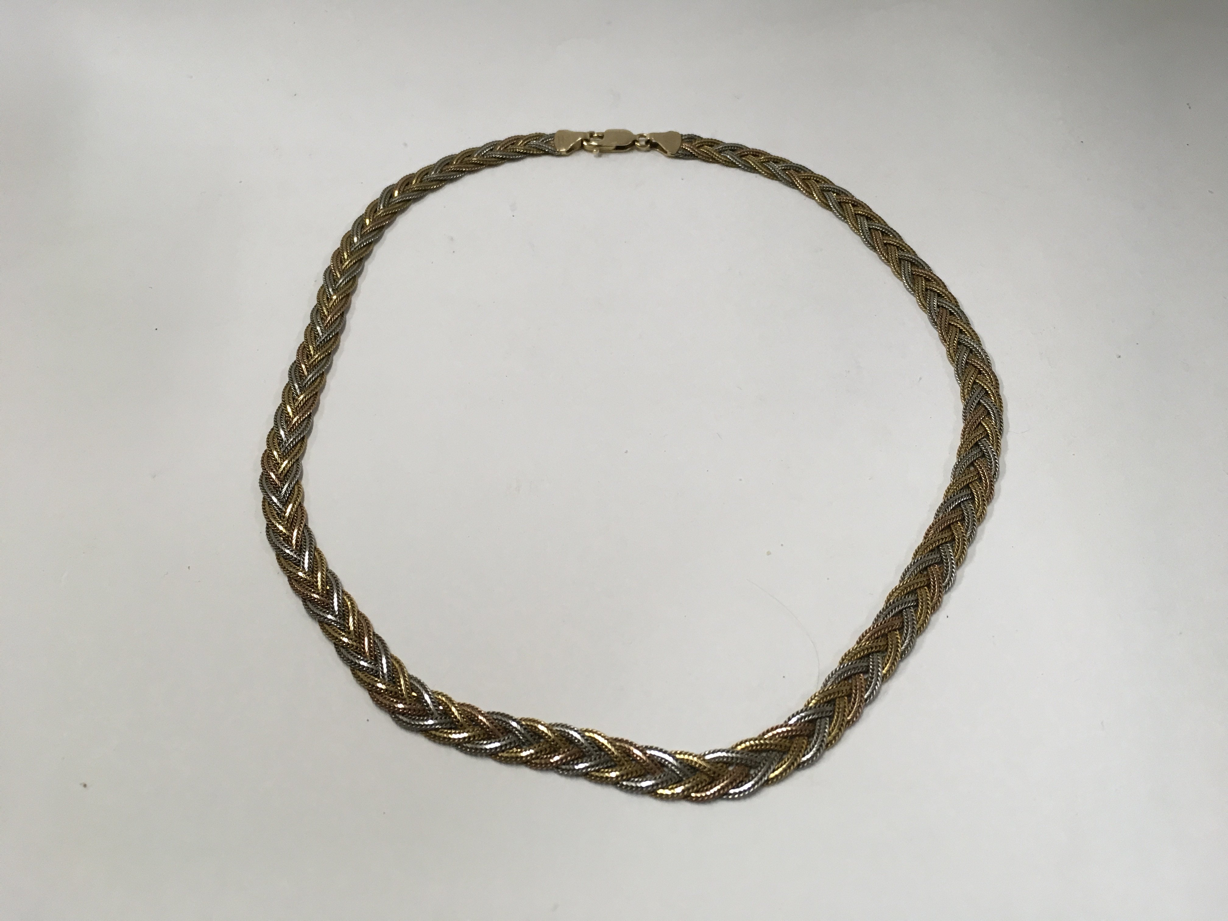 A three coloured 14ct gold necklace. Approx weight 19.3 grams.