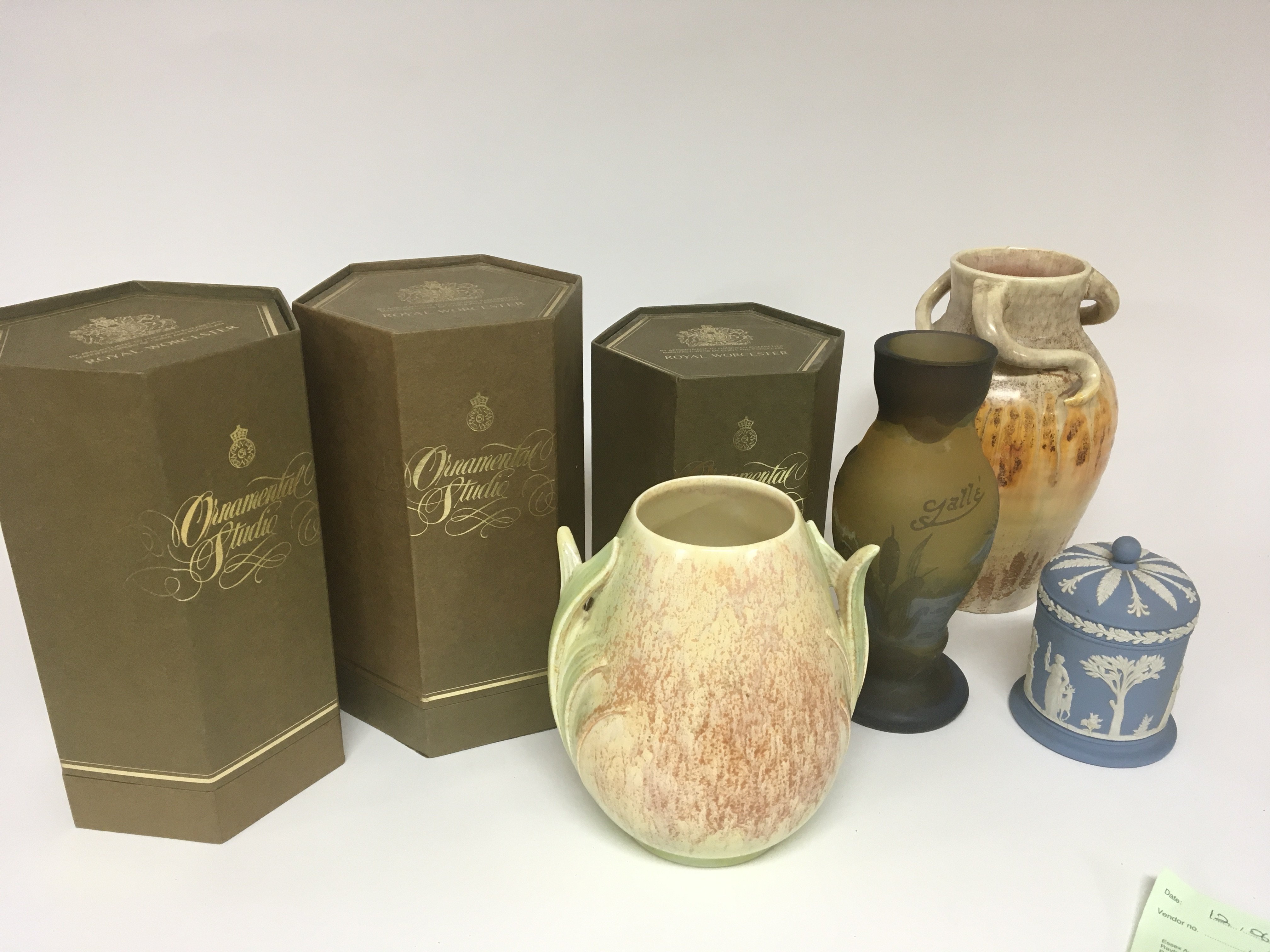 Three boxed Royal Worcester Ornamental Studio ceramic and metal bird ornaments in fitted boxes A copy Galle vase Art Deco design art pottery and a Wedgwood jar and cover.