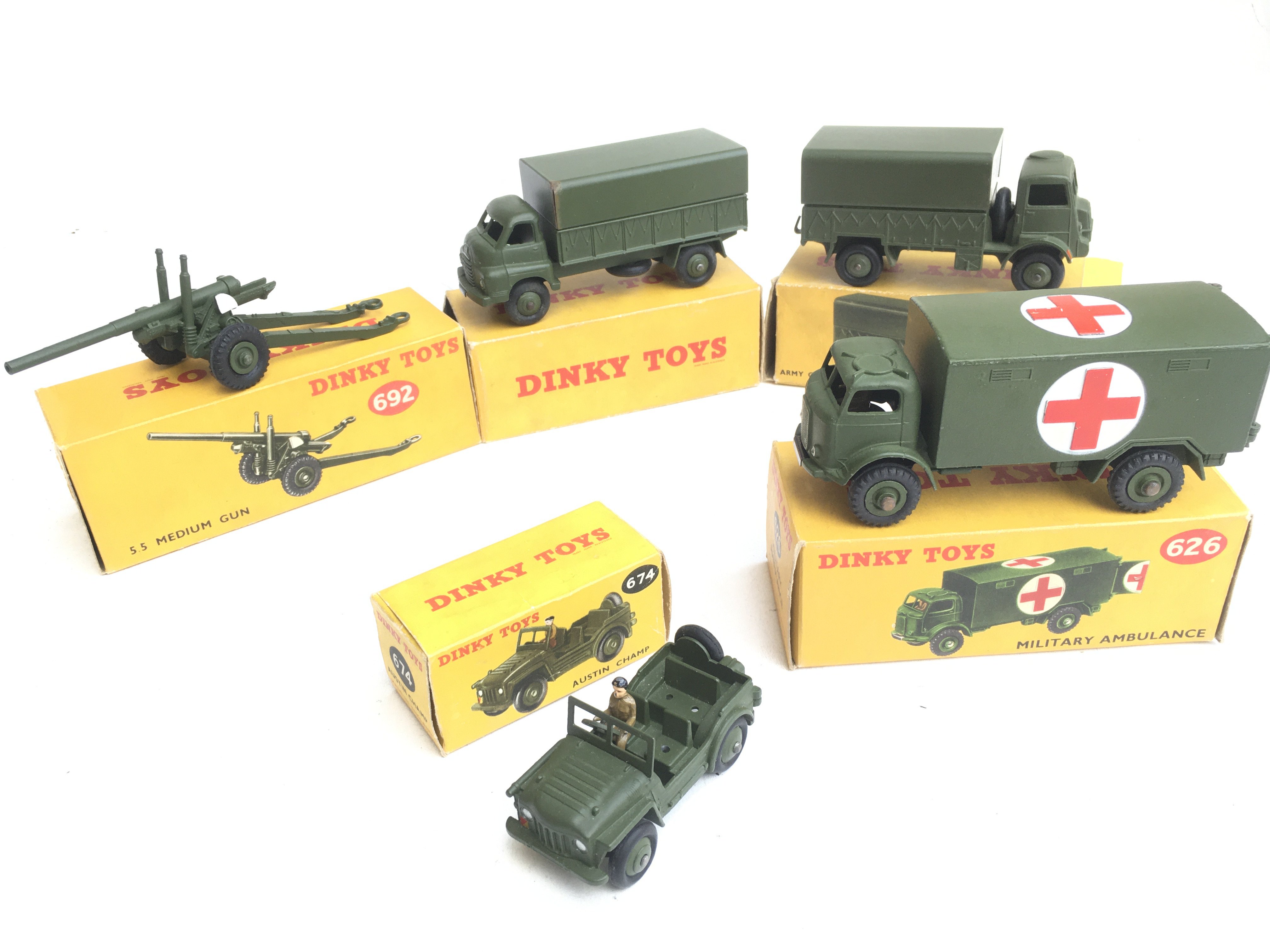 5 X Boxed Dinky Toys all Military. Including a 5.5 Medium Gun. A Military Ambulance. Etc.