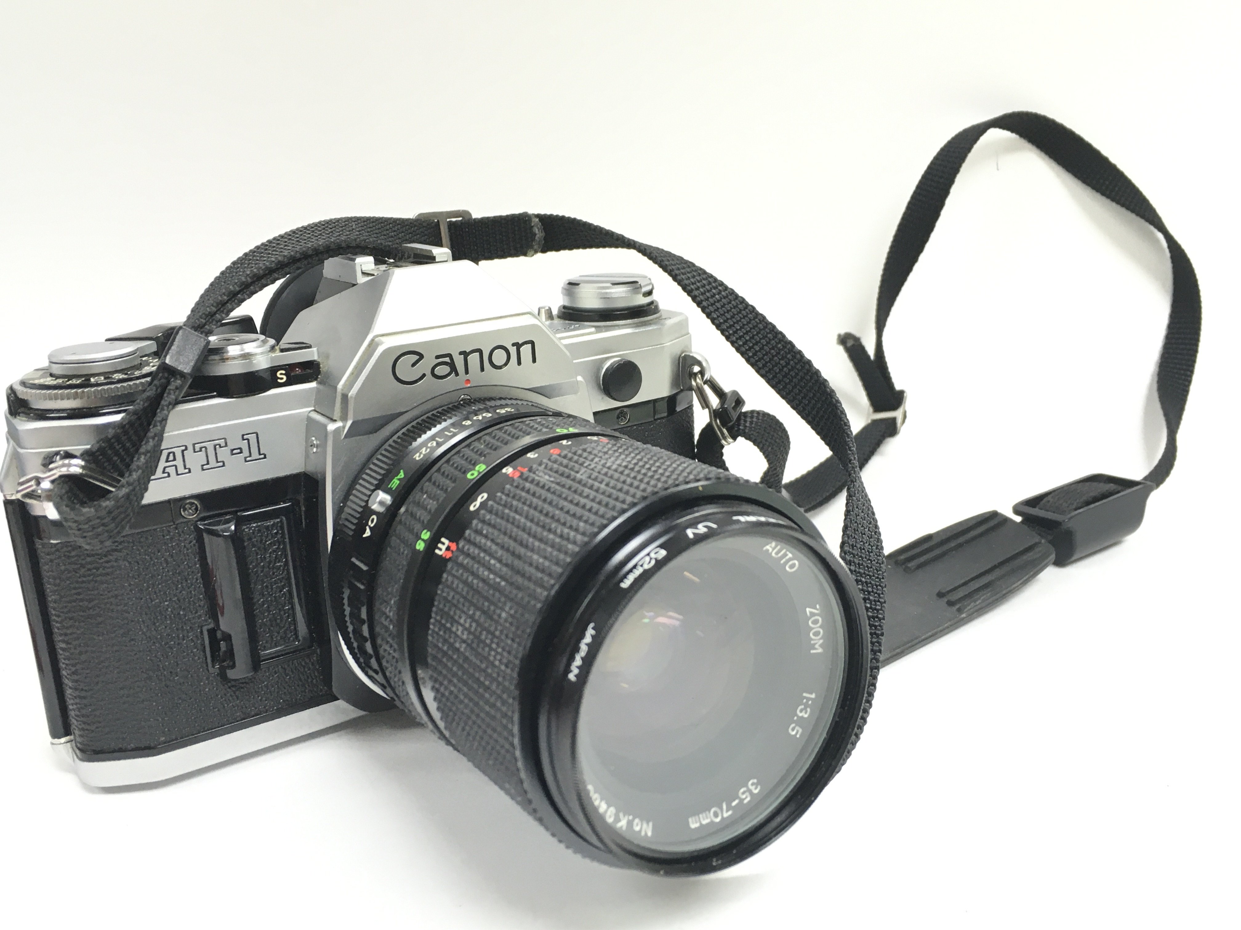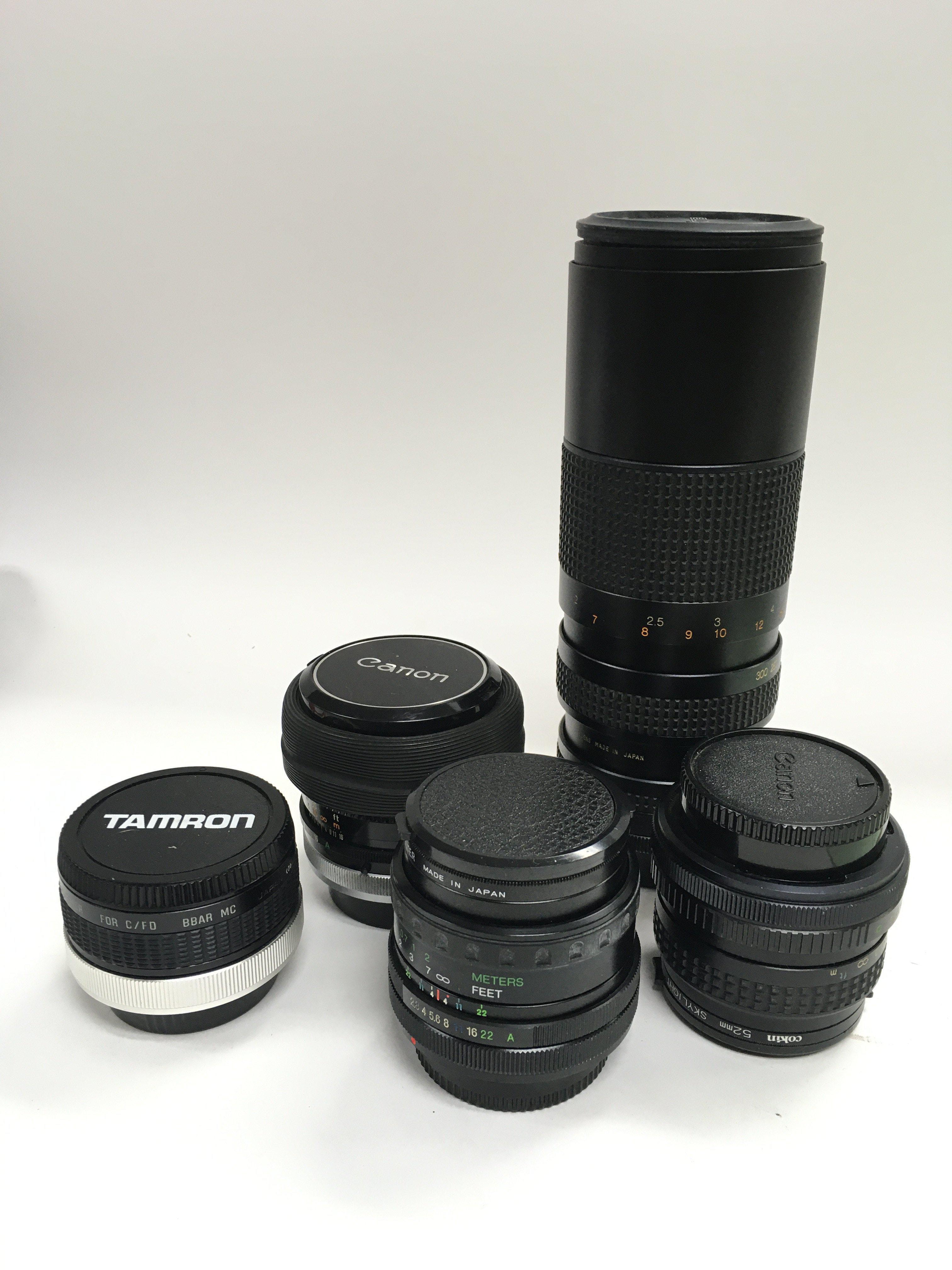 A Canon AT-1 camera and a collection of lenses including rmc tokina 100-300mm, Canon FD50mm, Vivitar 24mm, Tokina 24mm etc. Postage category C