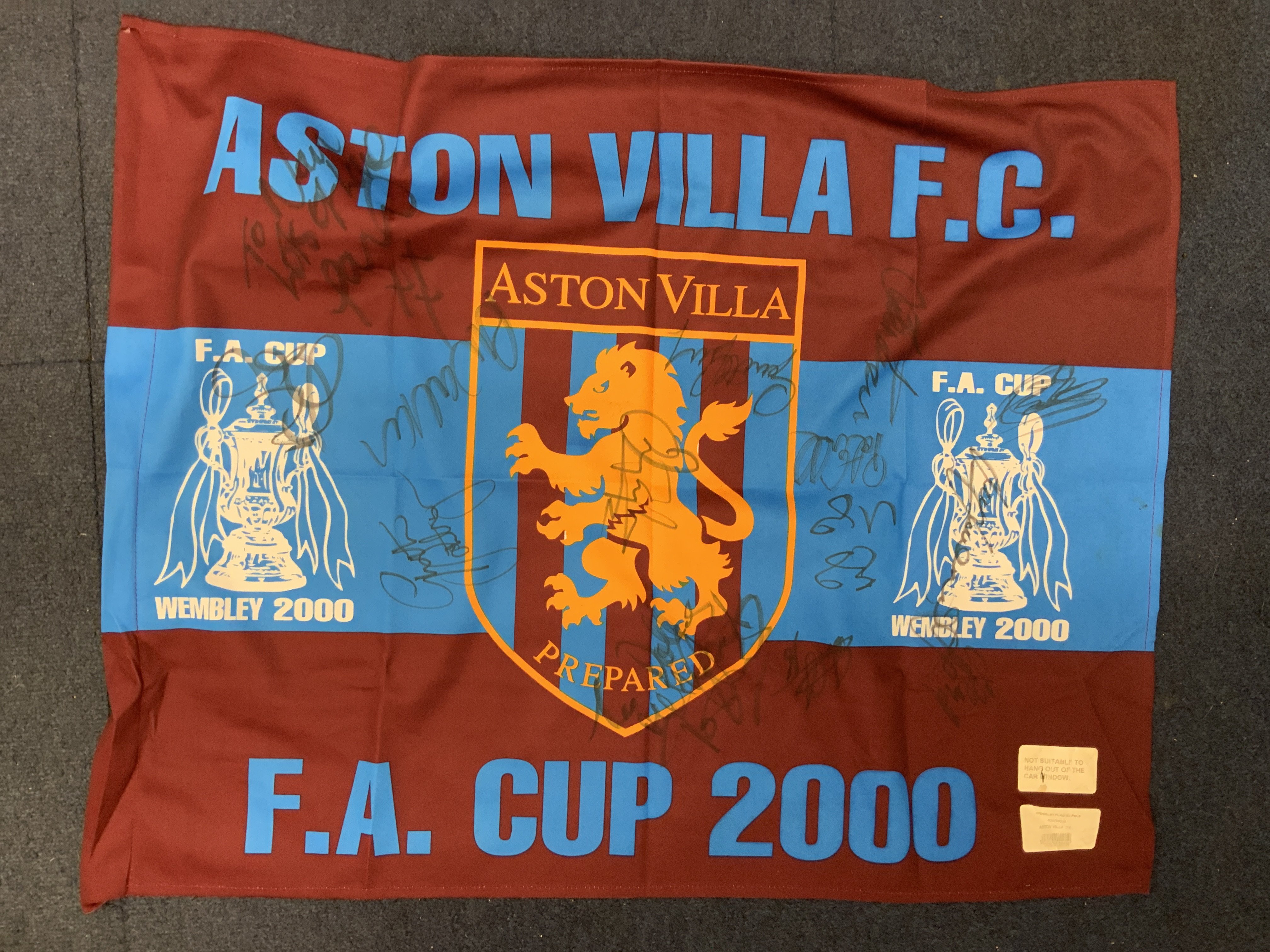 Aston Villa 2000 FA Cup Final Signed Football Flag: Dedication lots of love from Paul (Merson). A further undedicated 13 autographs to include Ehiogu and Southgate. Former property of Paul Merson. Measures 29 x 22 inches.