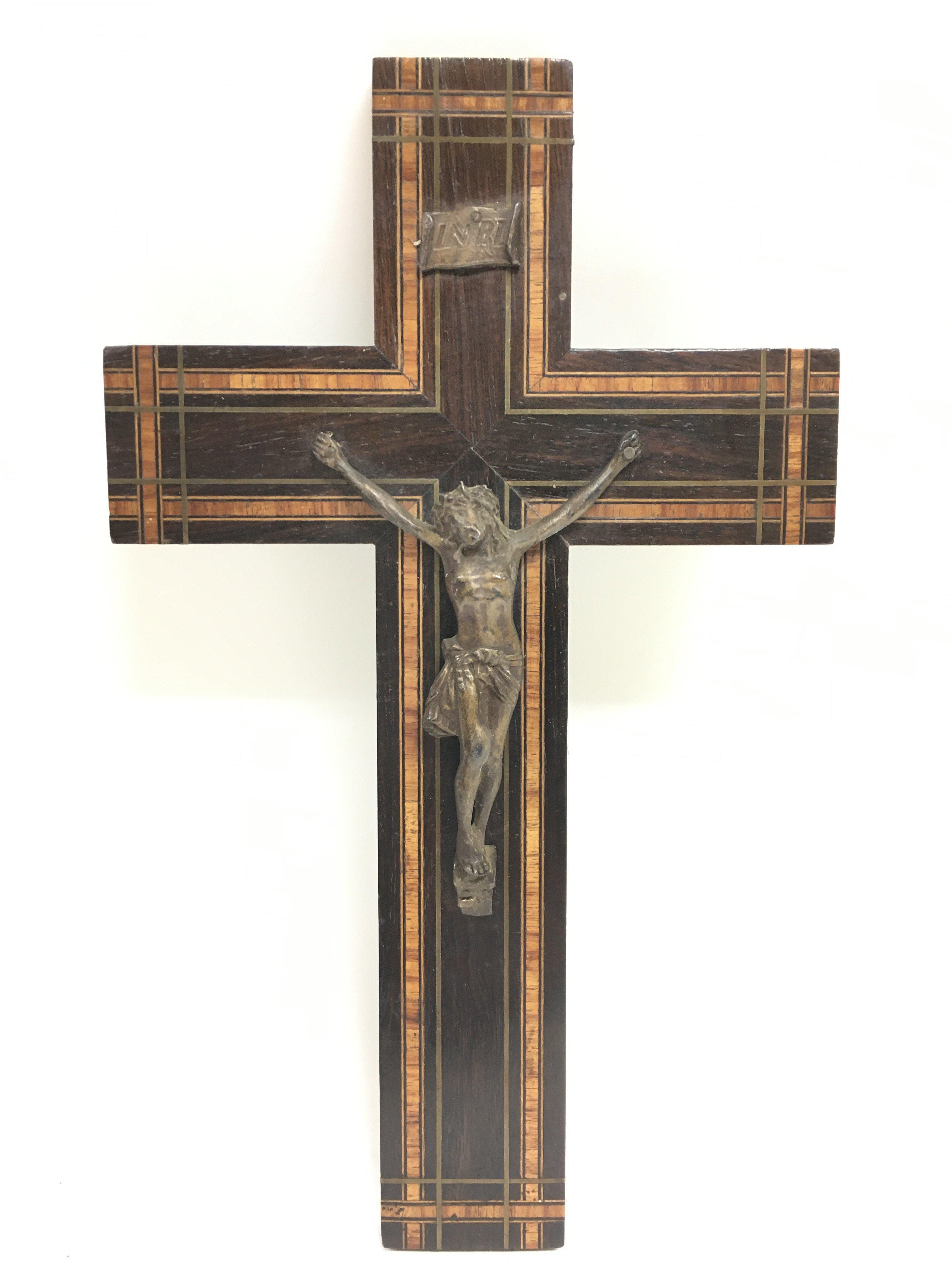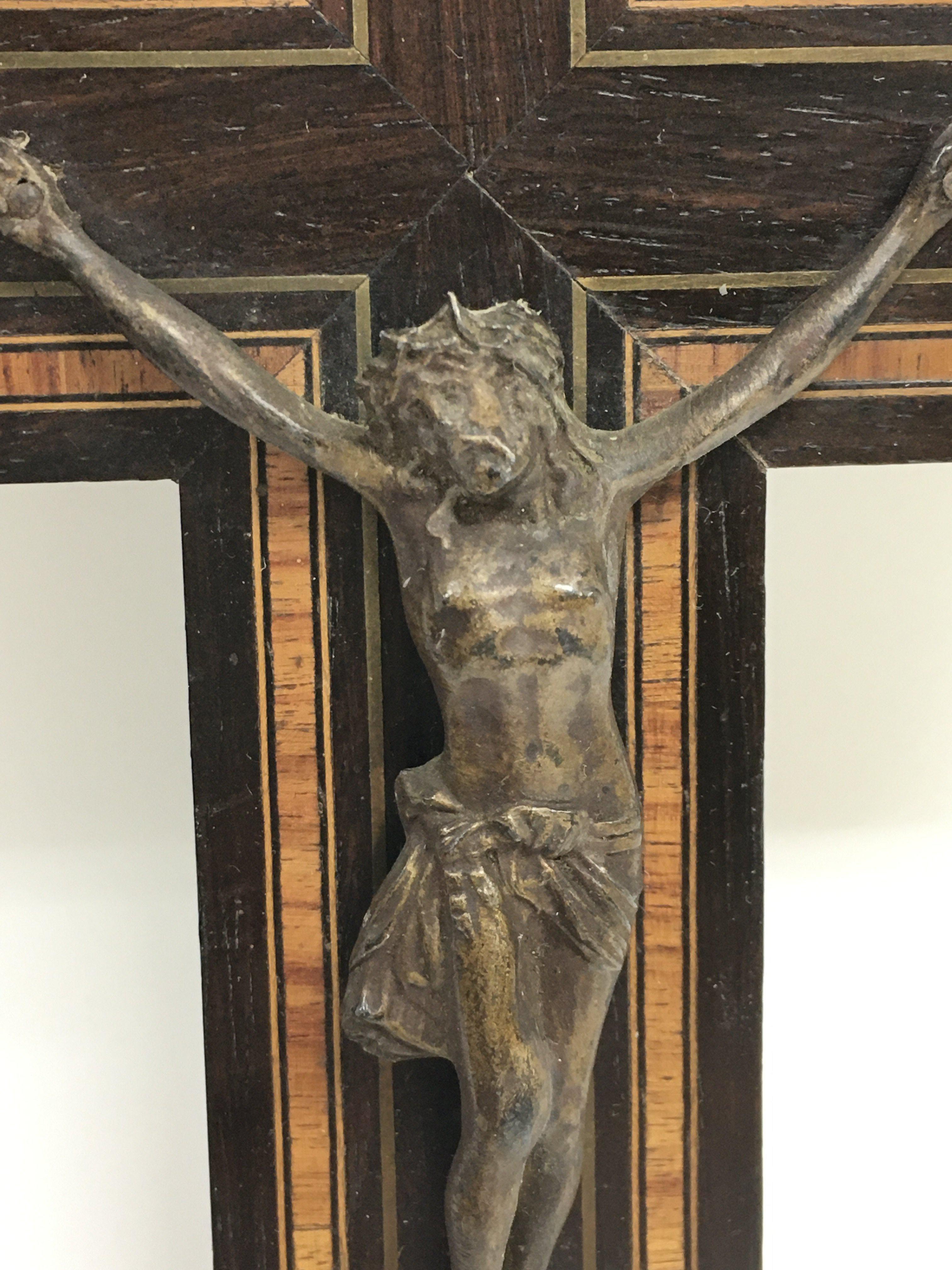 A crucifix inlaid wooden cross with a bronze figure of christ, dimensions approximately 25x15cm. Postage category C
