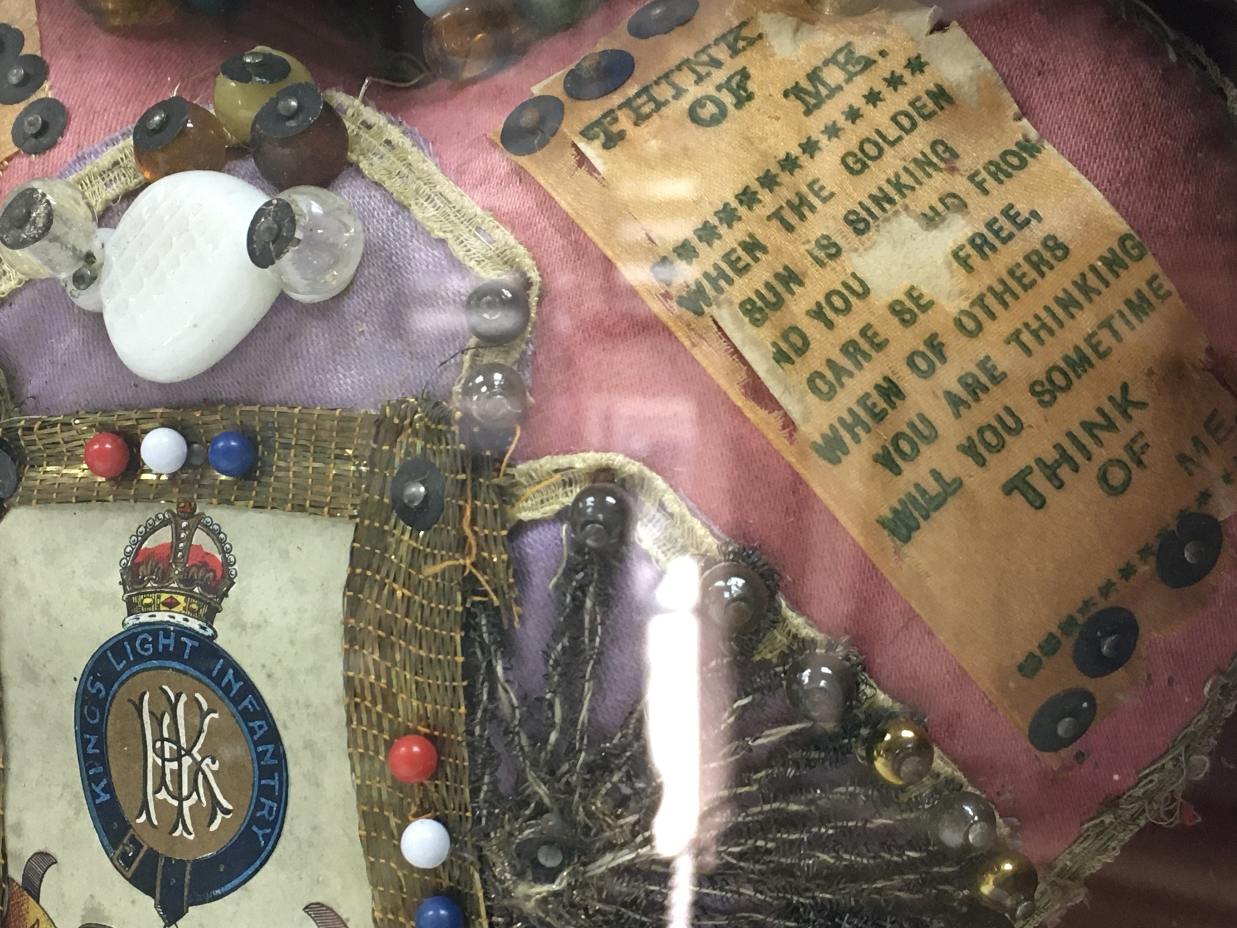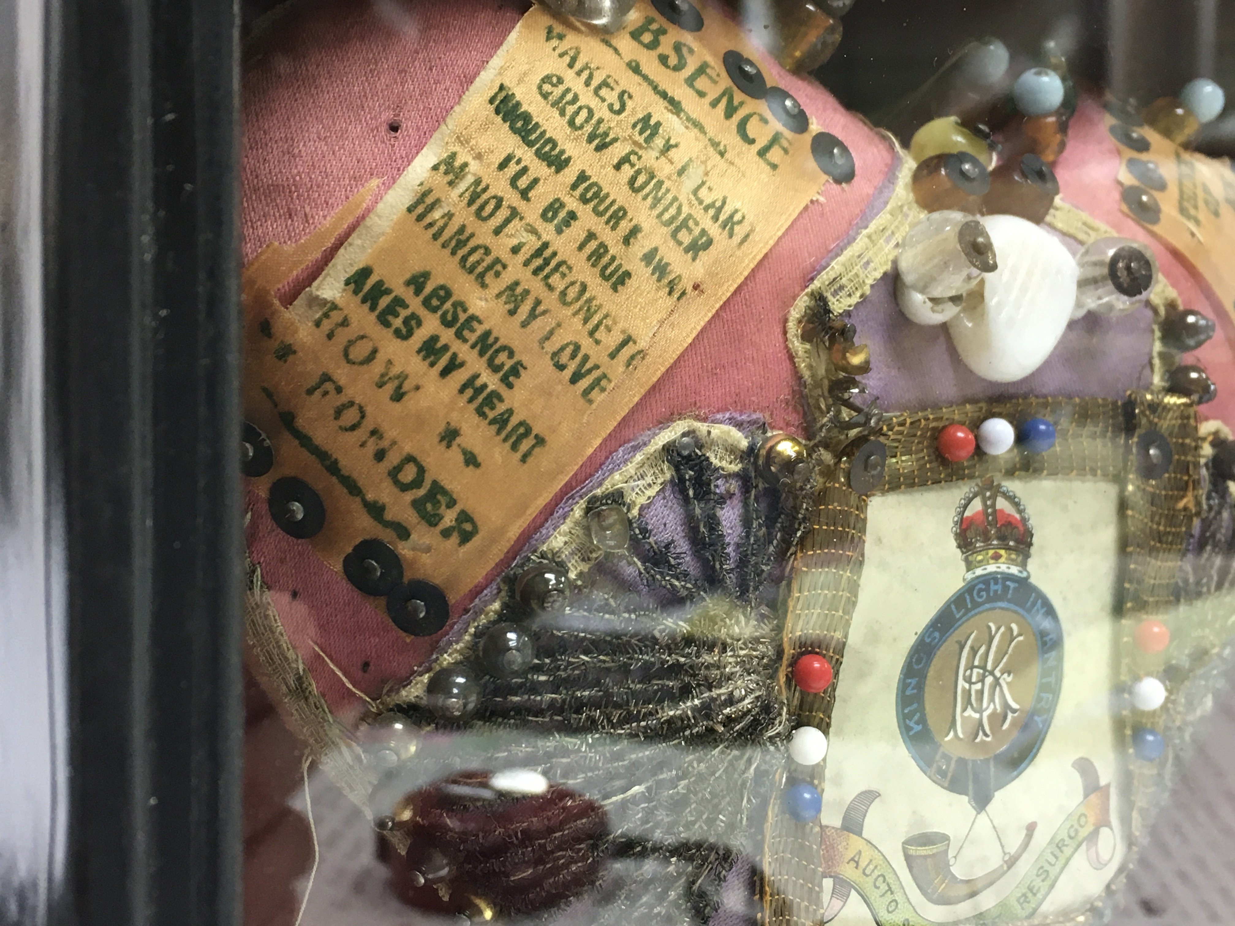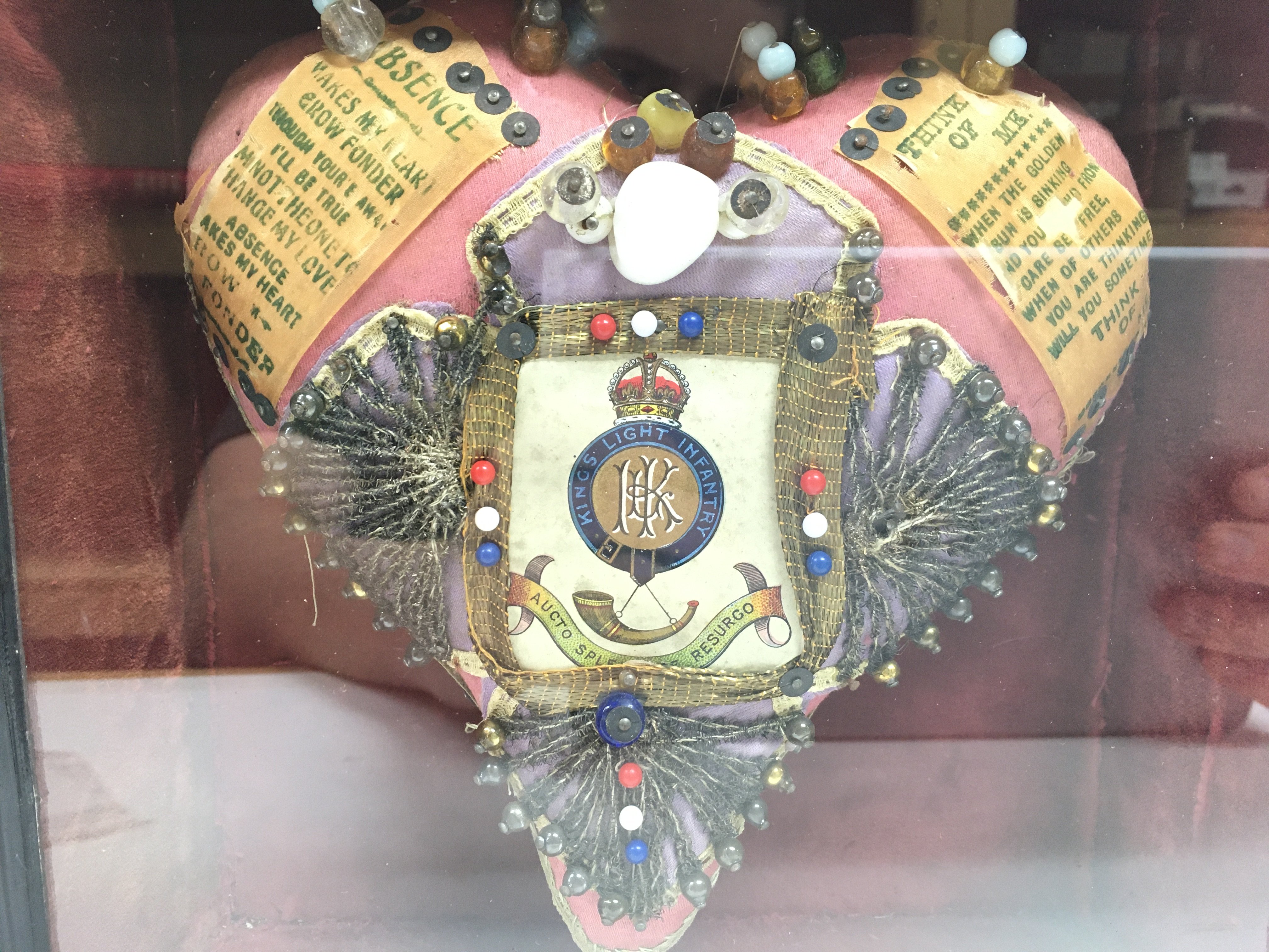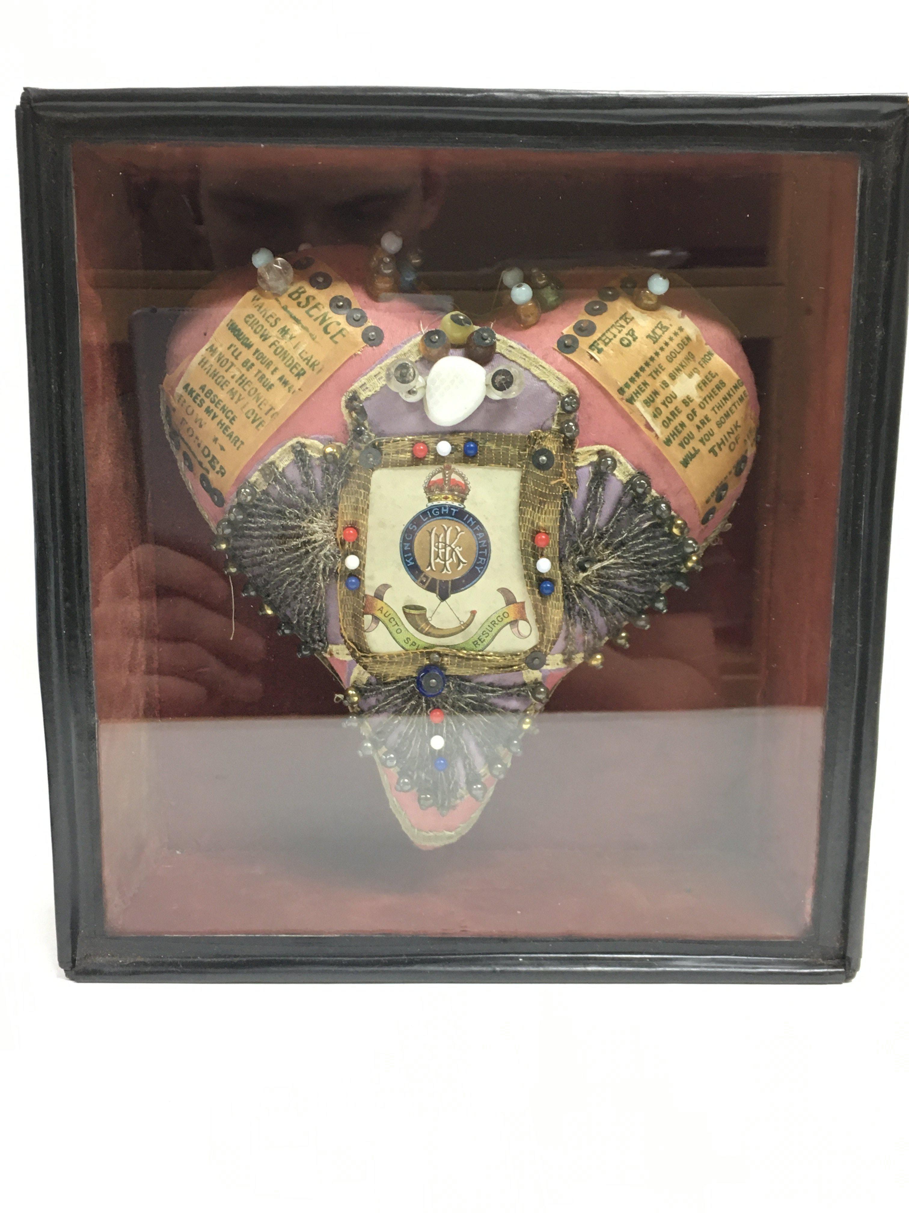 A WW1 cased sweetheart pin cushion made by a solider in the The King's Shropshire Light Infantry. Case approximate Dimensions 9x22.5x24cm This lot cannot be posted
