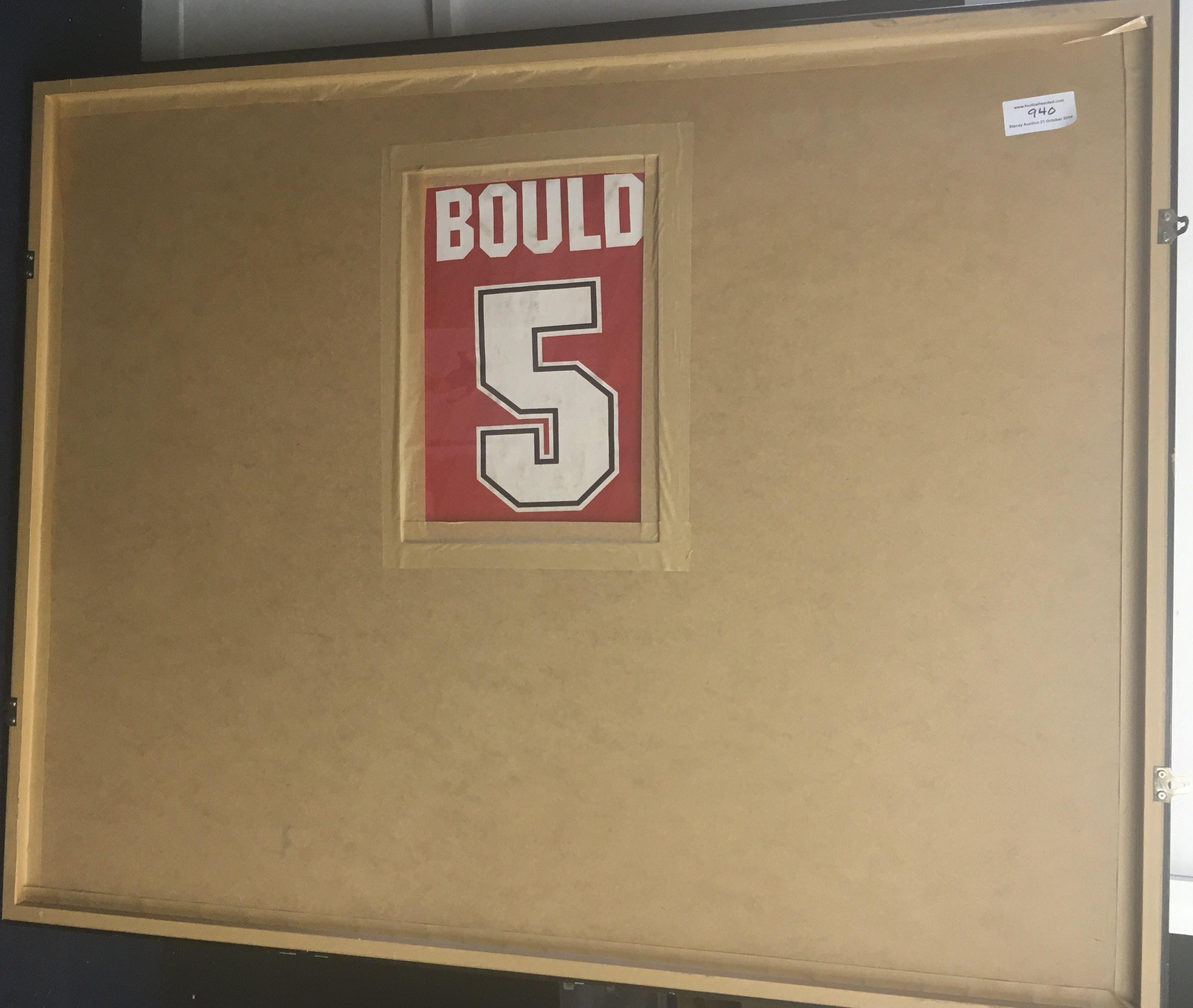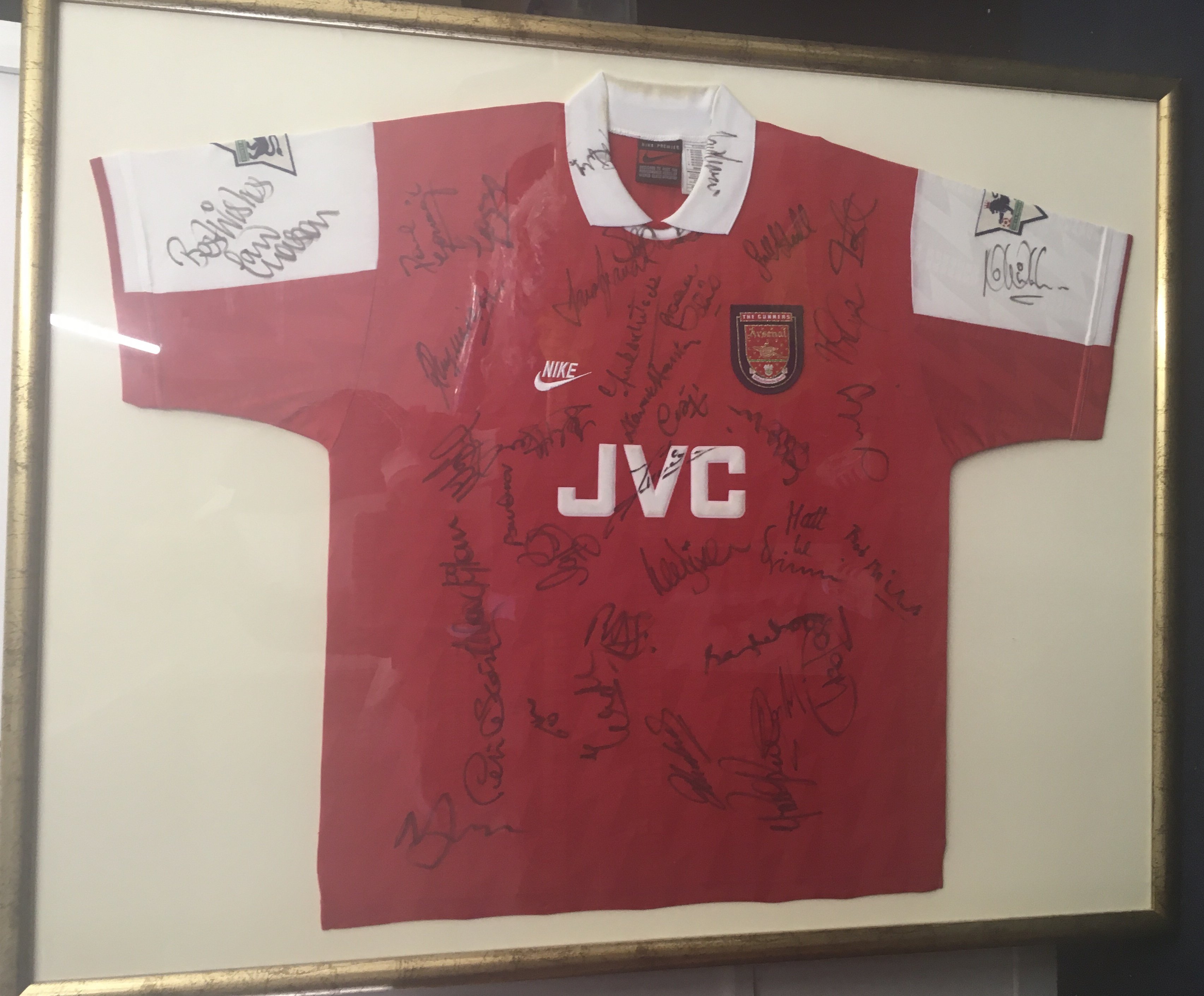 95/96 Paul Merson Arsenal Match Worn Signed Testimonial Football Shirt: Short sleeve red home shirt with Bould 5 to rear. Worn in Paul Merson testimonial match in May 1996 and presented back to Merson after being signed by both teams. Paul Gascoigne famously wore an Arsenal kit this day and has signed the shirt along with 27 others. Autographs include Dixon Seaman McLintock George Adams Le Tissier Dikov Houston Rix Wright and Ray Wilkins. Nicely presented in very large frame. Not for posting.