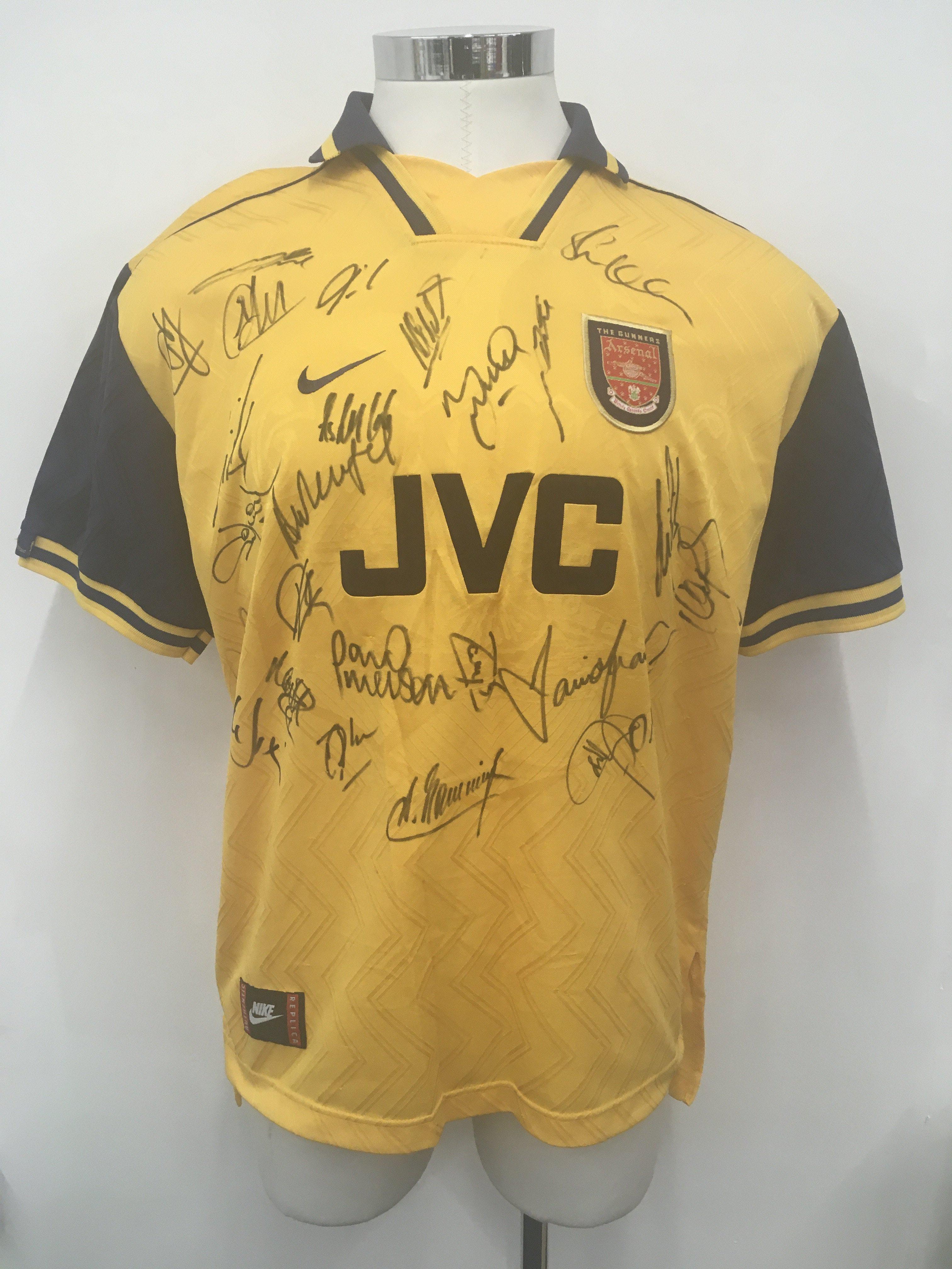Arsenal 96/97 Merson Signed Away Football Shirt: Possibly a parting gift from his team mates in his final season. Unworn yellow JVC shirt with Merse 9 to rear. Front has 23 autographs including his own.