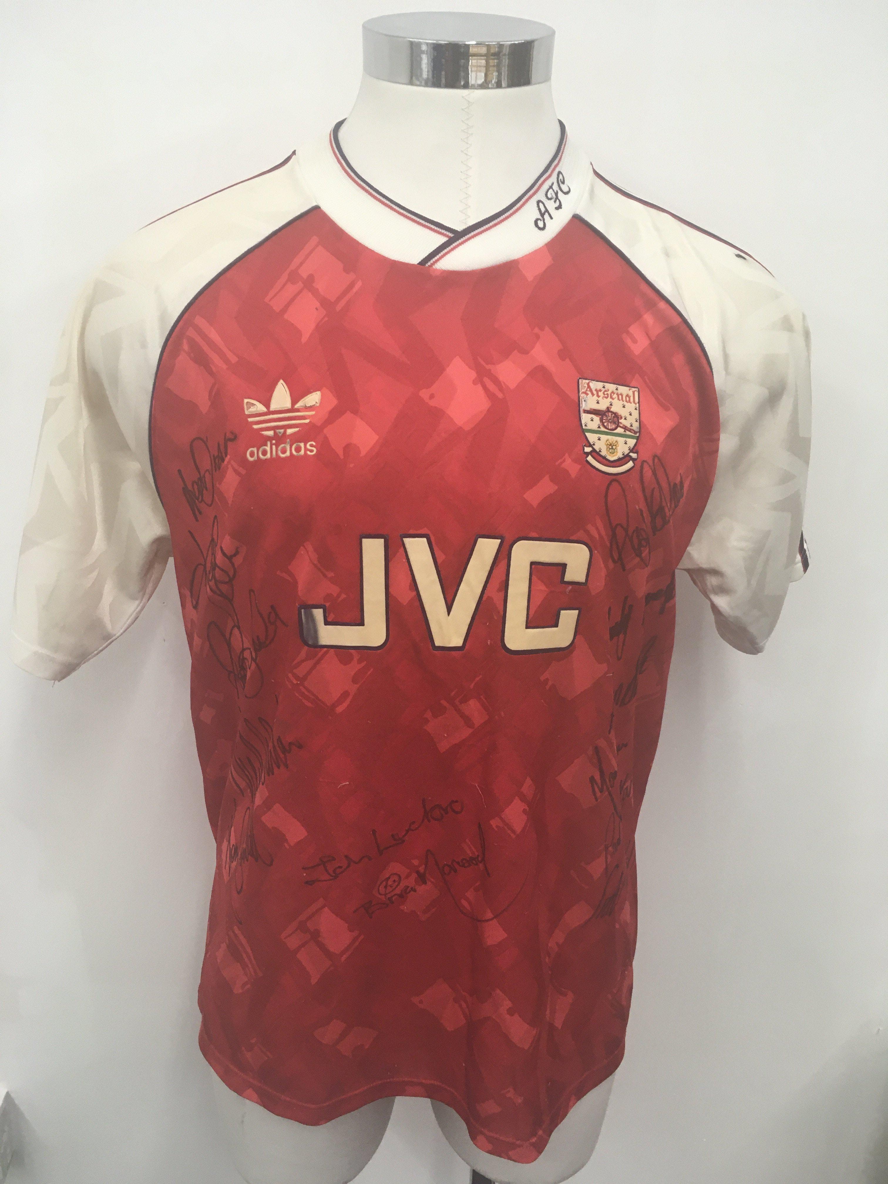 Arsenal 1990 - 1991 Champions Signed Football Shirt: Original red home shirt sponsored by JVC. Signed to front by 13 players including Dixon Marwood Winterburn Parlour Dikov Smith Adams Lukic and the late great Kevin Campbell. Former property of Paul Merson. Arsenal were Champions and this was signed early on as Marwood and Lukic left pre season.