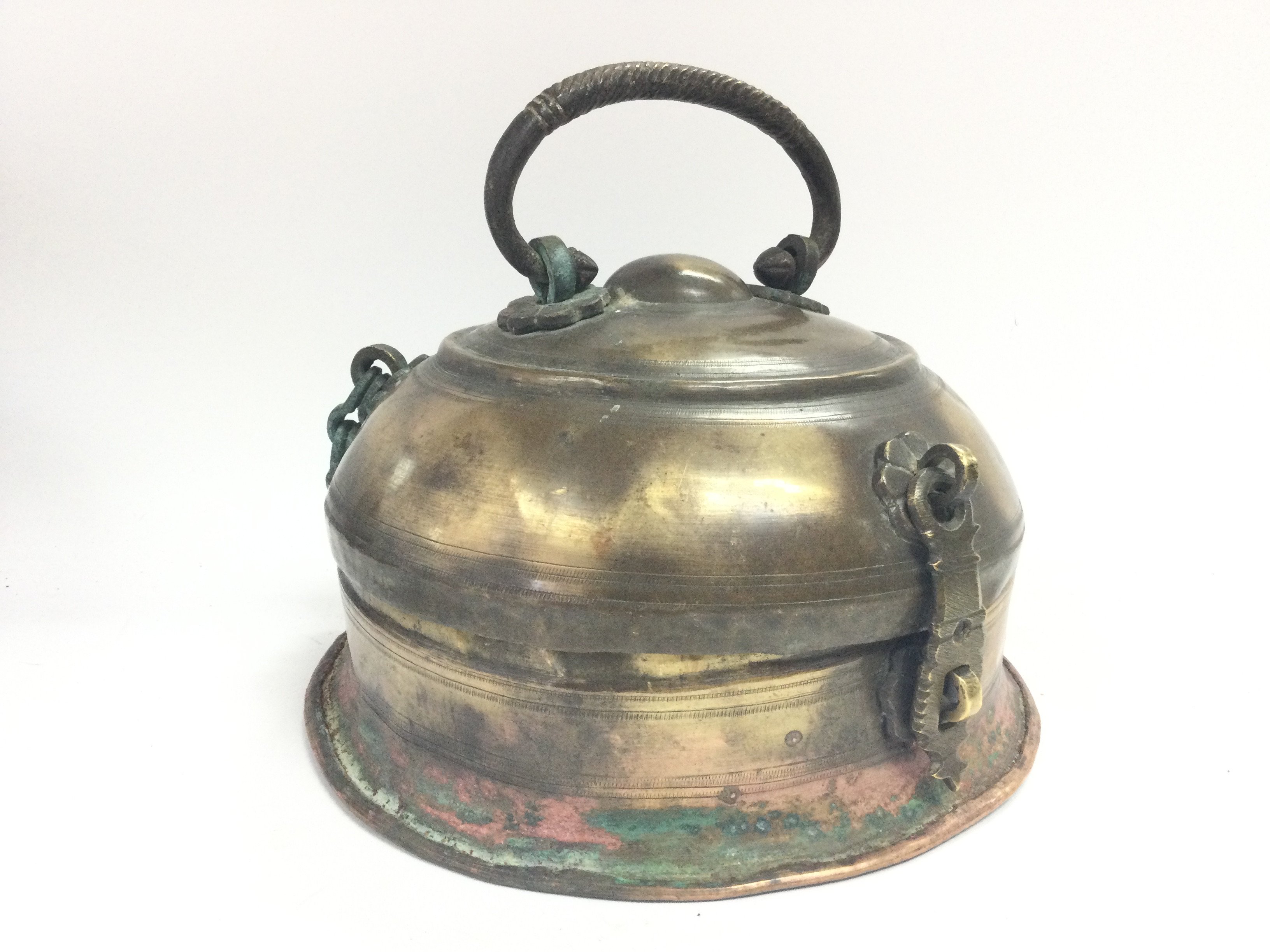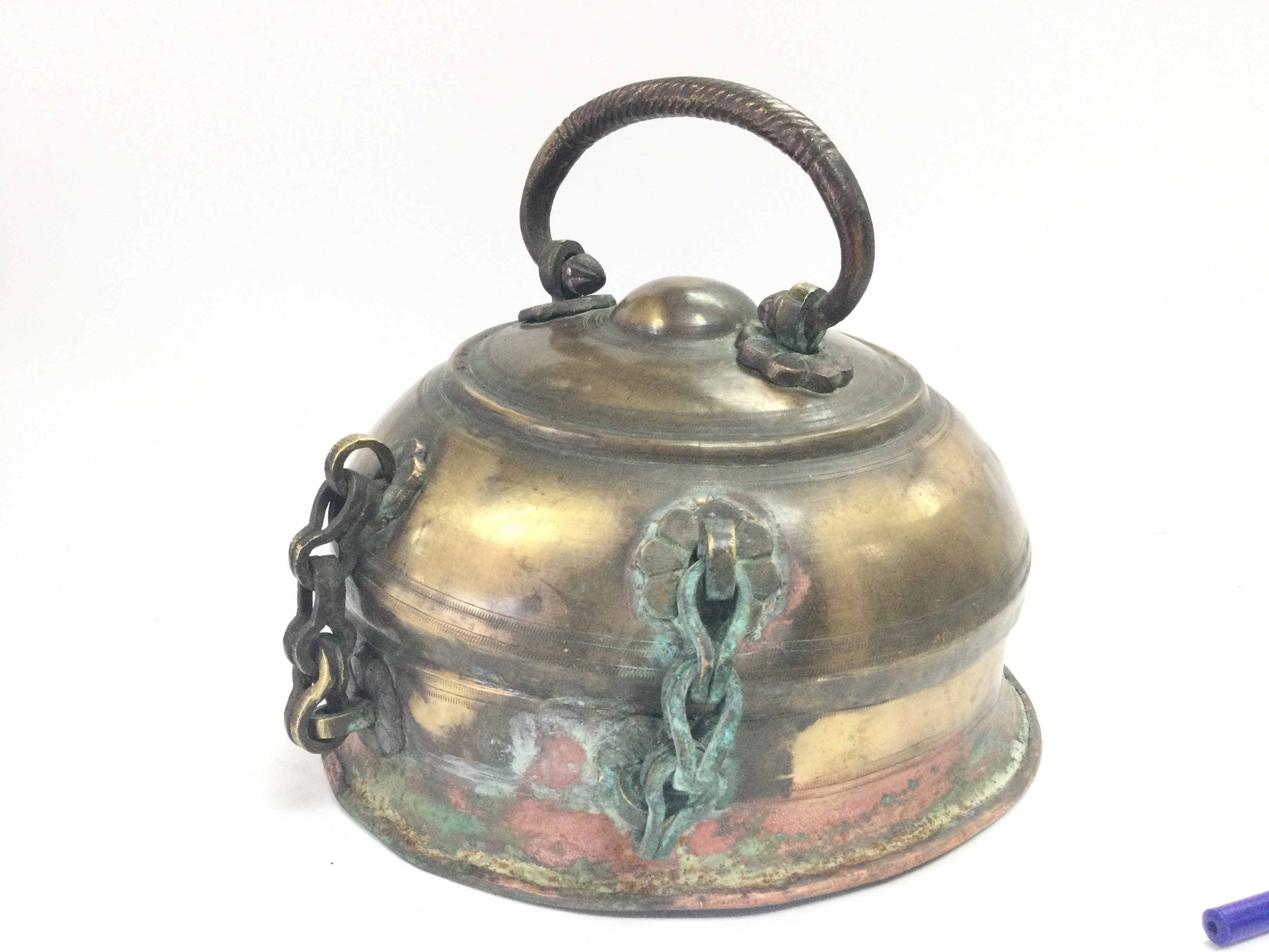 A brass round container with chain hinges and a brass handle. 14cm tall approximately. Postage category B