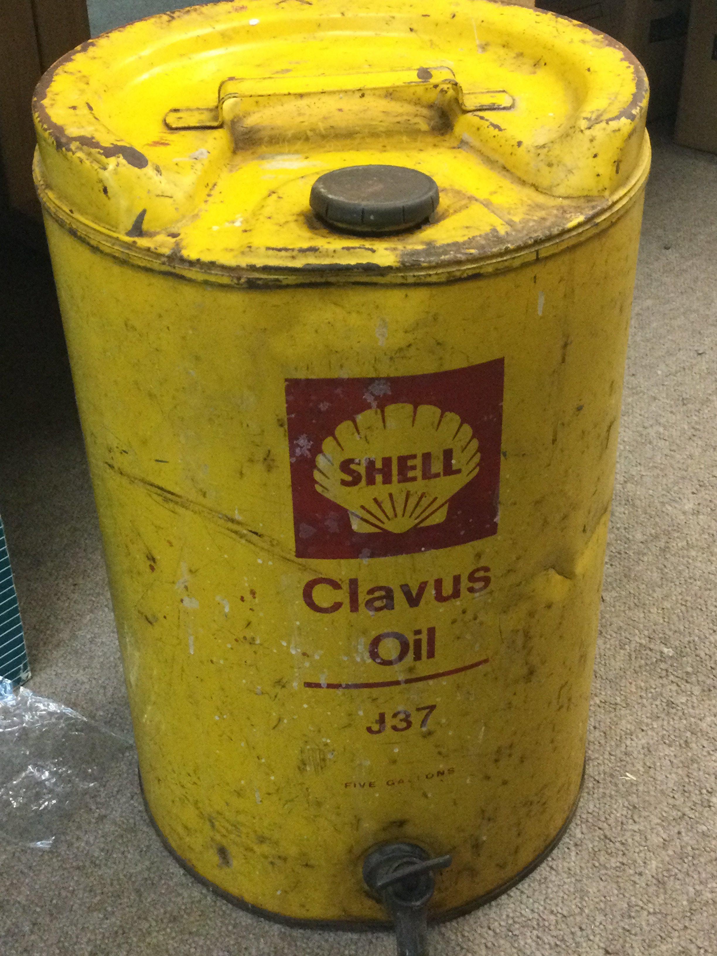 A vintage shell 5 gallon drum, Clavus Oil with tap
