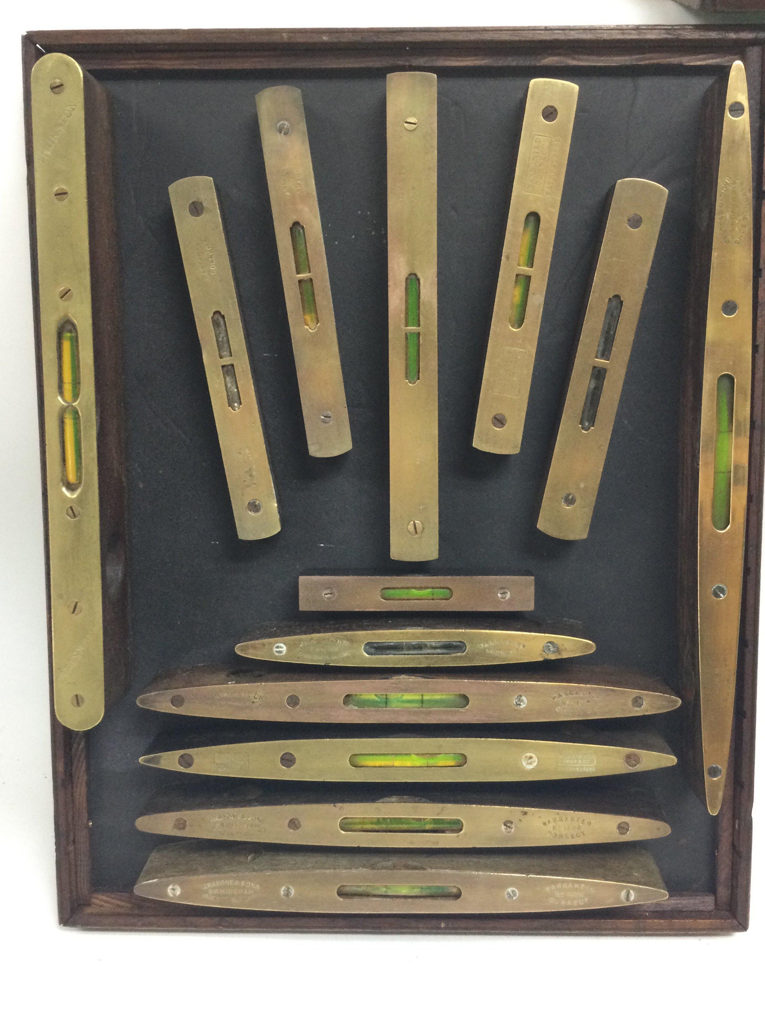 A framed collection of vintage brass topped spirit levels. This lot cannot be posted