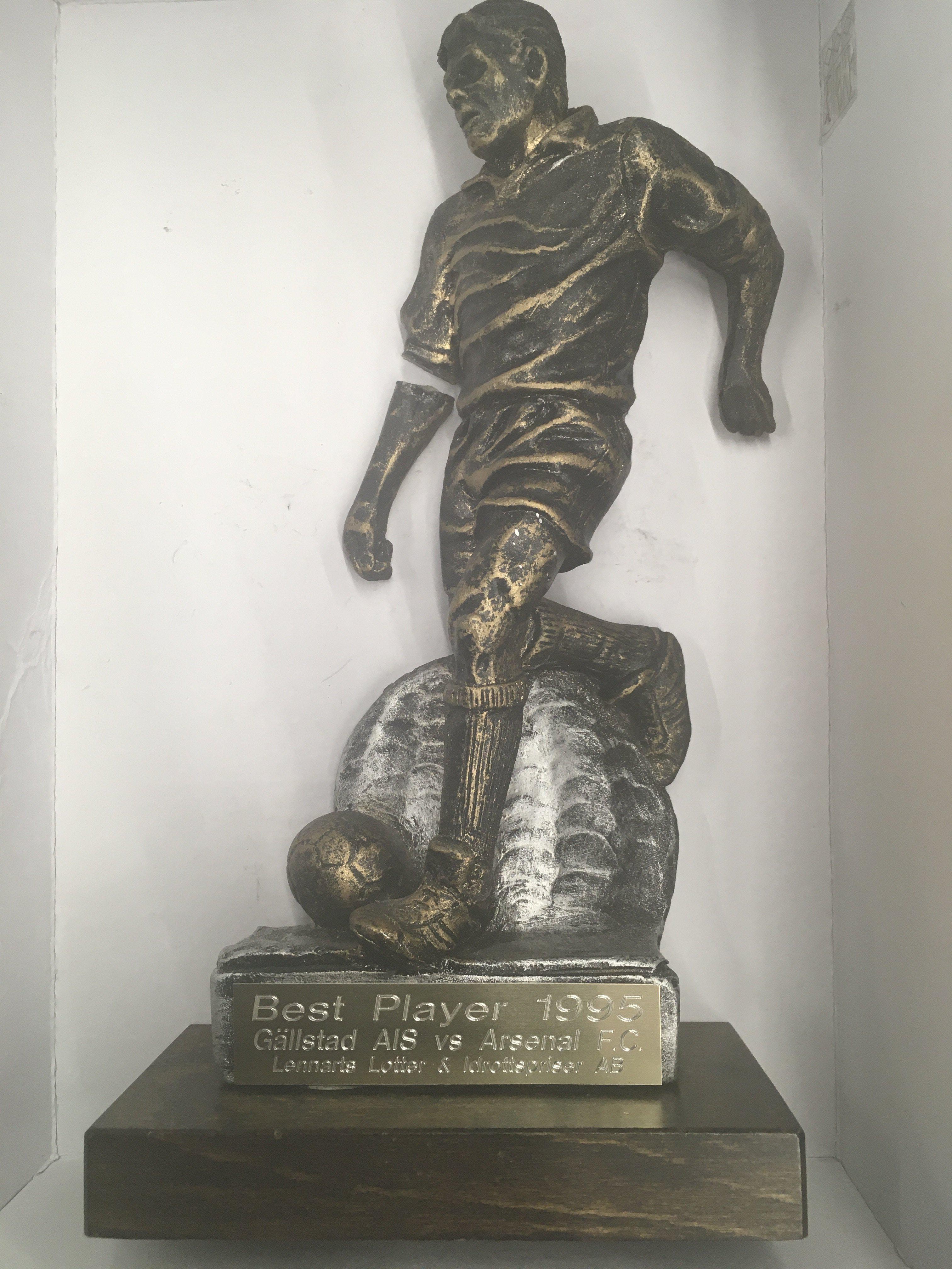 Paul Merson 1995 Player Of The Match Award: Ten inch high football figure with wording Best Player 1995 and match details for Hallstads v Arsenal. One arm has snapped off but is present and will need glueing.