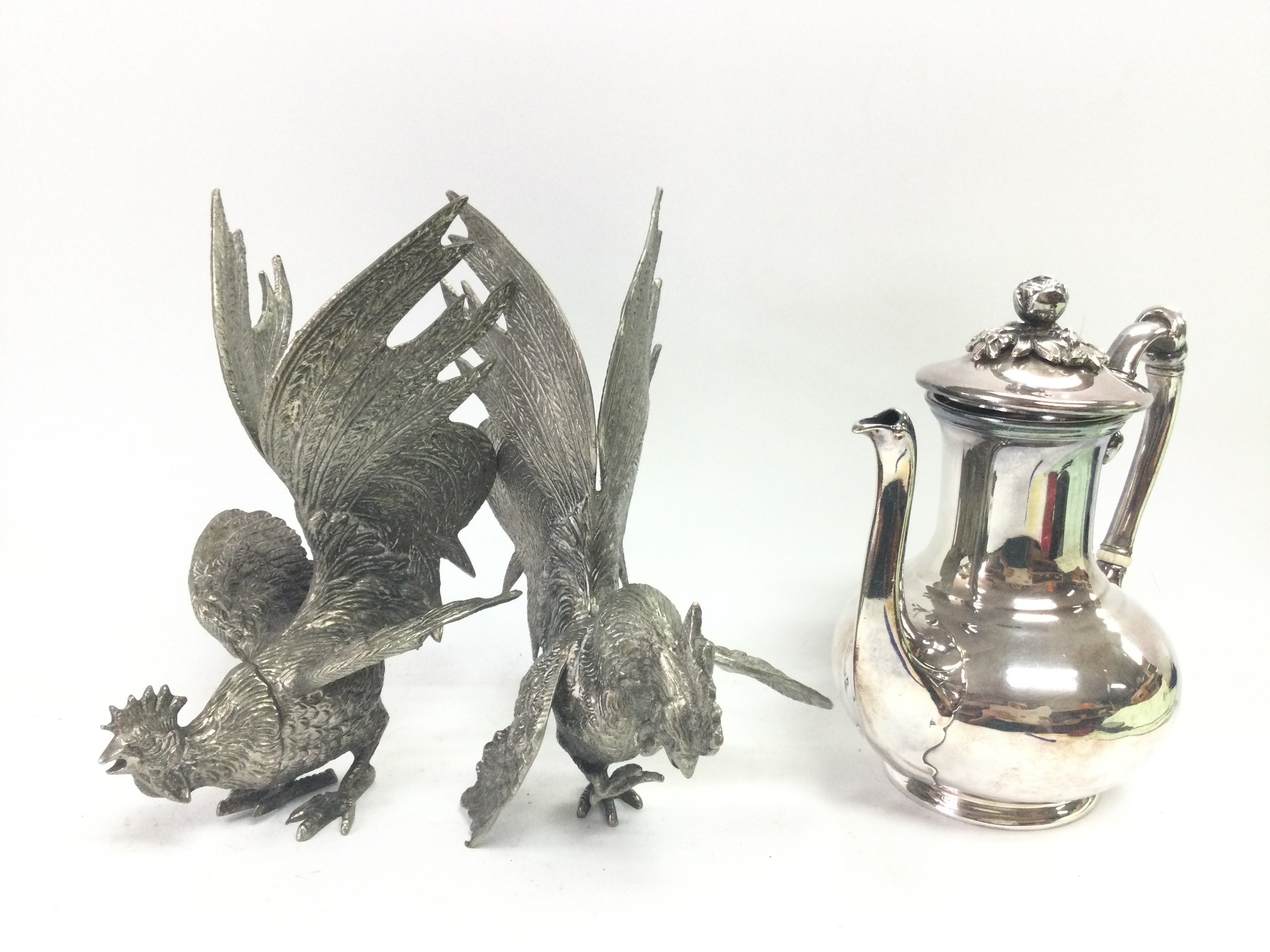 Fighting cockerel figures and a silver plated tea pot , postage category C