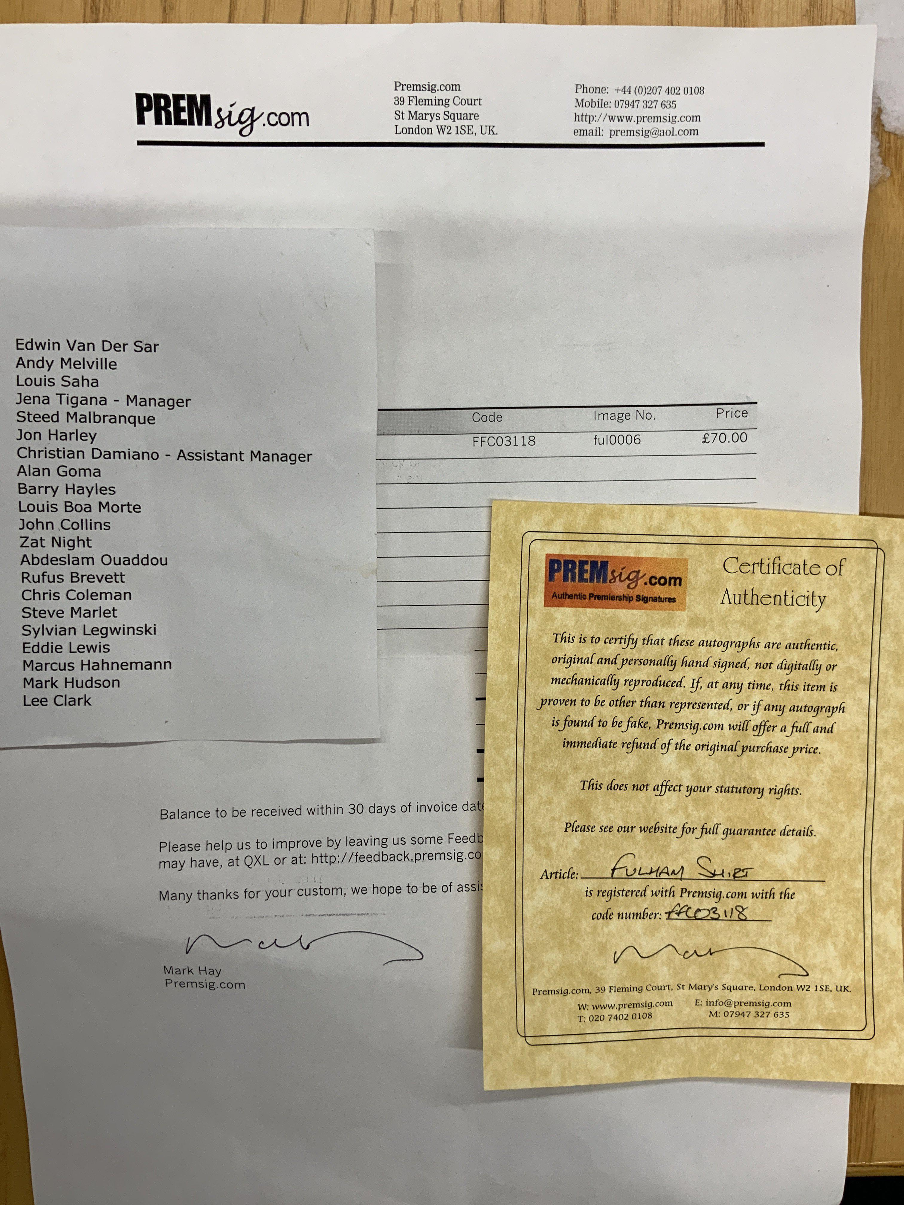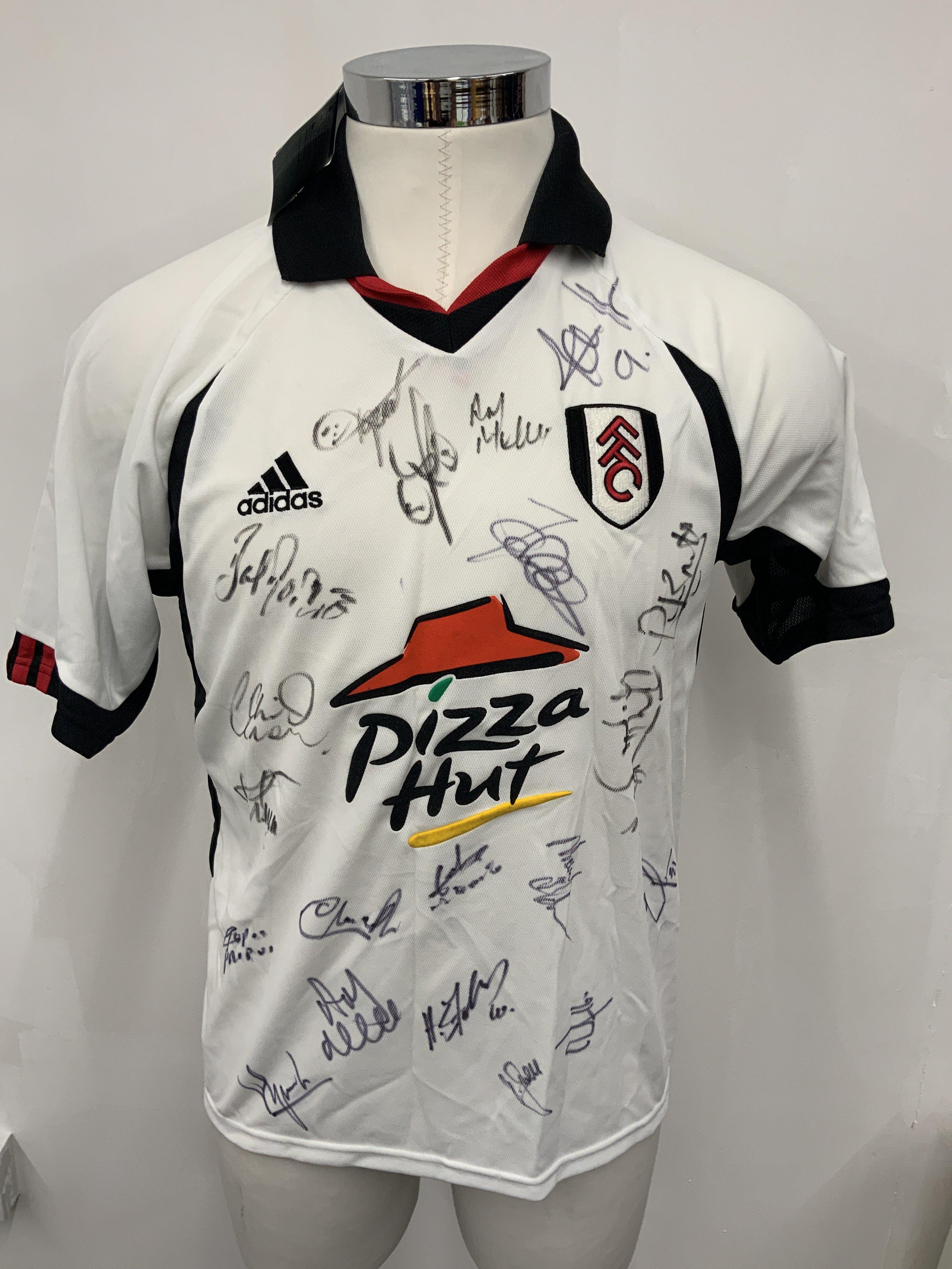 Fulham 2001 - 2002 Signed Football Shirt: Home short sleeve shirt sponsored by Pizza Hut with labels still attached. Fully signed with list of players signed including Saha Boa Morte Van Der Sar and manager Tigana. Coa included.
