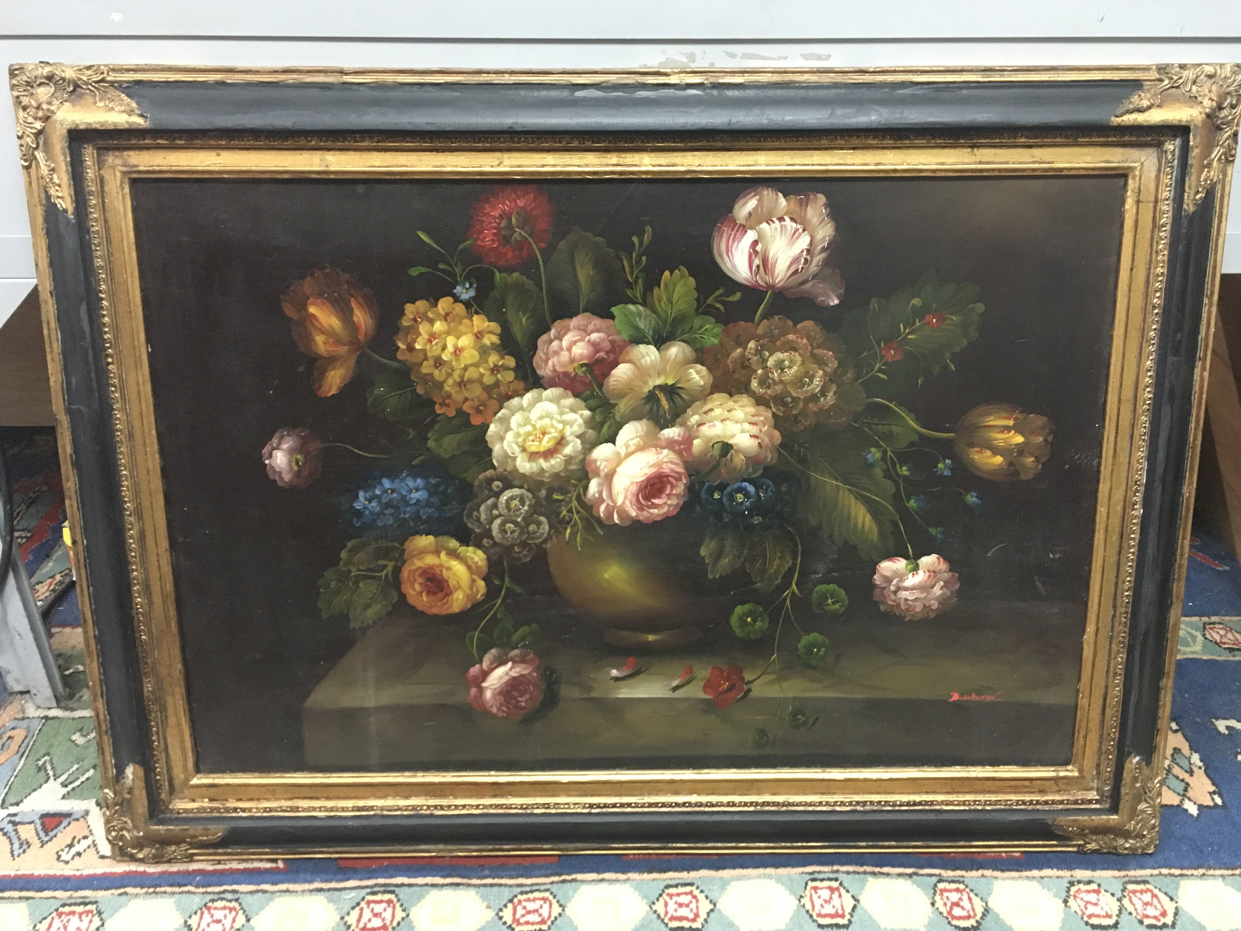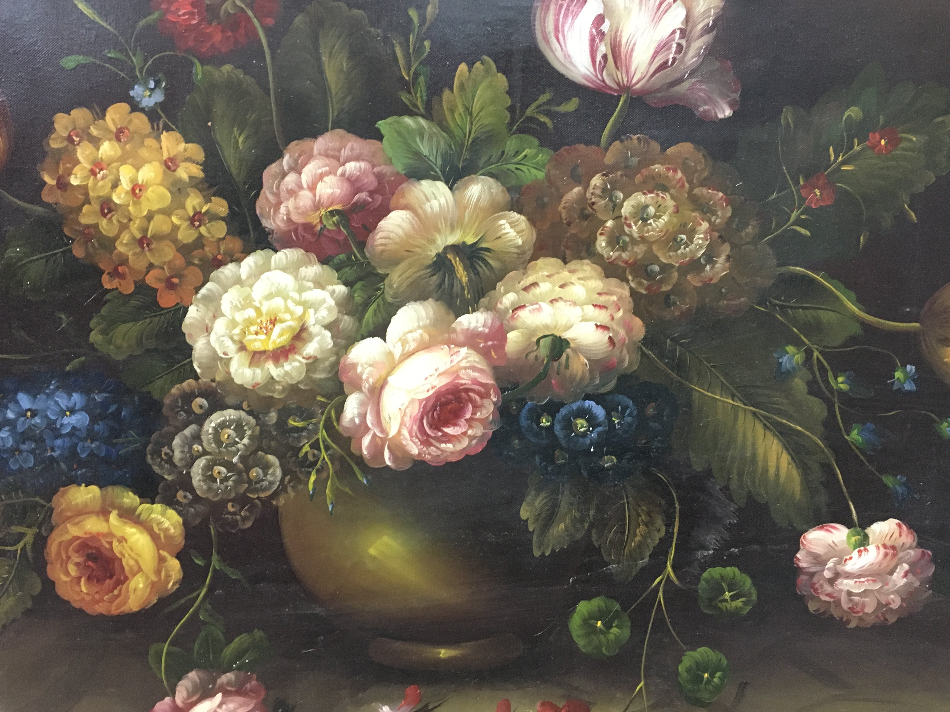 A framed oil on canvas still life vase of flowers painting. Signed B. Ward Dimensions 90x65cm
