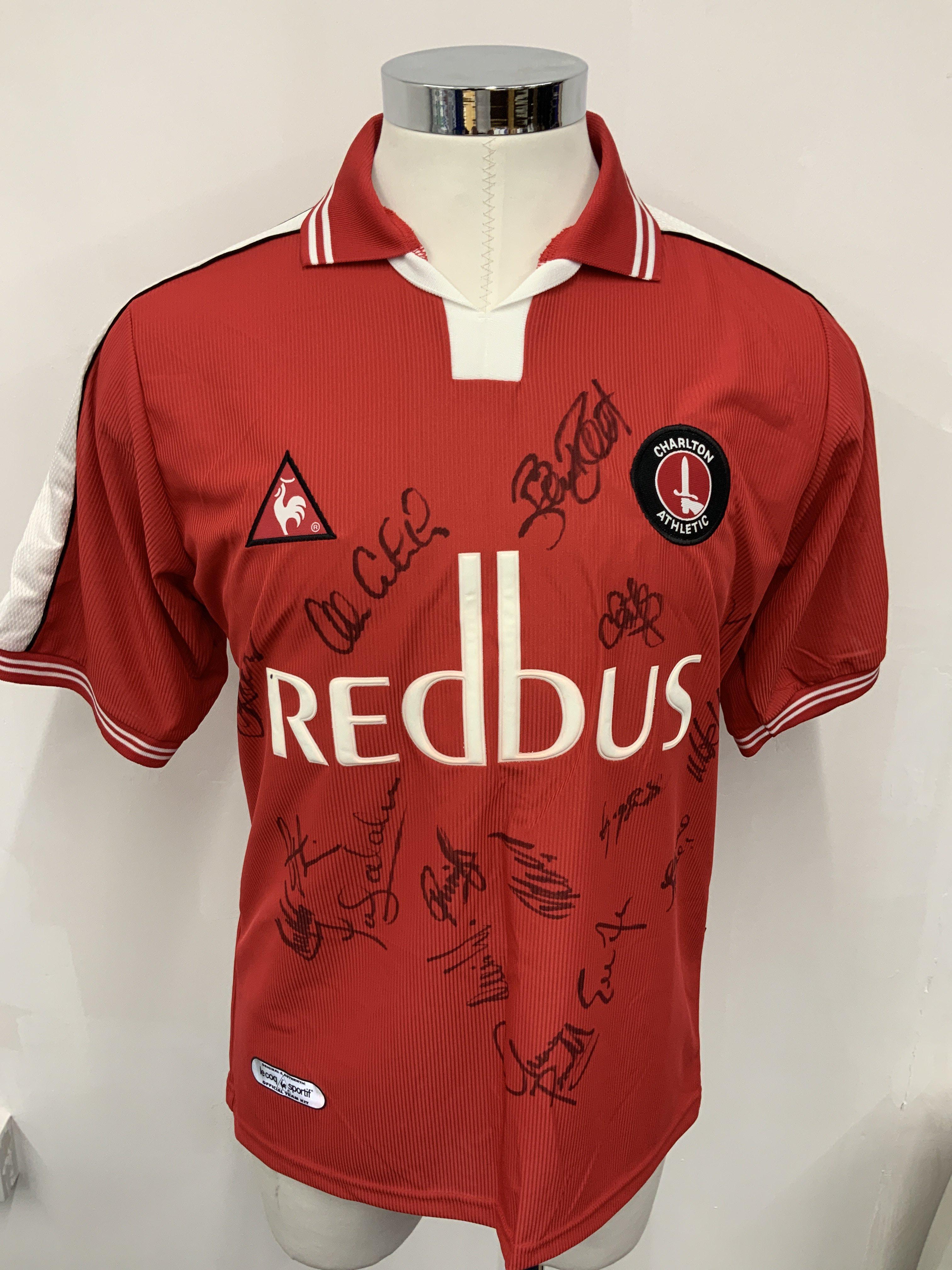 Charlton 2001 - 2002 Signed Home Shirt: Red Le Coq Redbus sponsored shirt signed to front by 15 players.