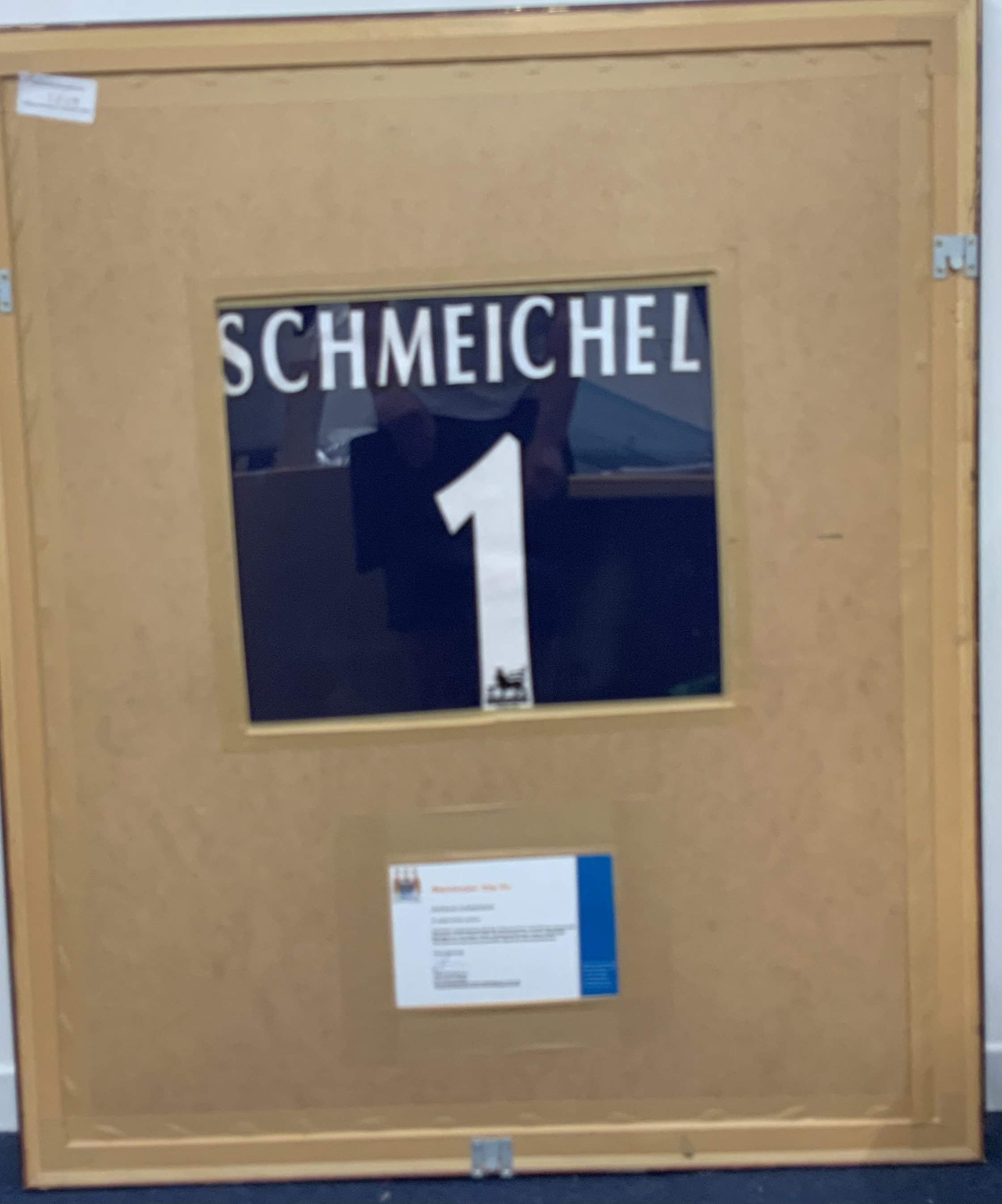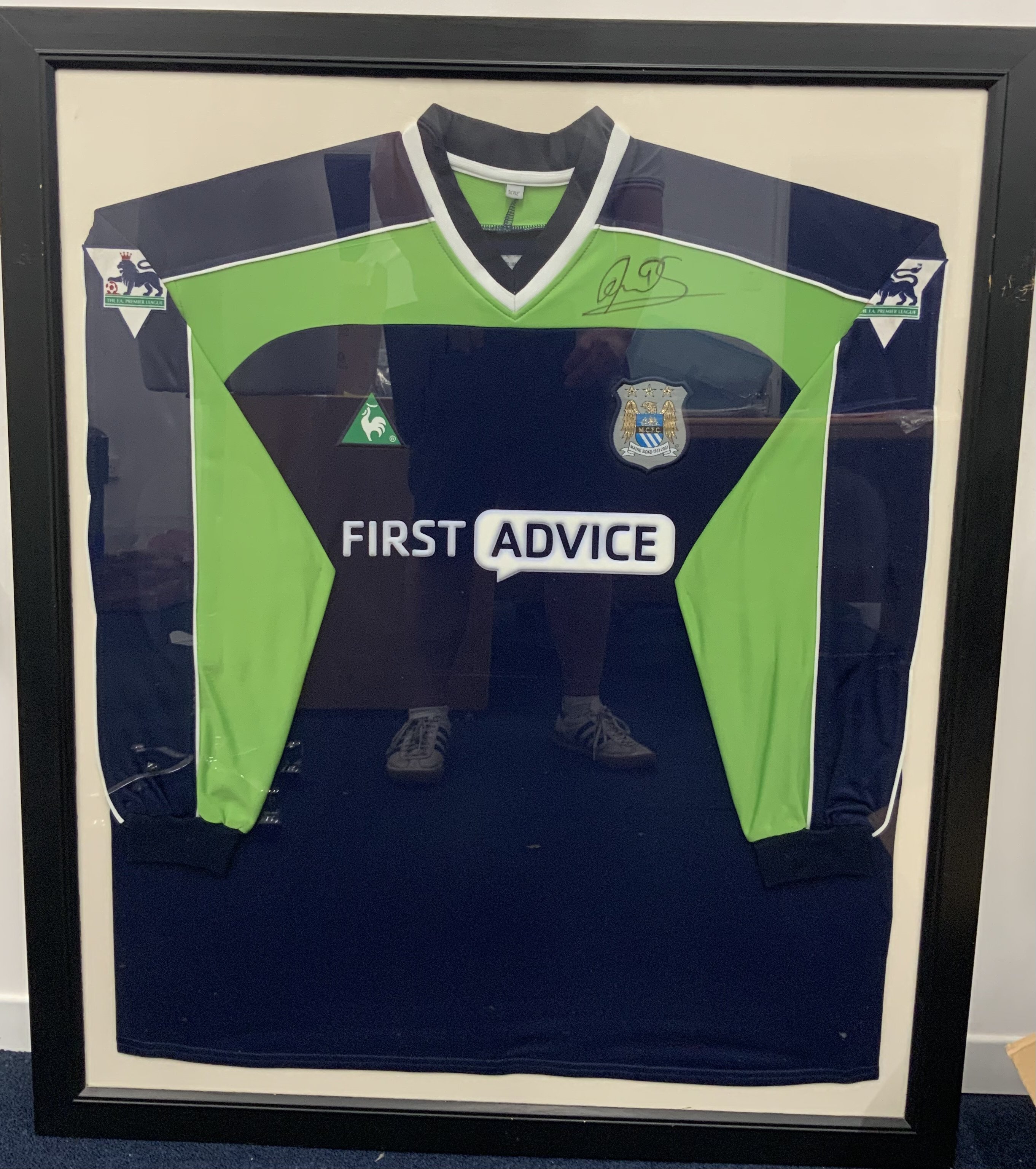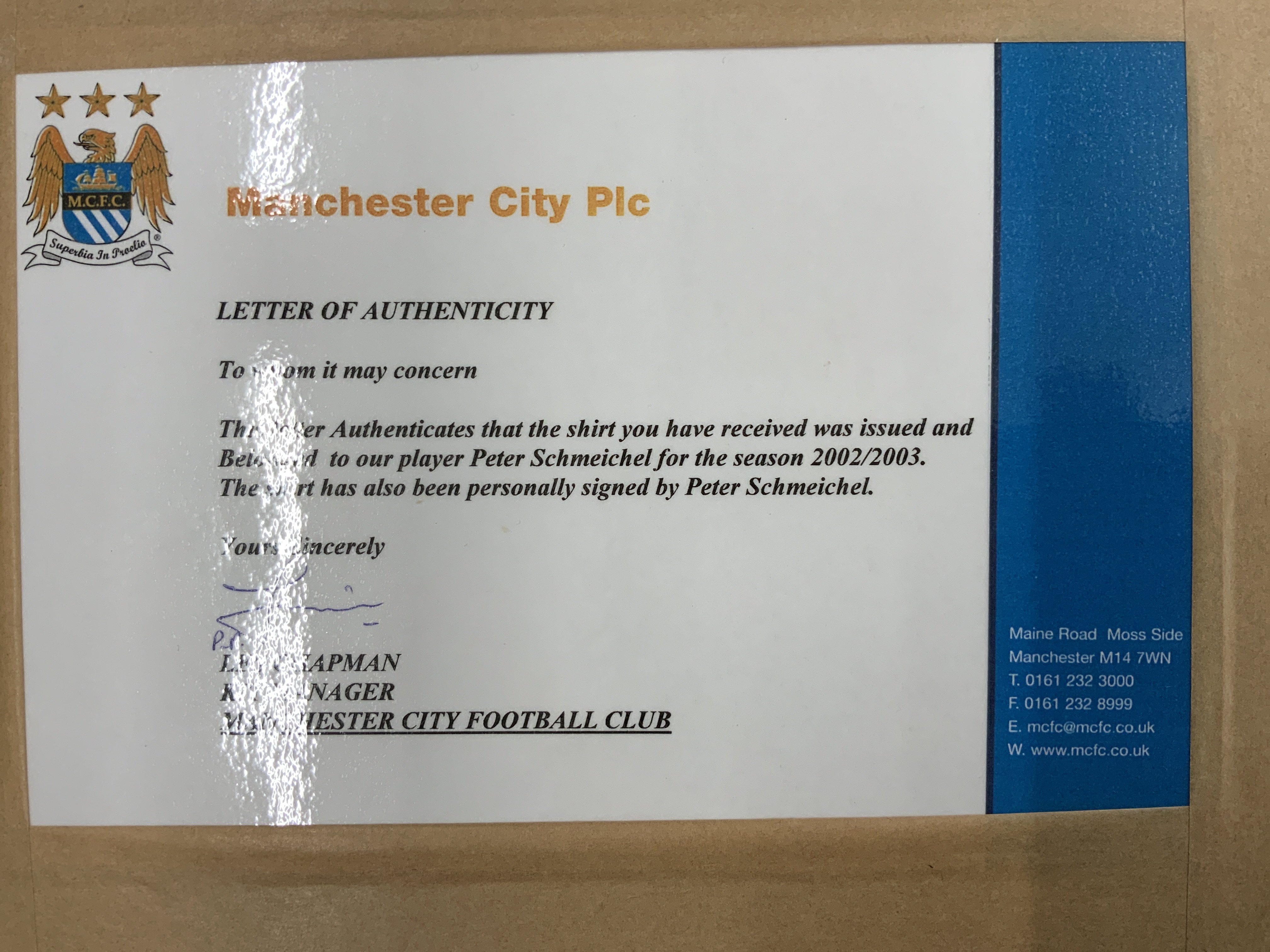 Schmeichel Manchester City 2002 - 2003 Match Issued Framed Football Shirt: Green and blue Le Coq long sleeve First Advice sponsored shirt in size 50/52. Signed to front by Peter. Frame partly cut out at rear so you can see name and number. COA from Manchester City. Not for posting.