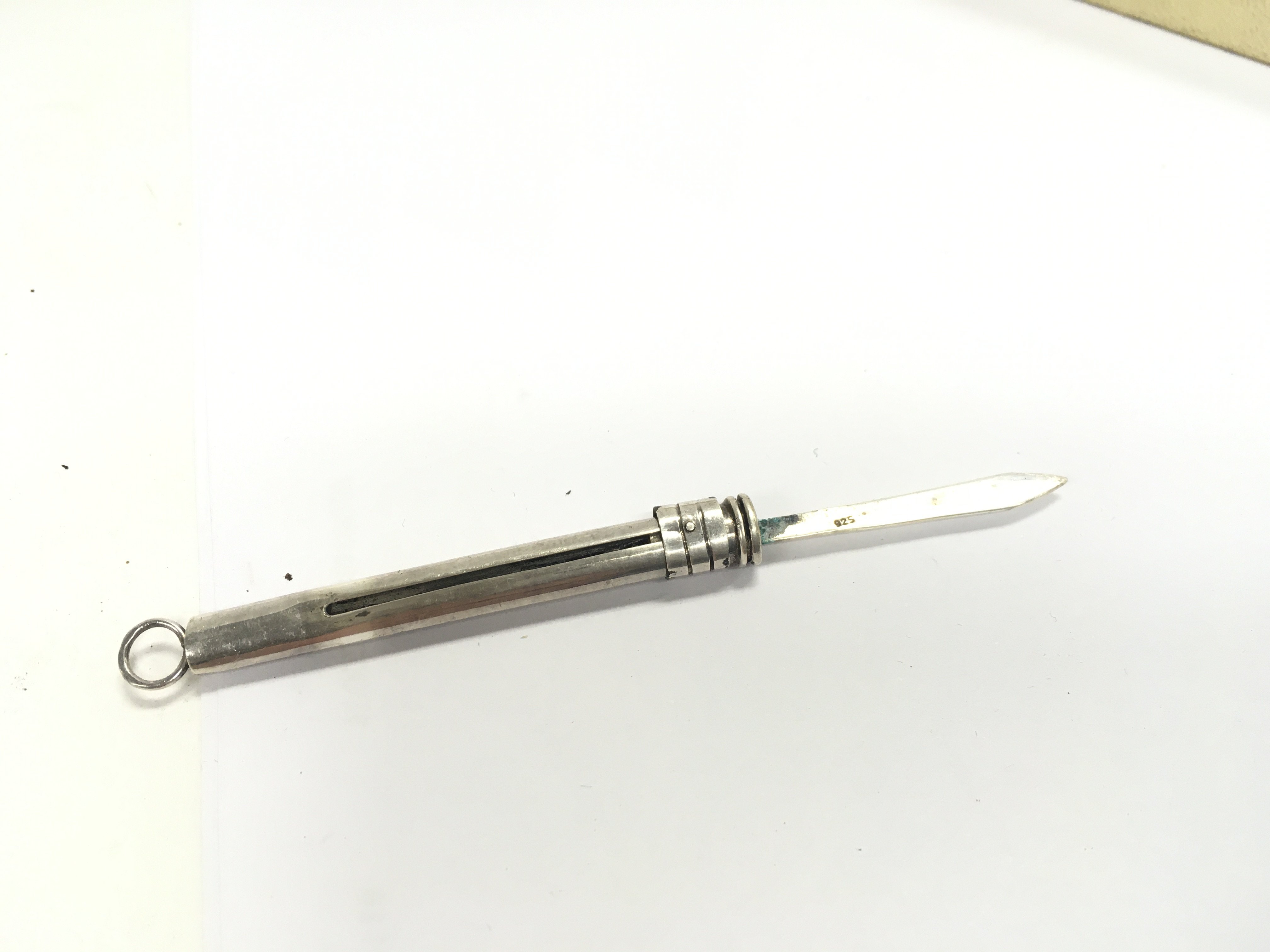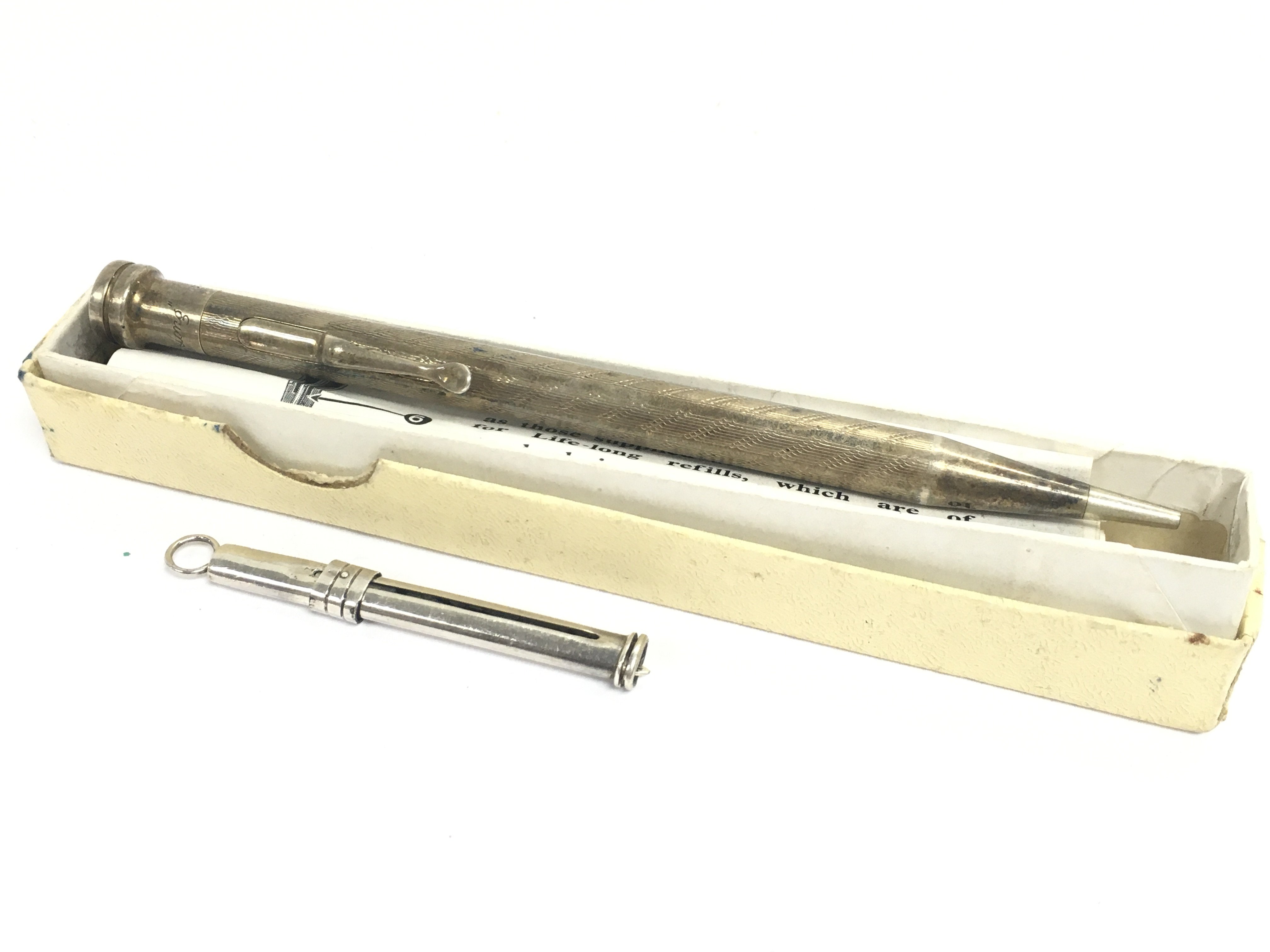 A boxed silver propelling pencil and silver toothpick. Postage category A
