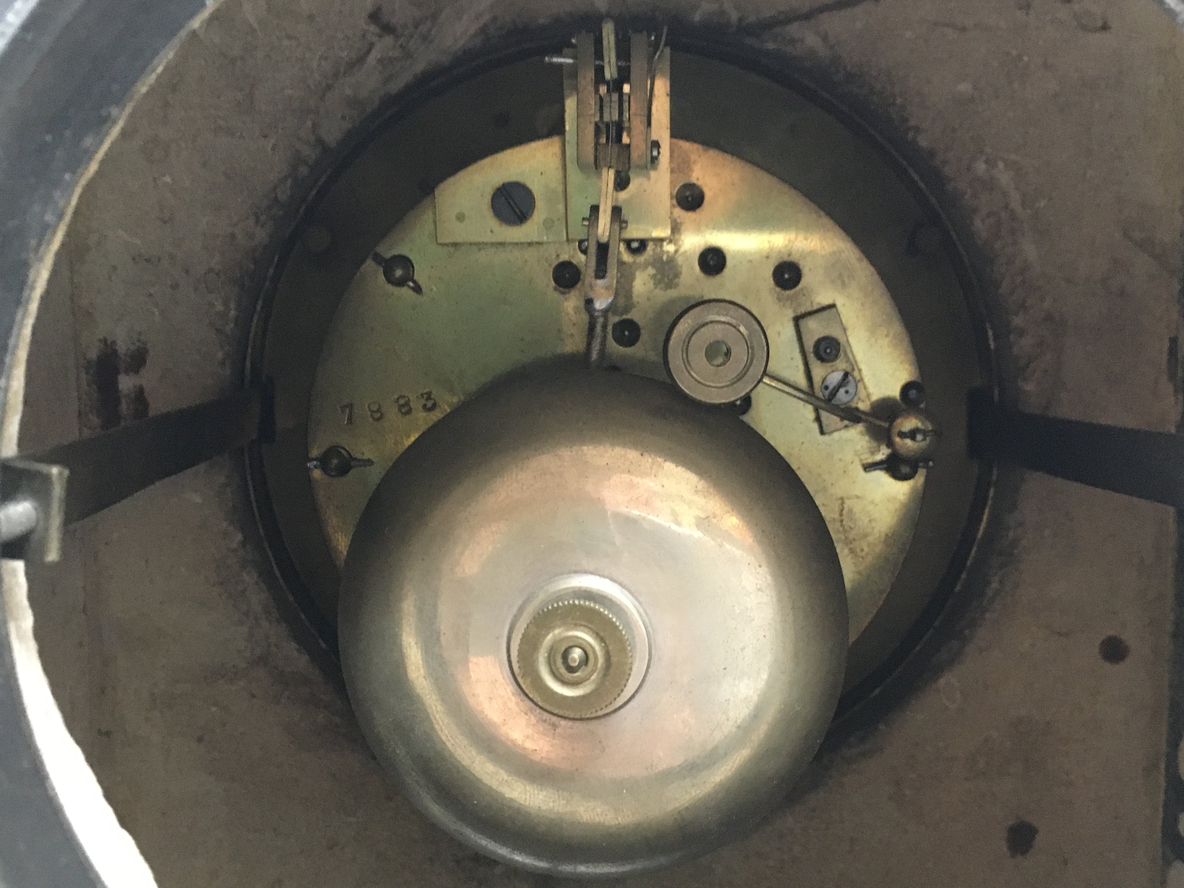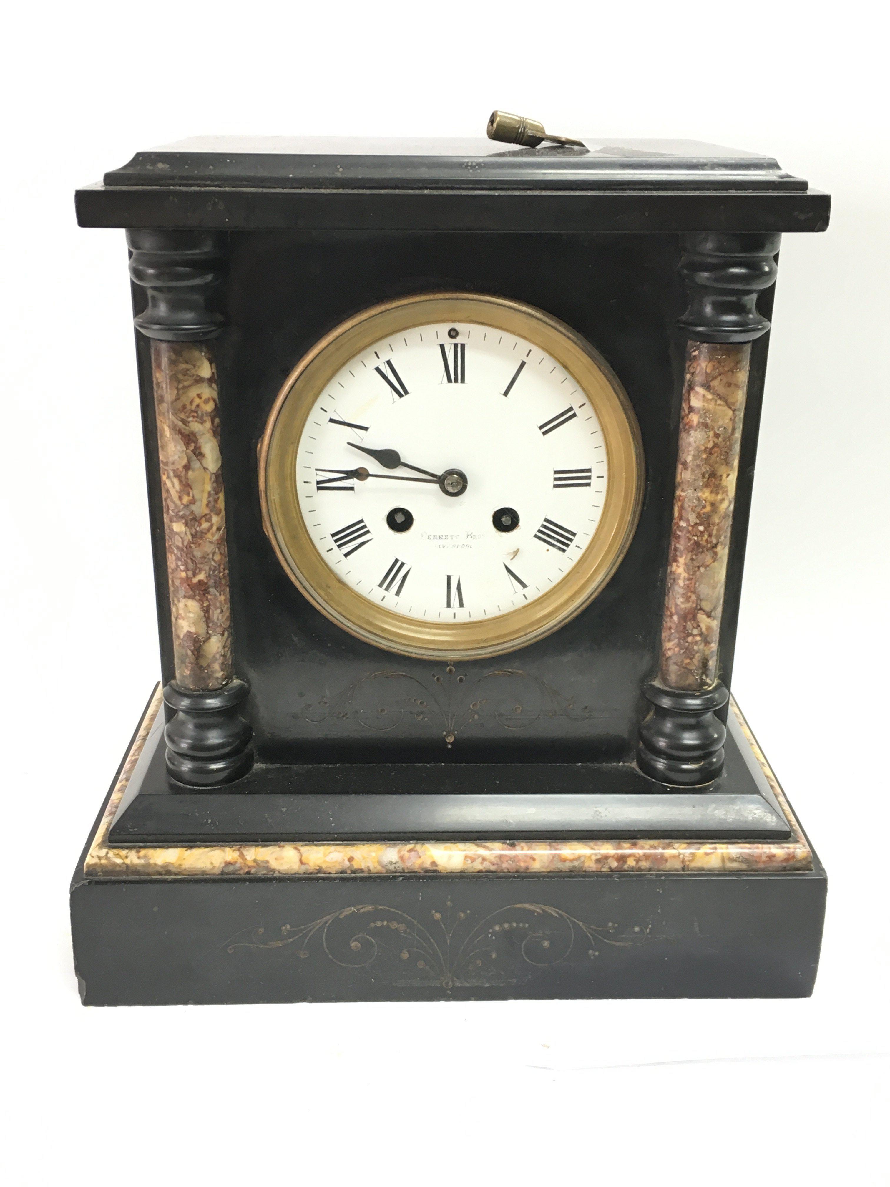 A black slate Bennett Bros Liverpool mantel clock. Dimensions approximately 17x27x29.5cm. This lot cannot be posted