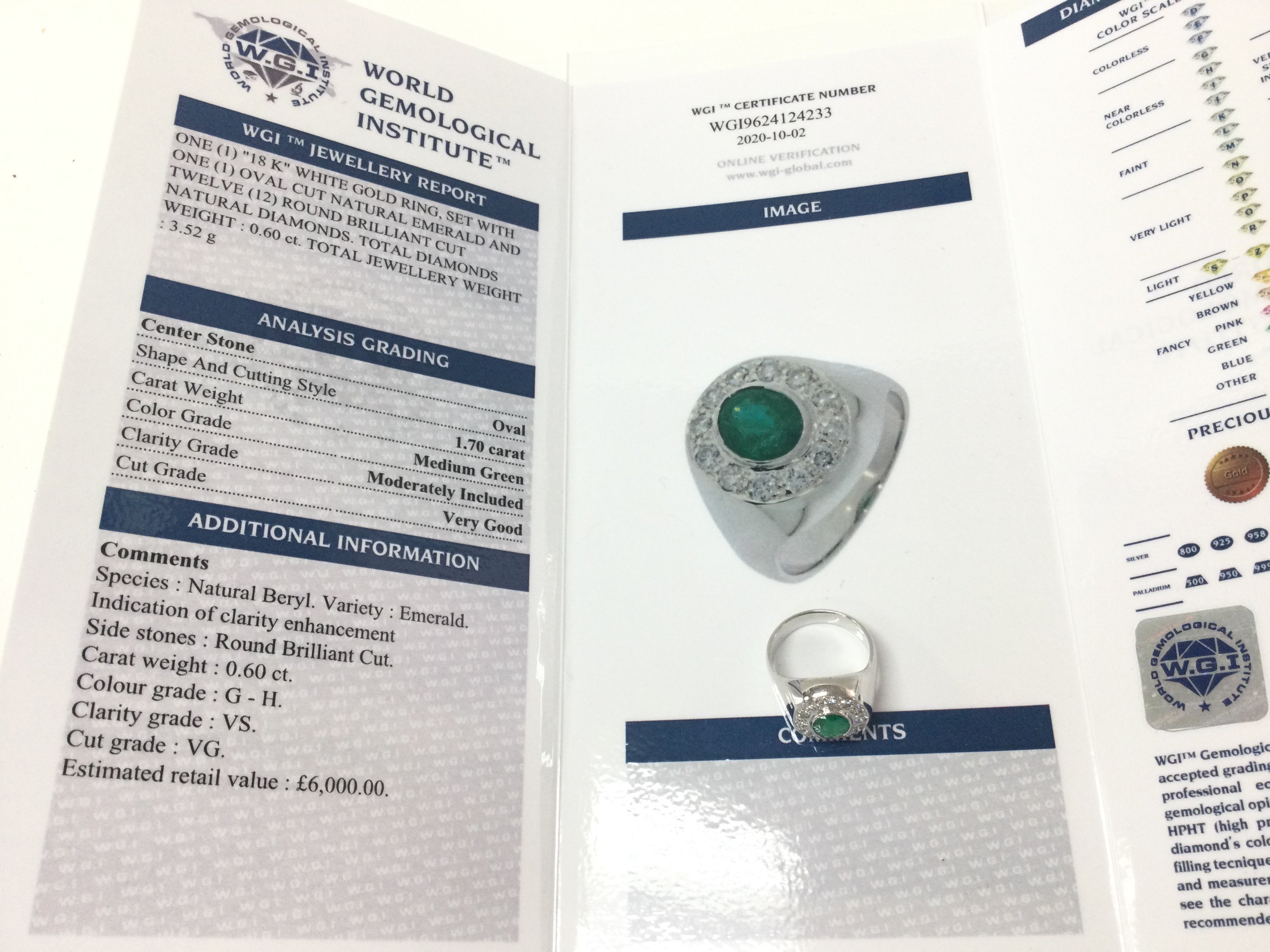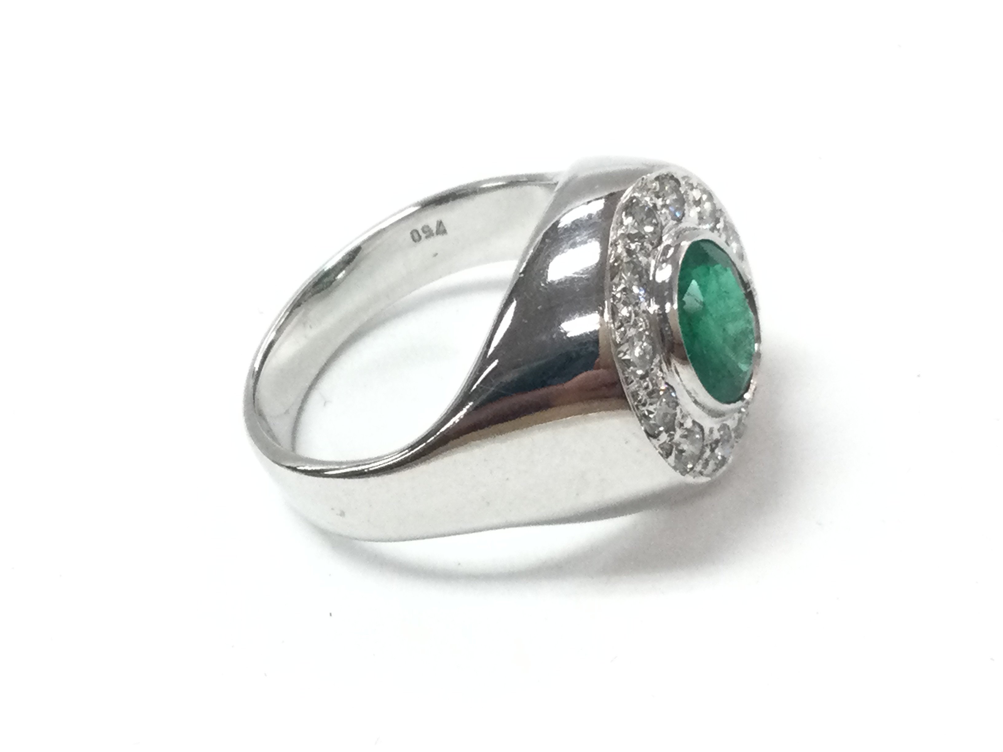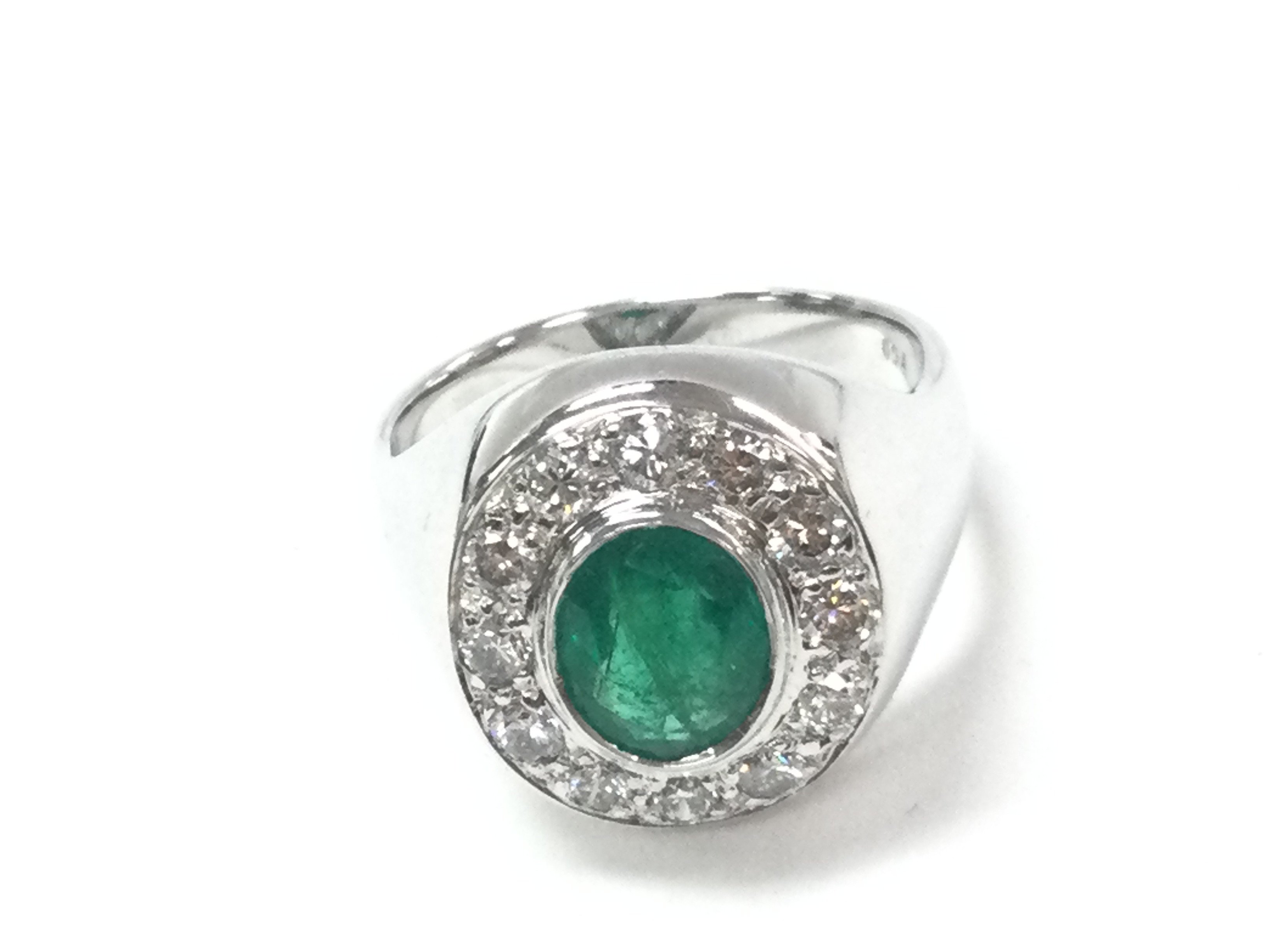A weighty 18ct white gold emerald and diamond dinner ring with certificate. Oval emerald 1.70ct diamonds 0.60ct. Size Q and 13g. Postage B