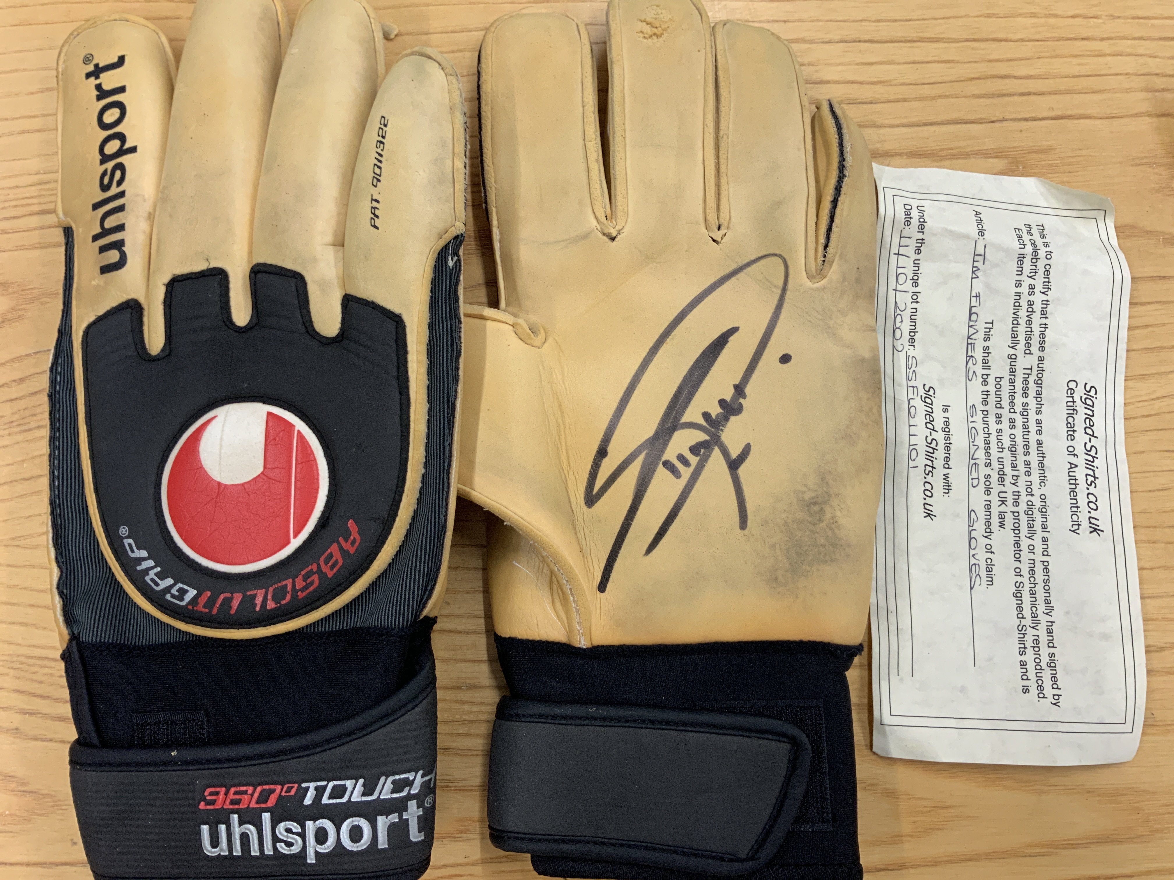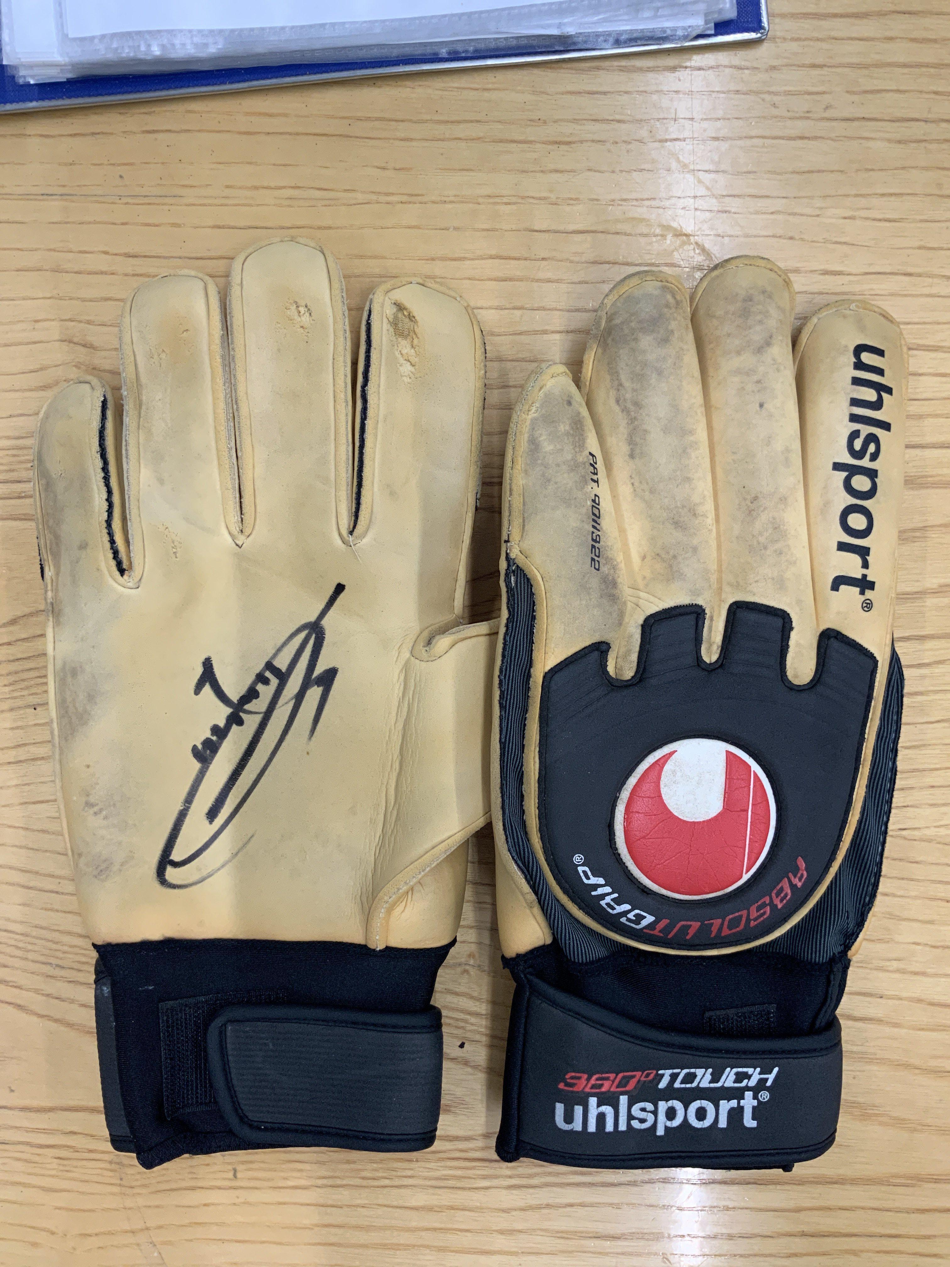 Tim Flowers Leicester City Match Worn Football Goalkeeper Gloves: Pair of Uhlsport worn gloves believed to be worn in his Leicester days. Both signed to palm.