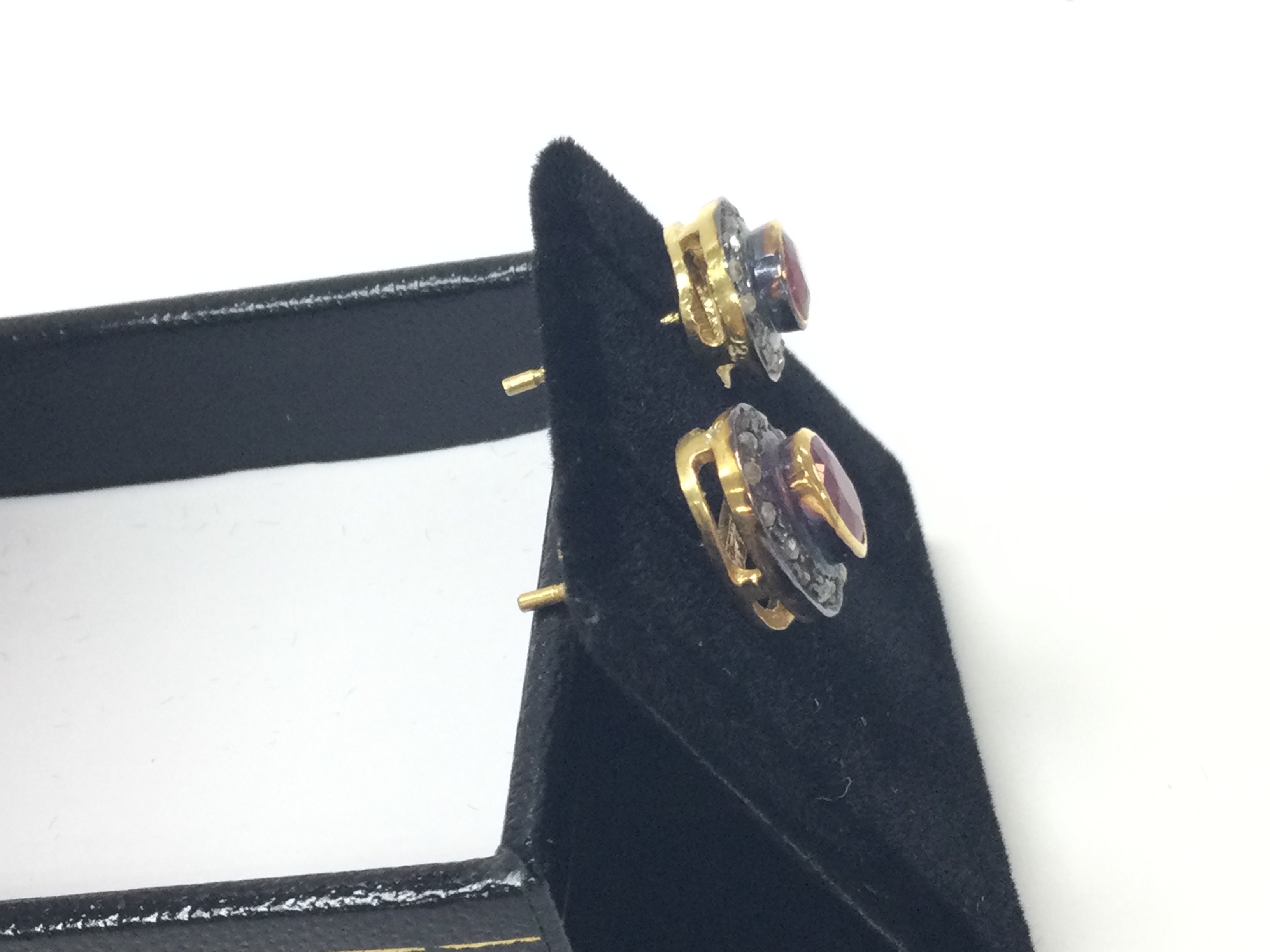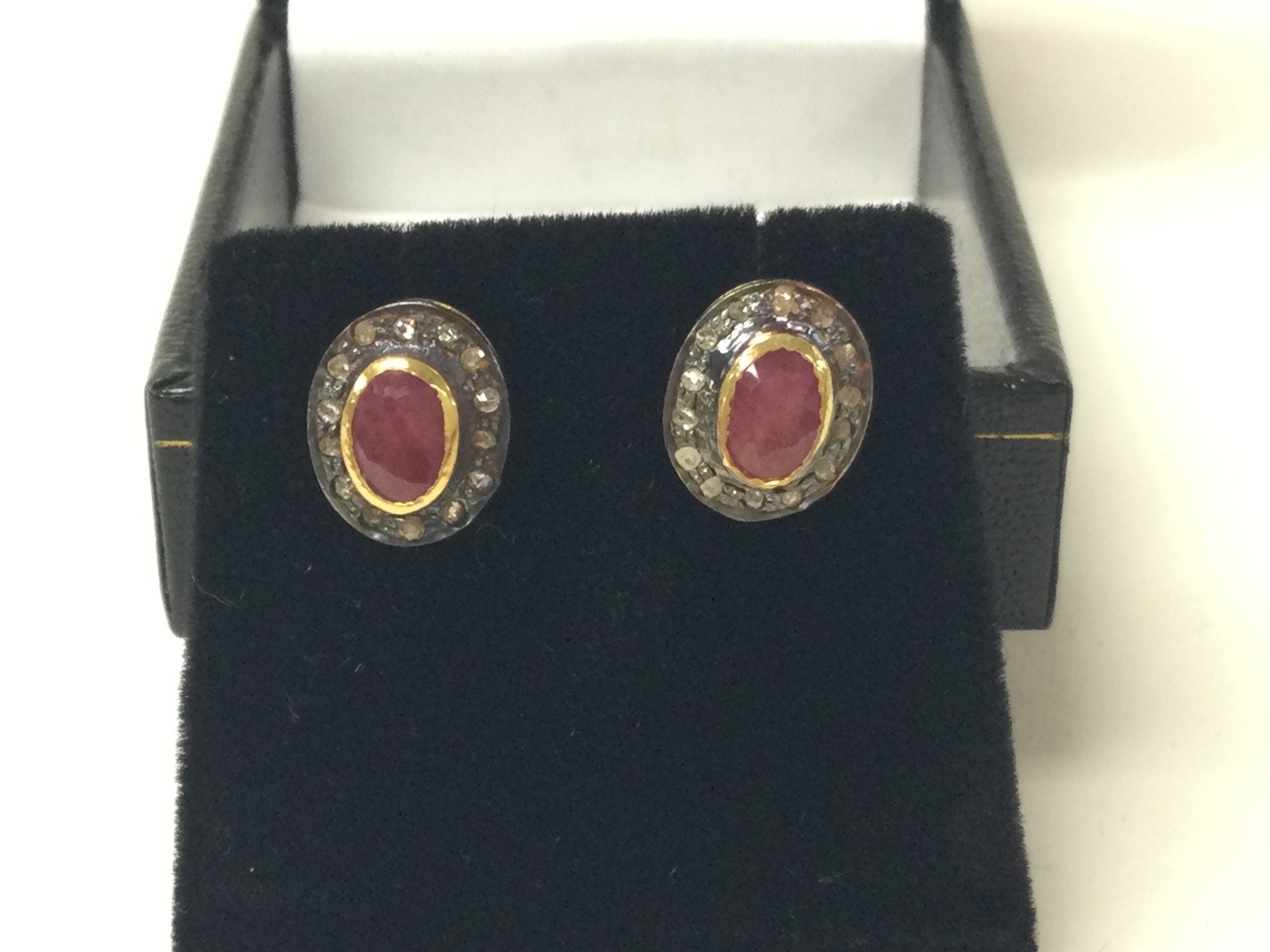 A pair of oval ruby and R/C diamond halo studs in gold plated silver. Ruby 0.28ct and 0.15ct diamonds approx. Postage B