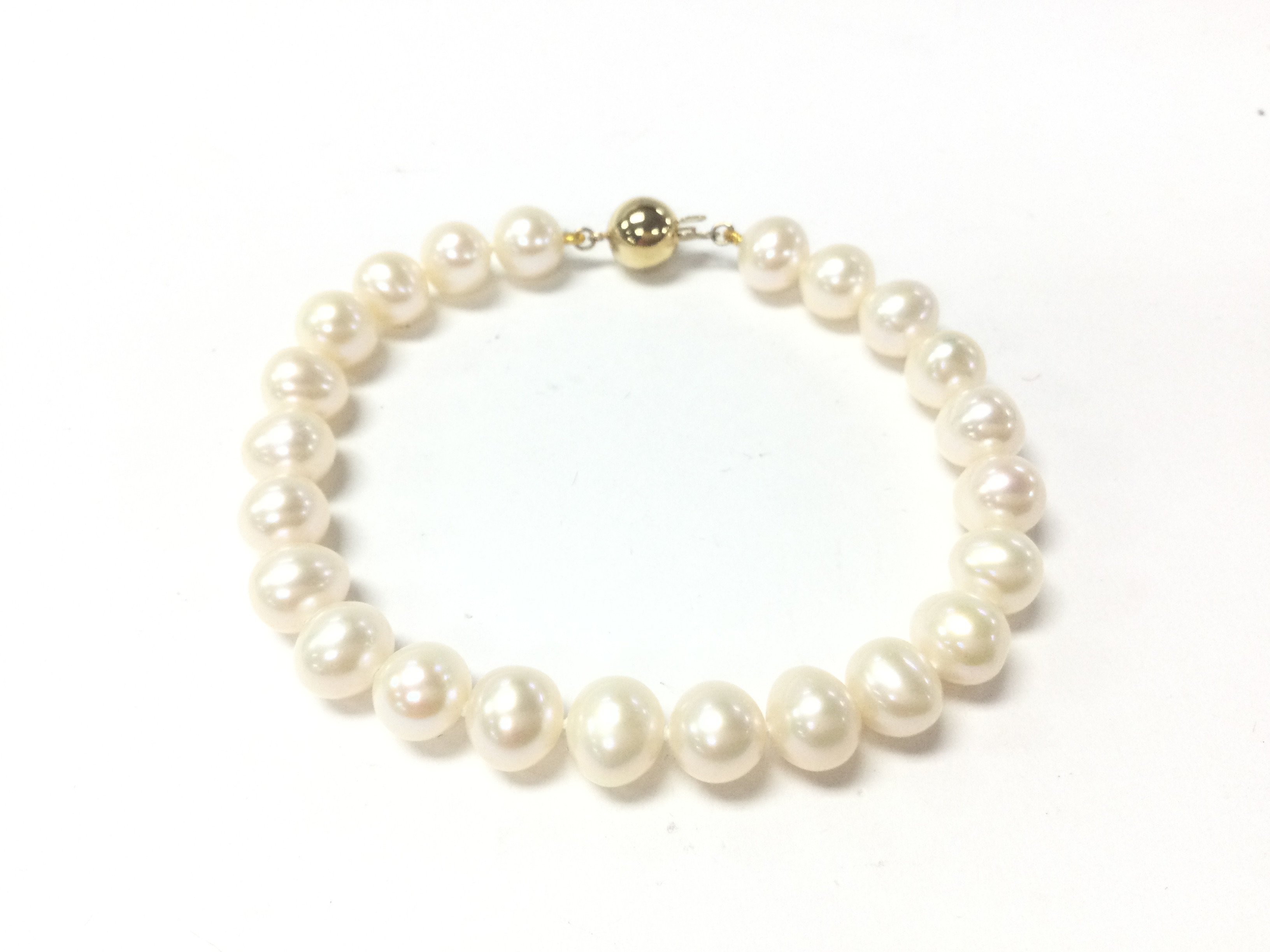 A white round cultured pearl bracelet with 9ct gold ball clasp.