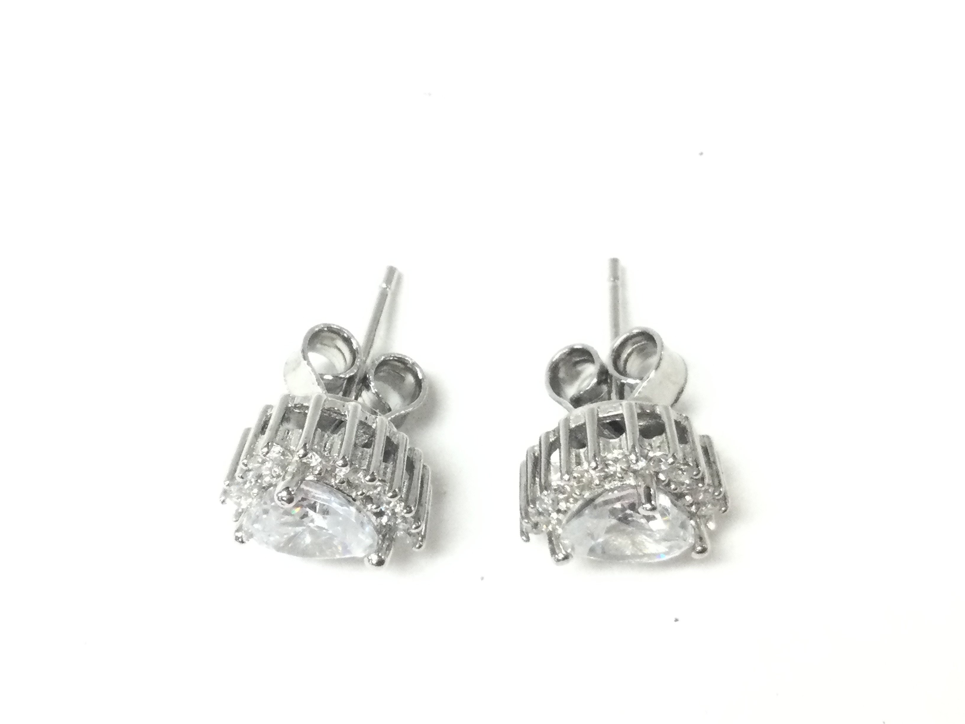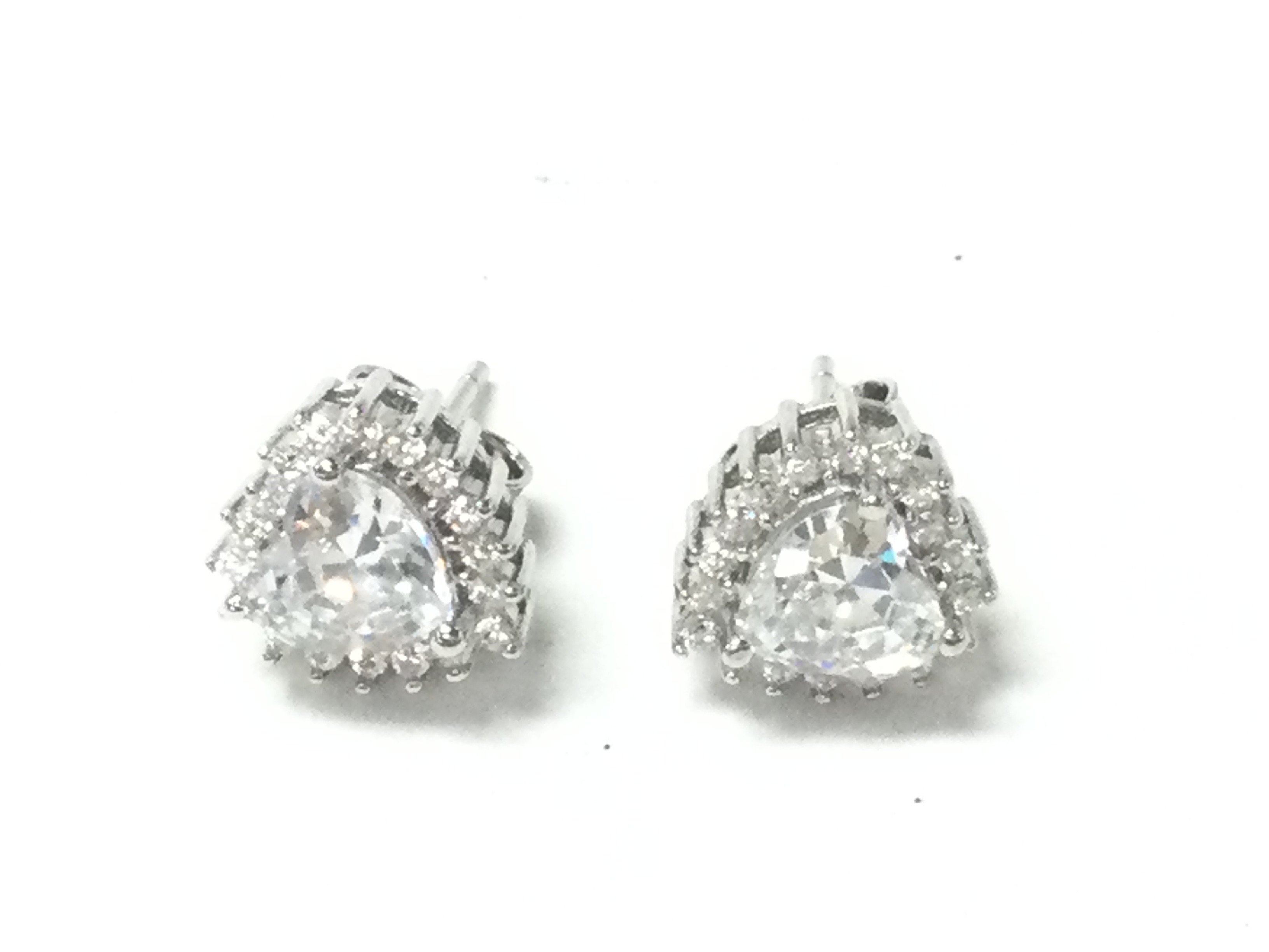 A pair of silver cluster studs set with heart shaped white cubic zirconia and halo of round CZs. Postage A