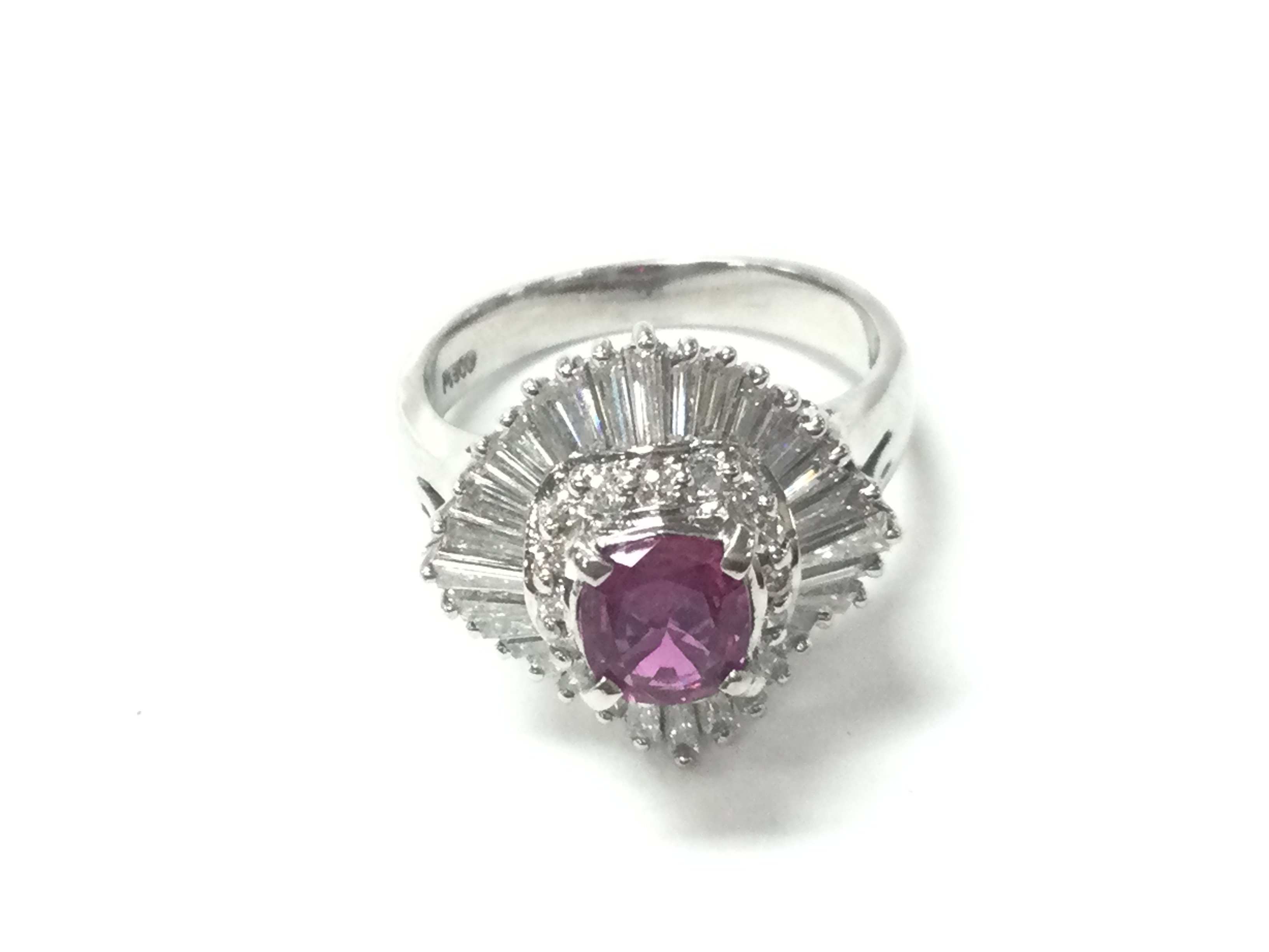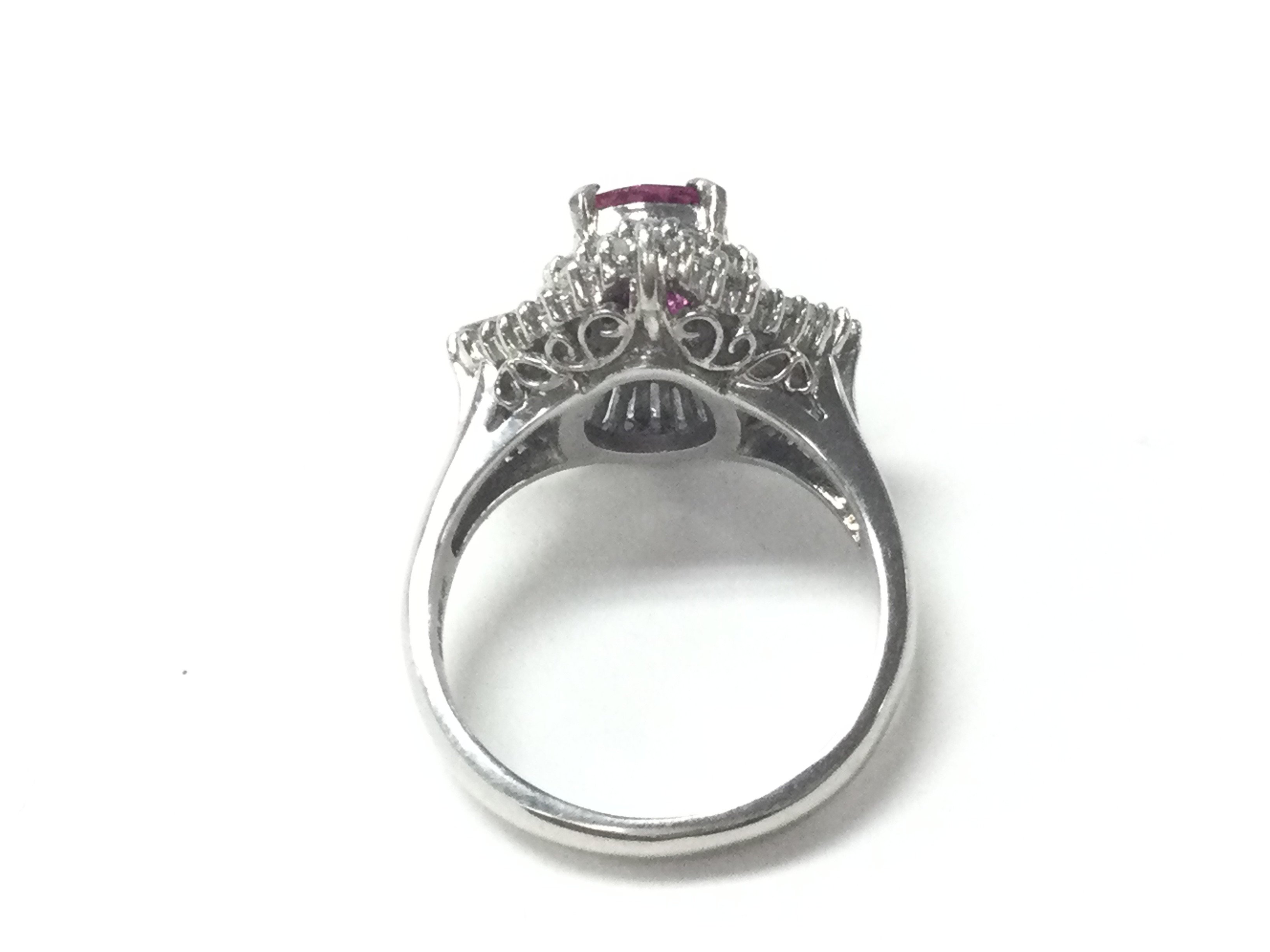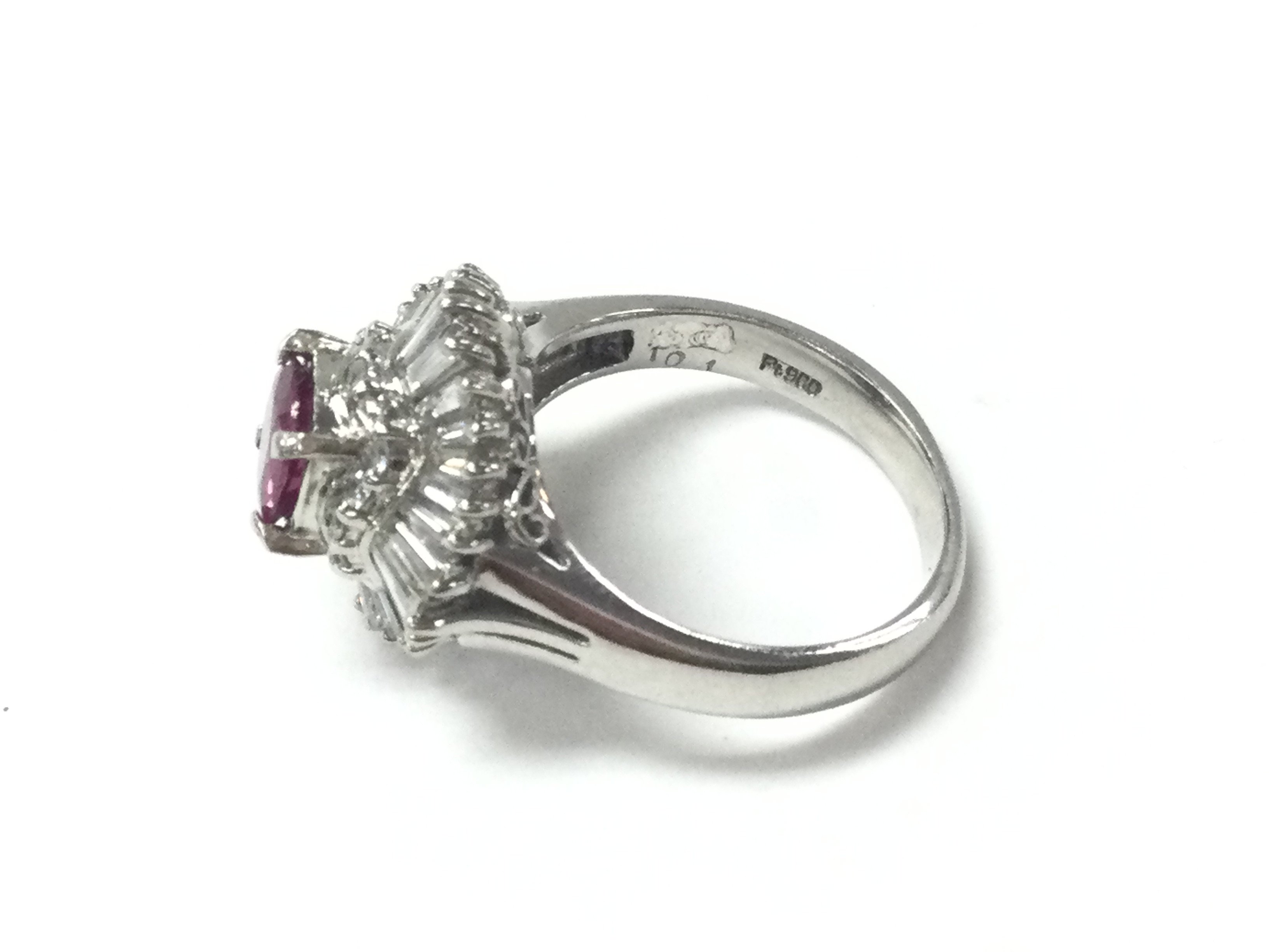A platinum ruby and diamond ballerina-style ring. Ruby 0.76ct and tapered baguette diamond 1.01ct approx. Size L and 9.2g. Postage B