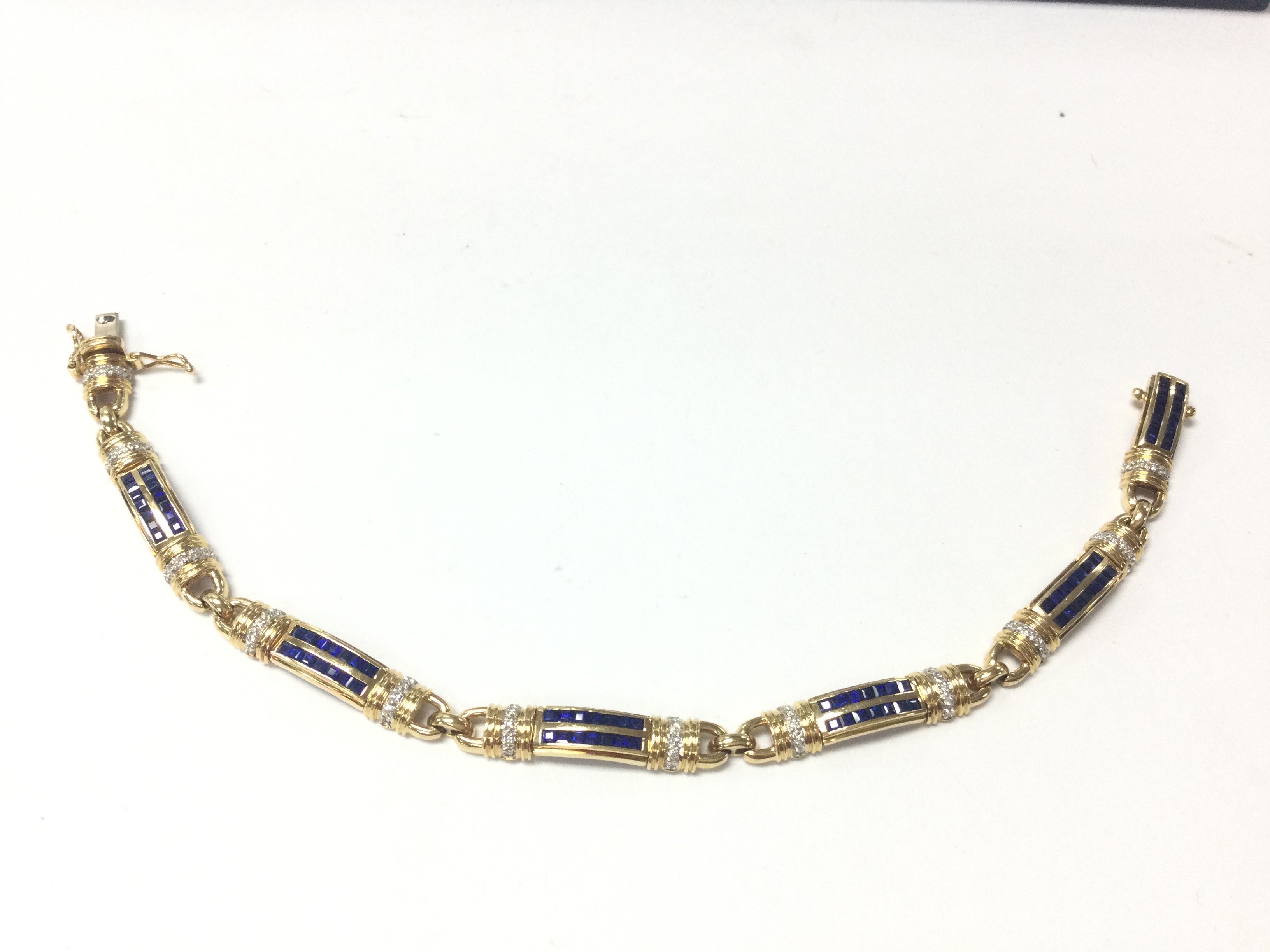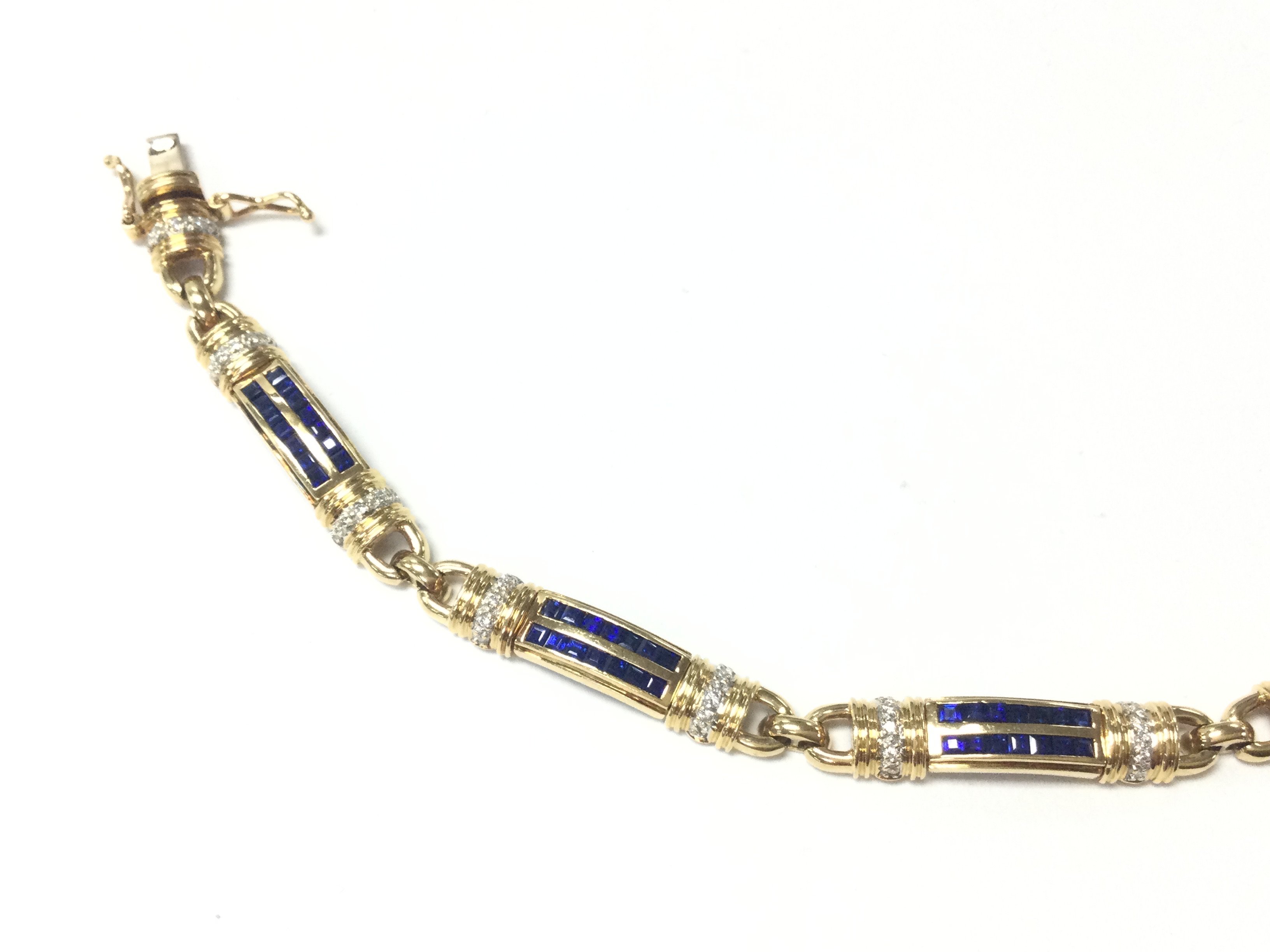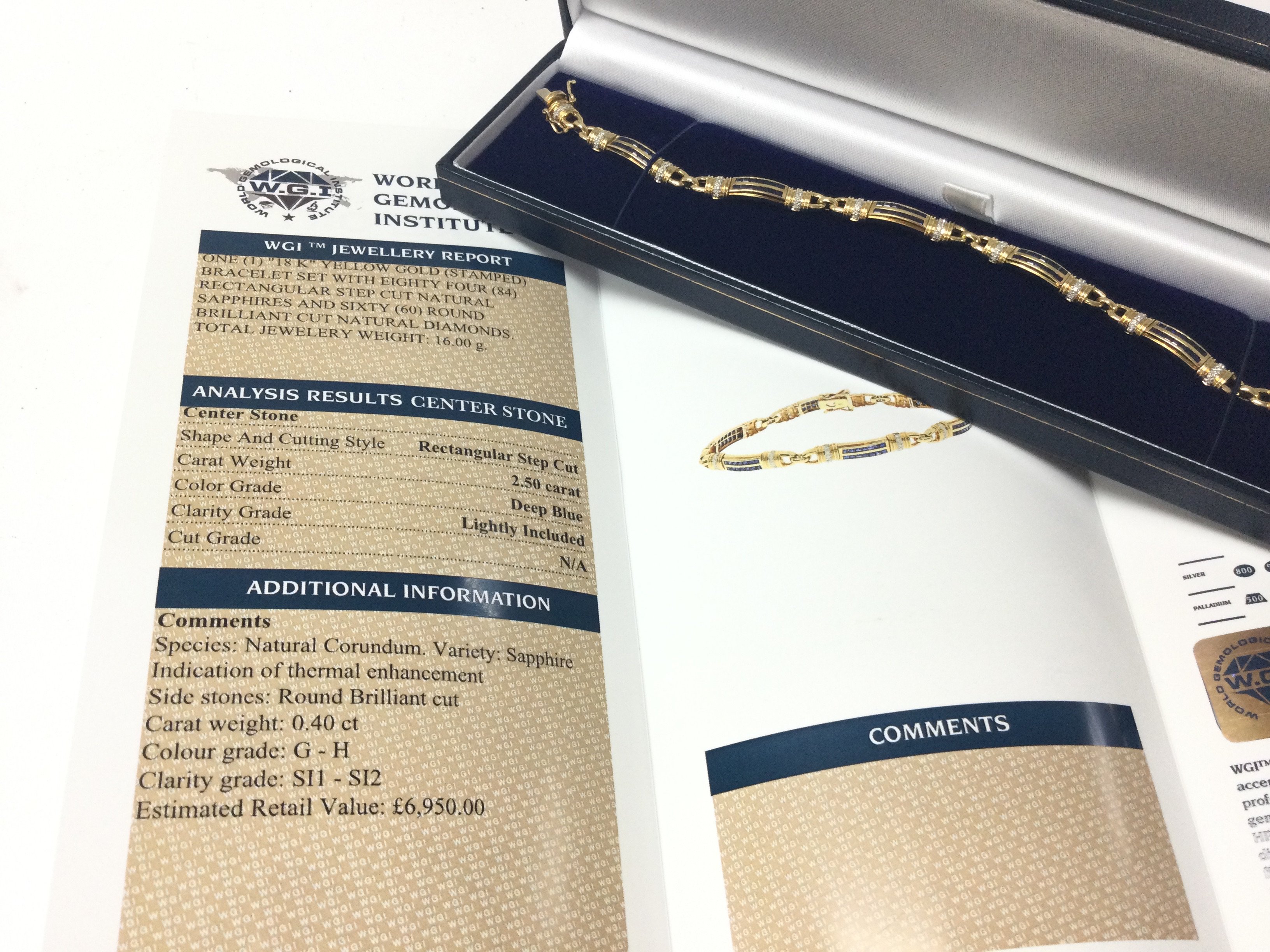 An 18ct yellow gold step cut sapphire and diamond panel bracelet. Sapphires 2.50ct and diamonds 0.40ct approx. Comes with cert.