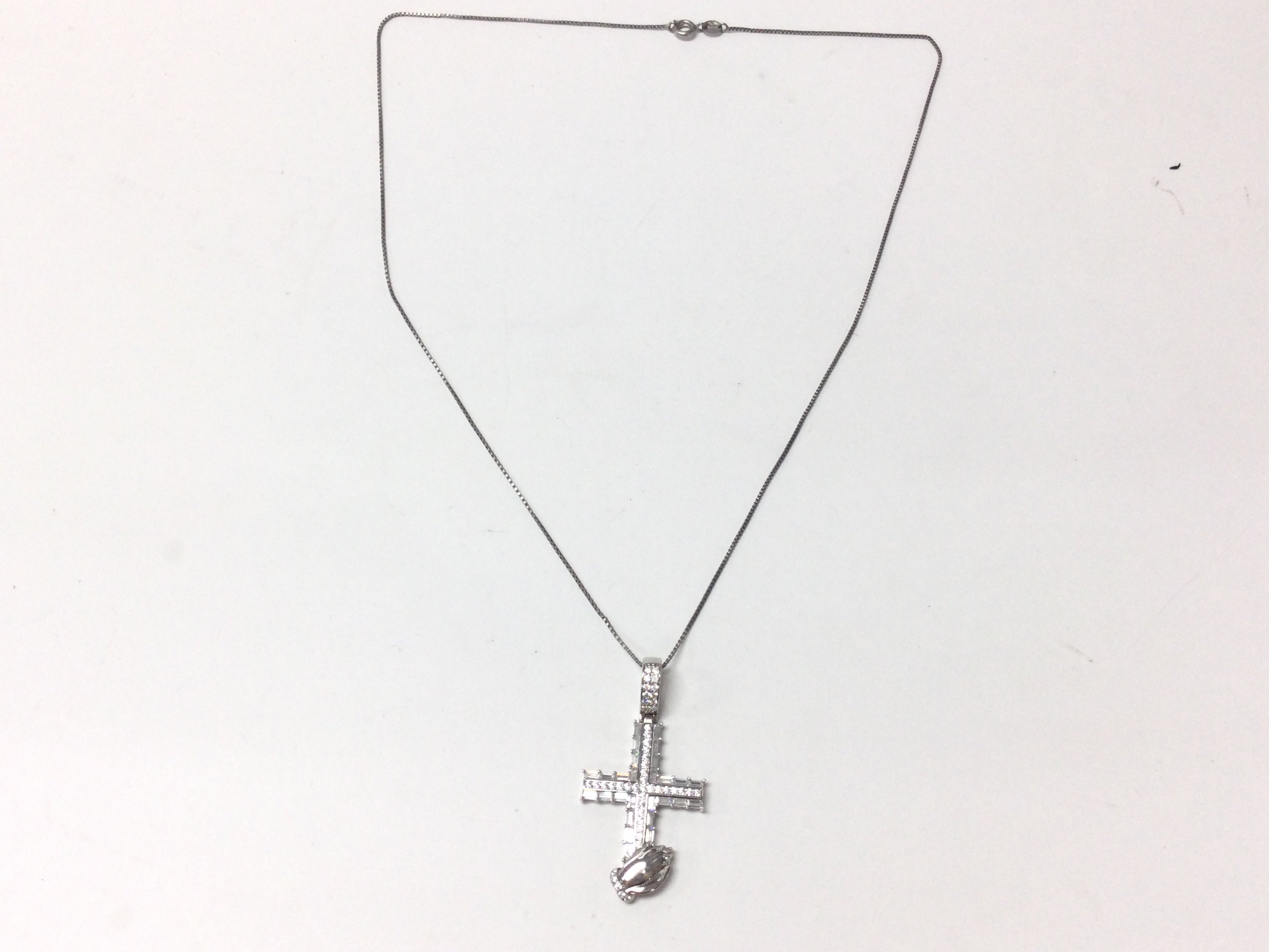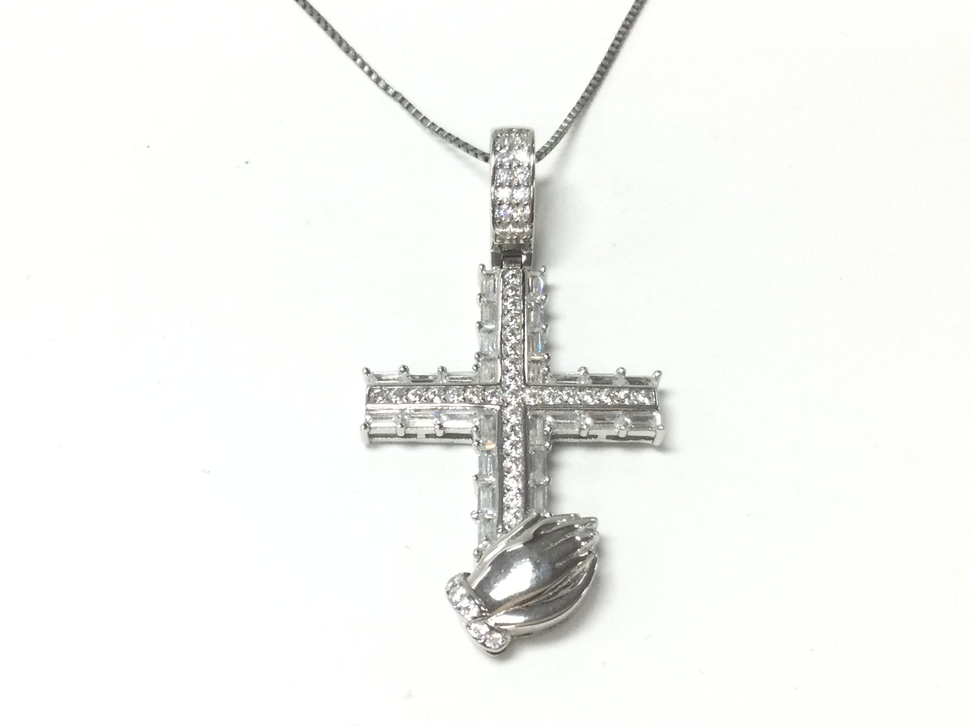 A silver cross pendant with praying hands set with round and baguette cut white CZ on a silver chain. Postage A