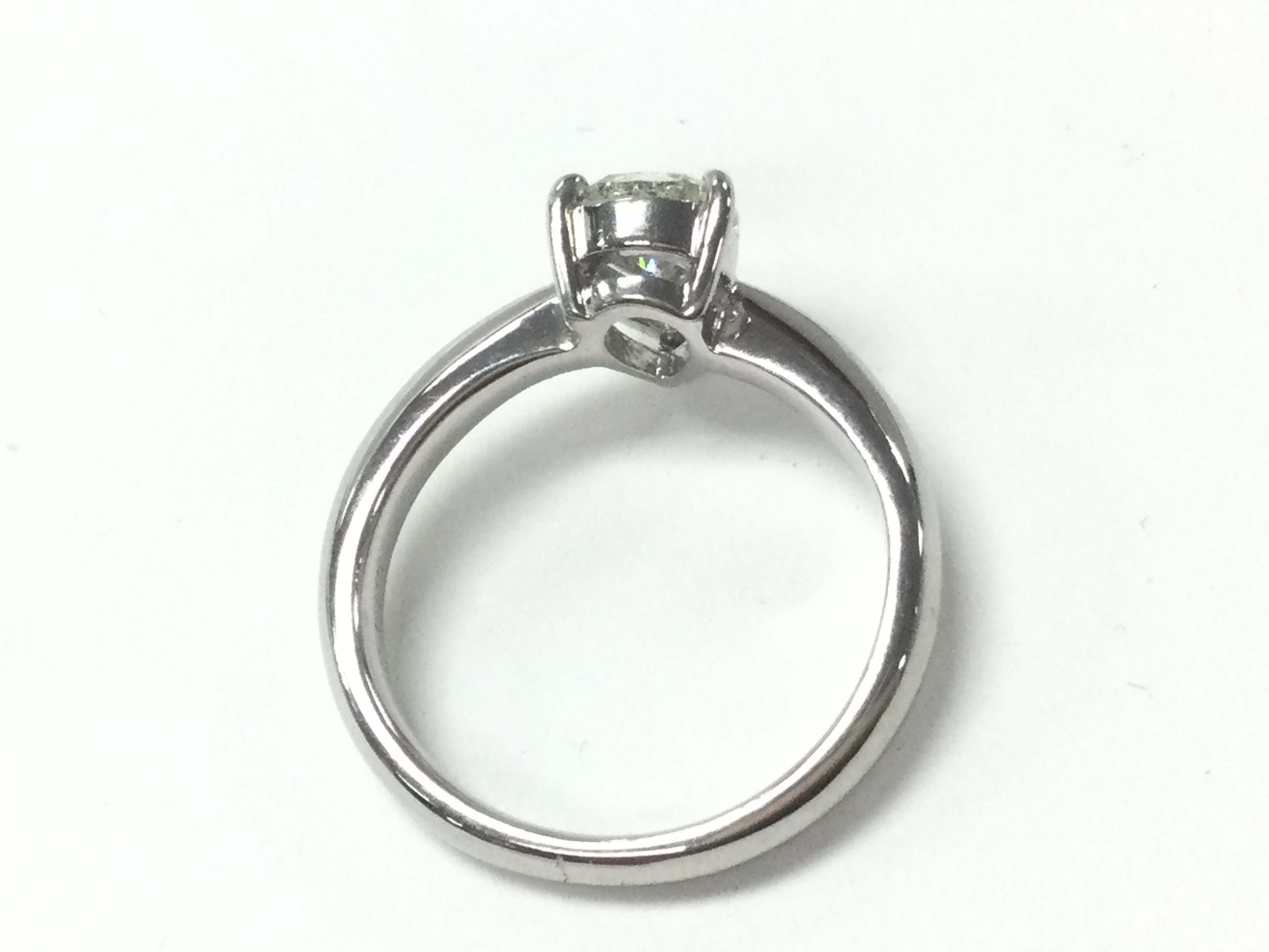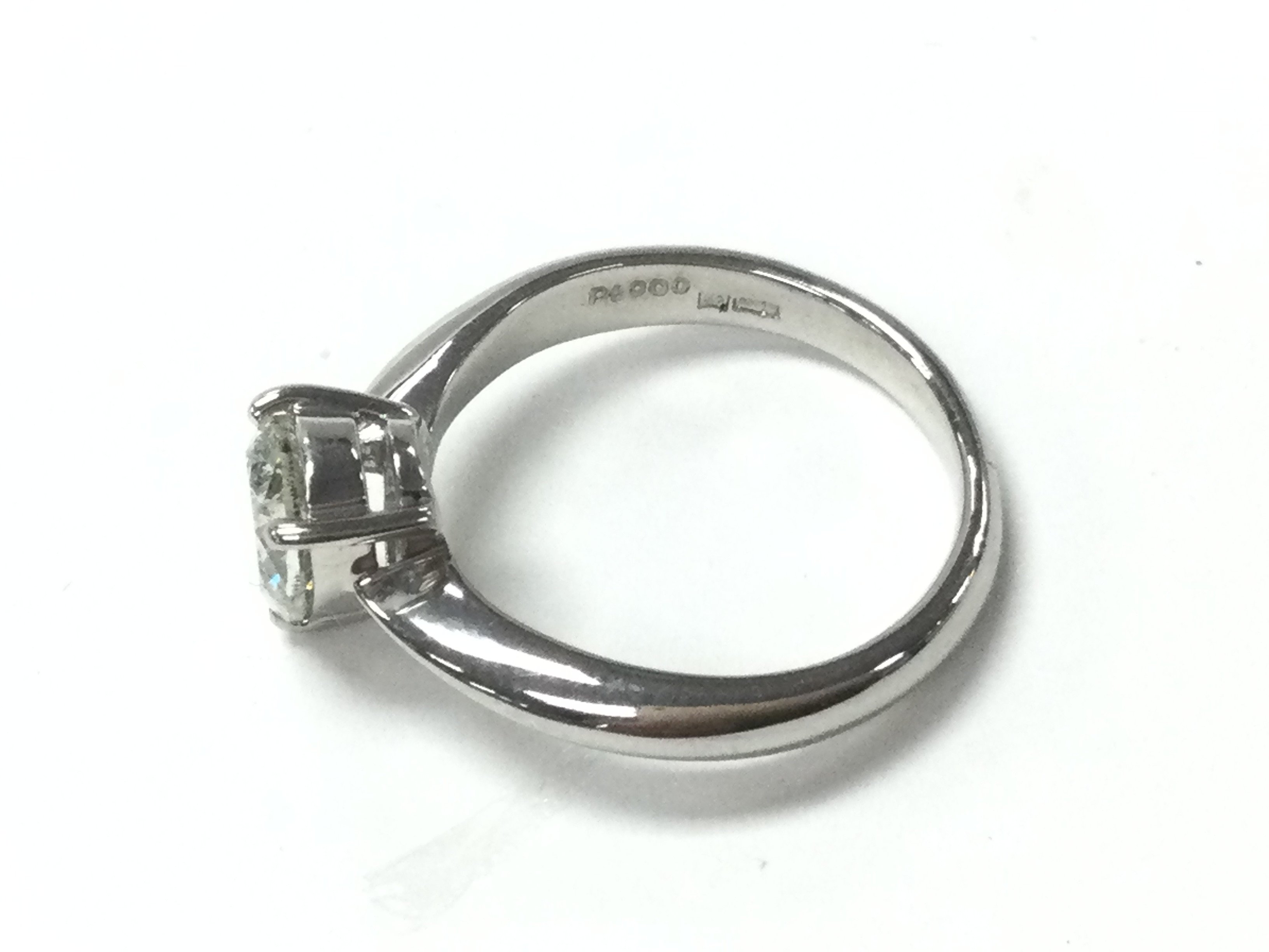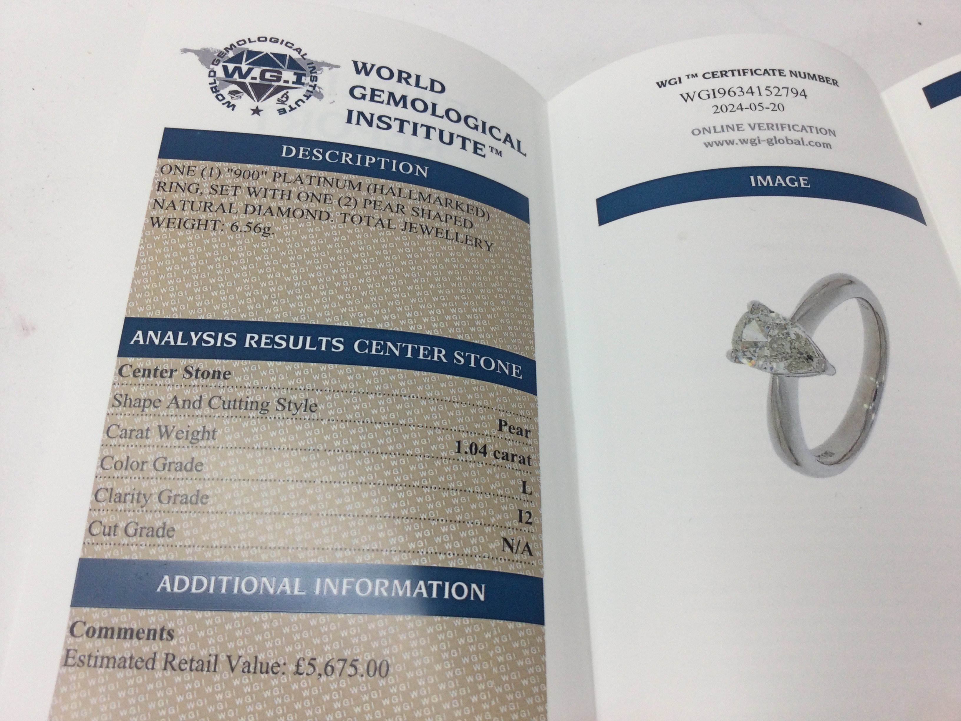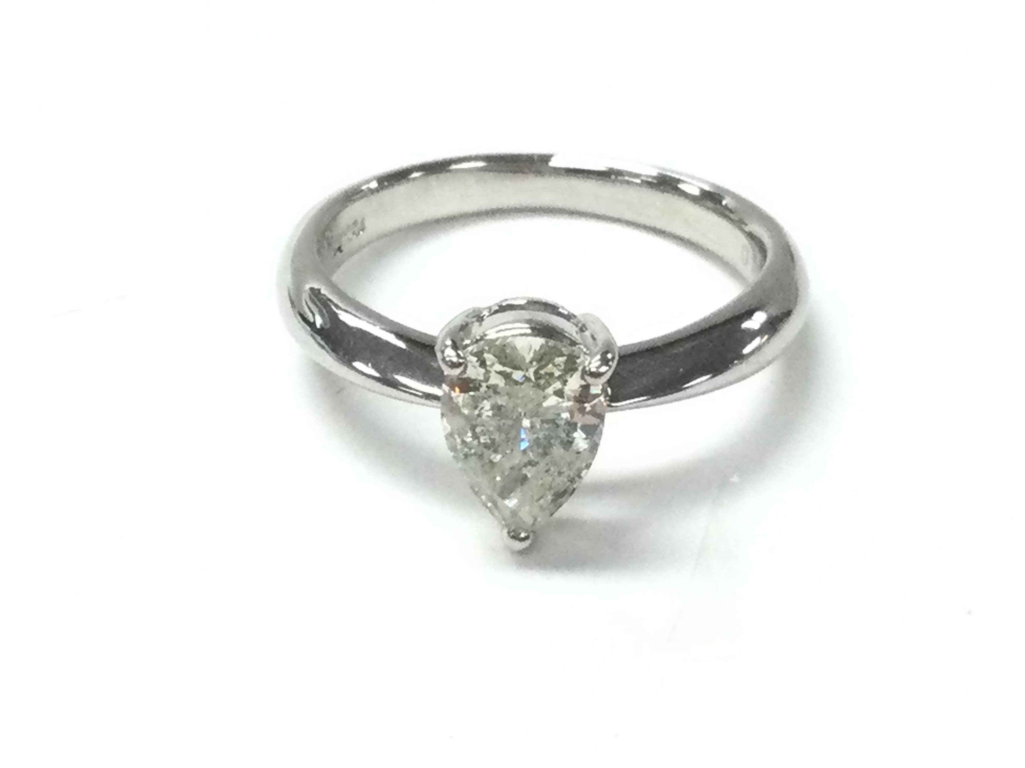 A platinum solitaire ring set with a 1.04ct pear shaped diamond with certificate. Ring size M 1/2. Postage A