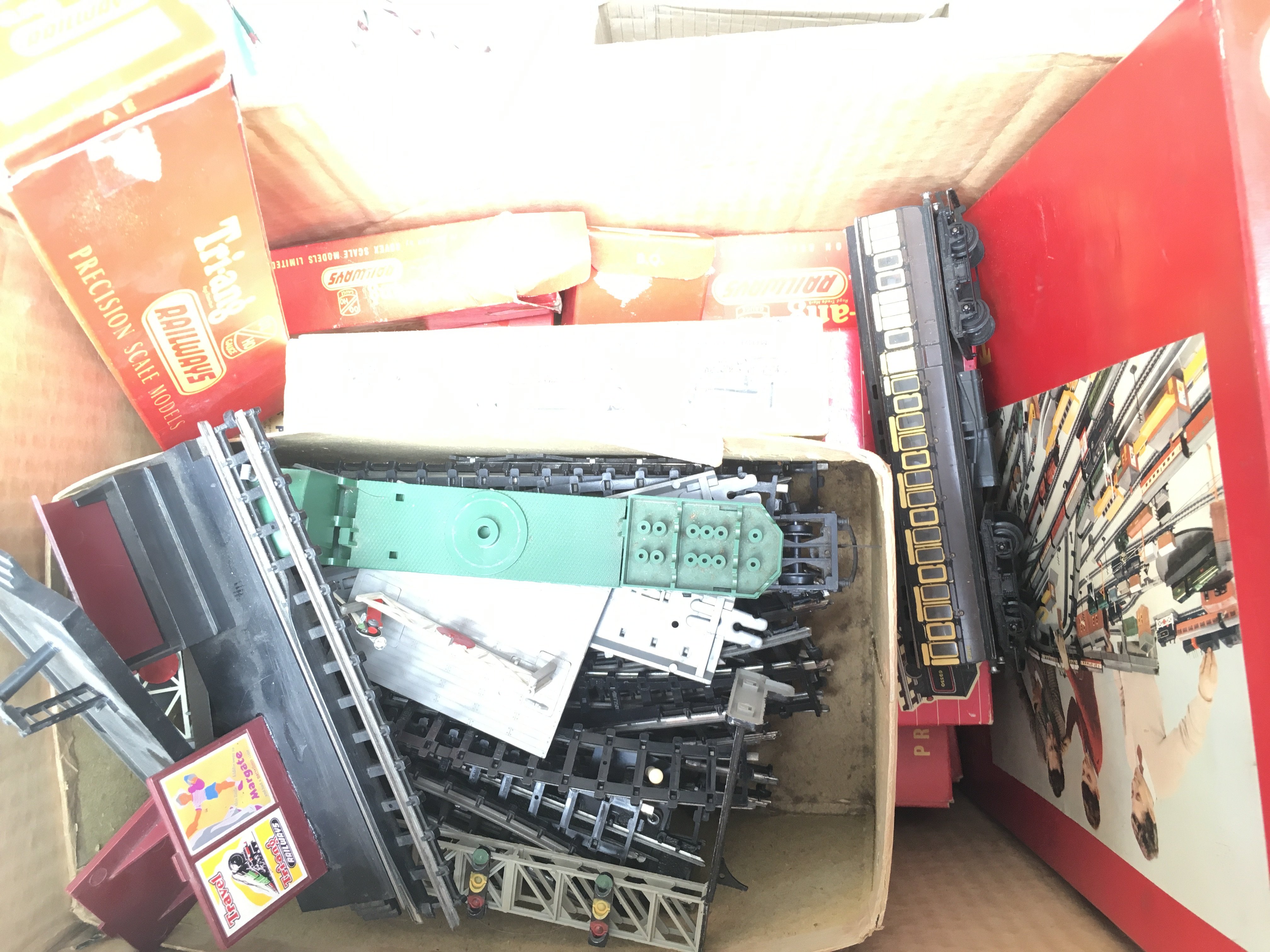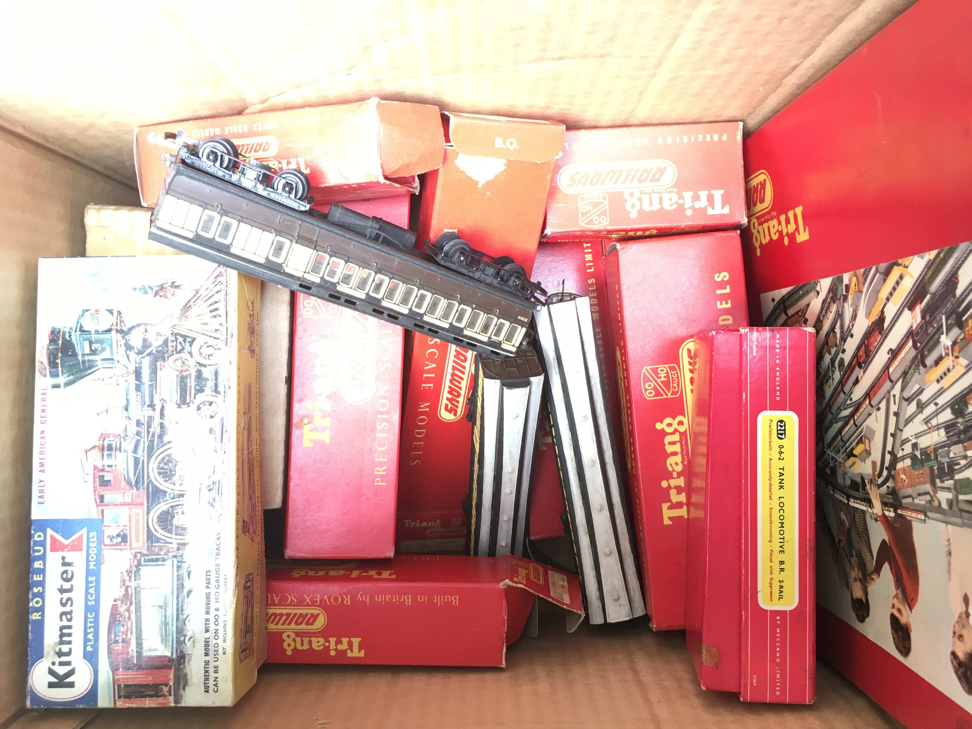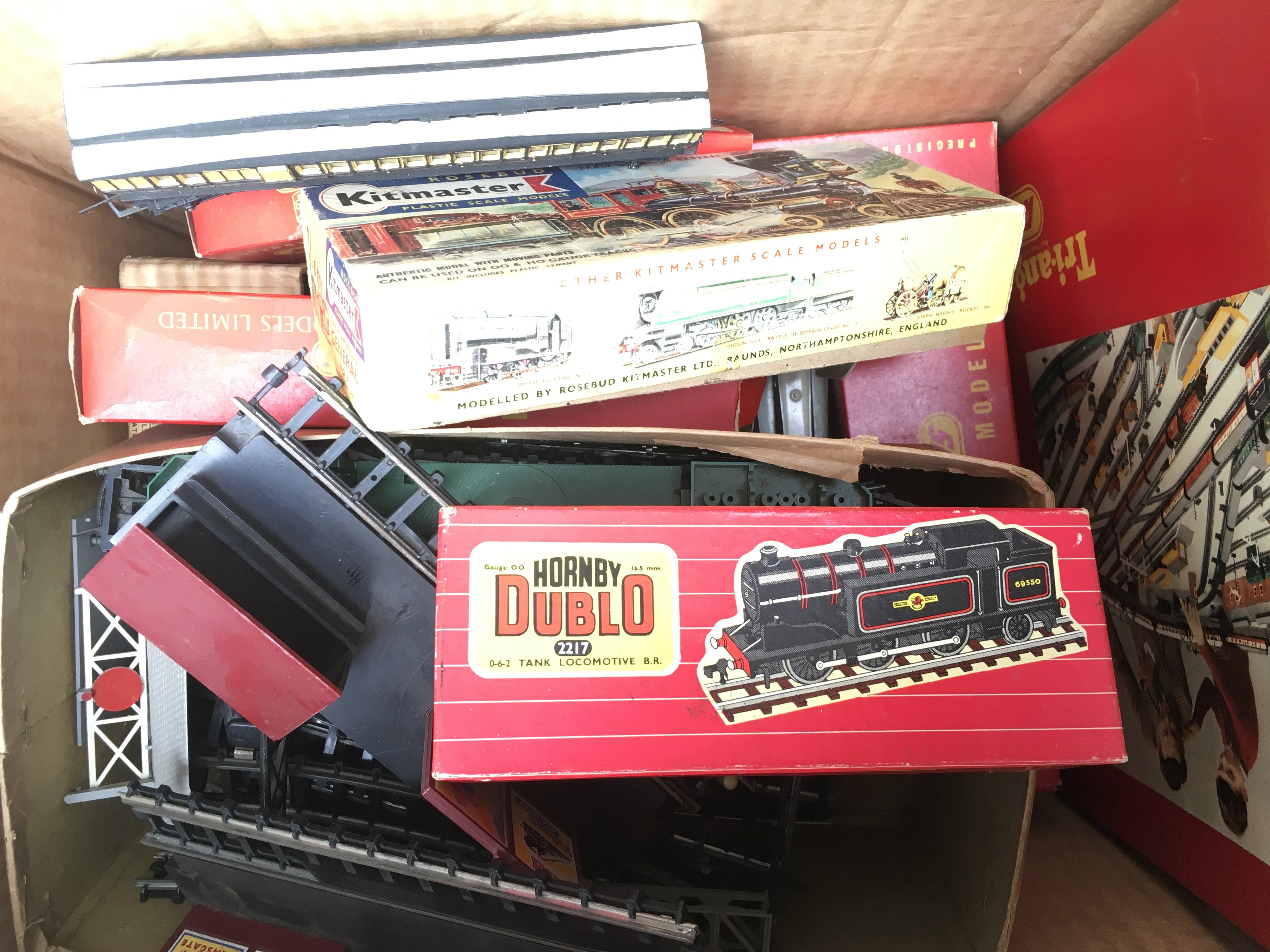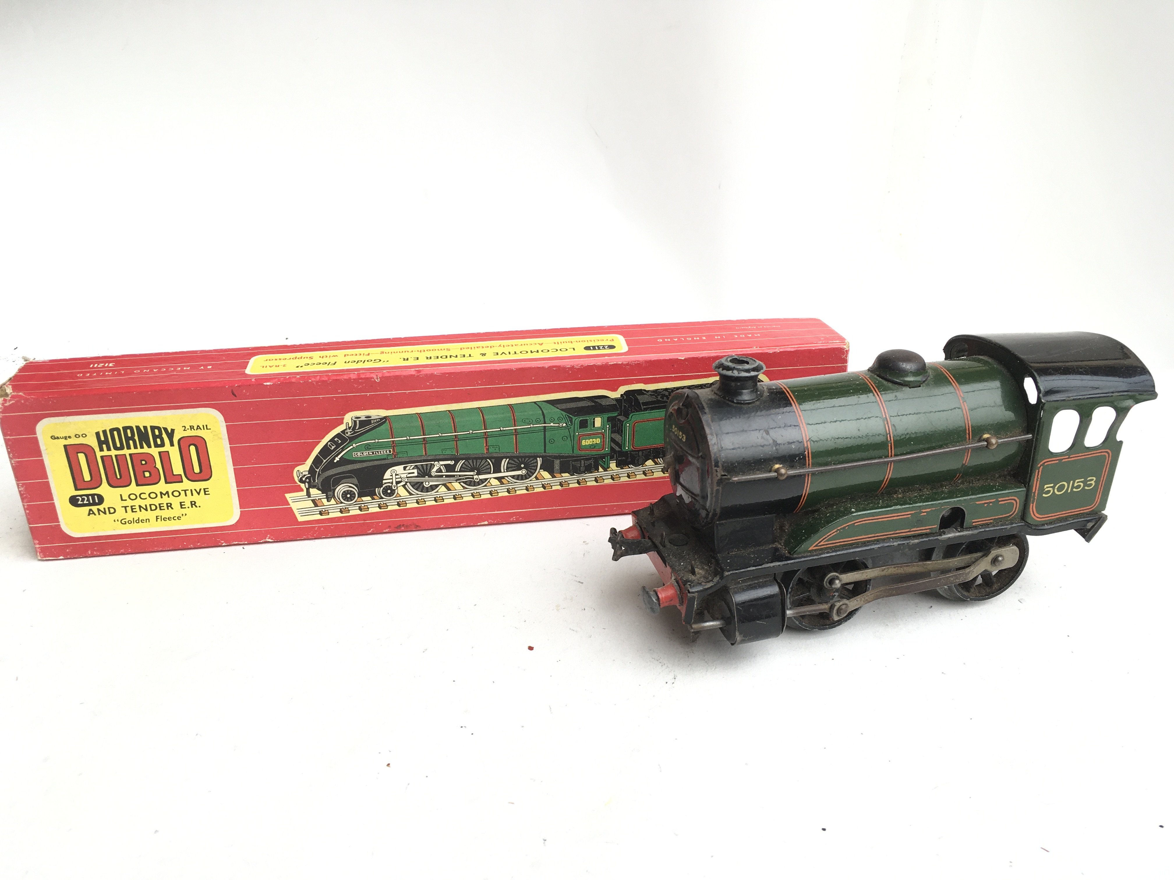 A Box Containing Model Railway items including a 00 Gauge Hornby Dublo Golden Fleece. Coaches. Track. And a 0 Gauge Locomotive.