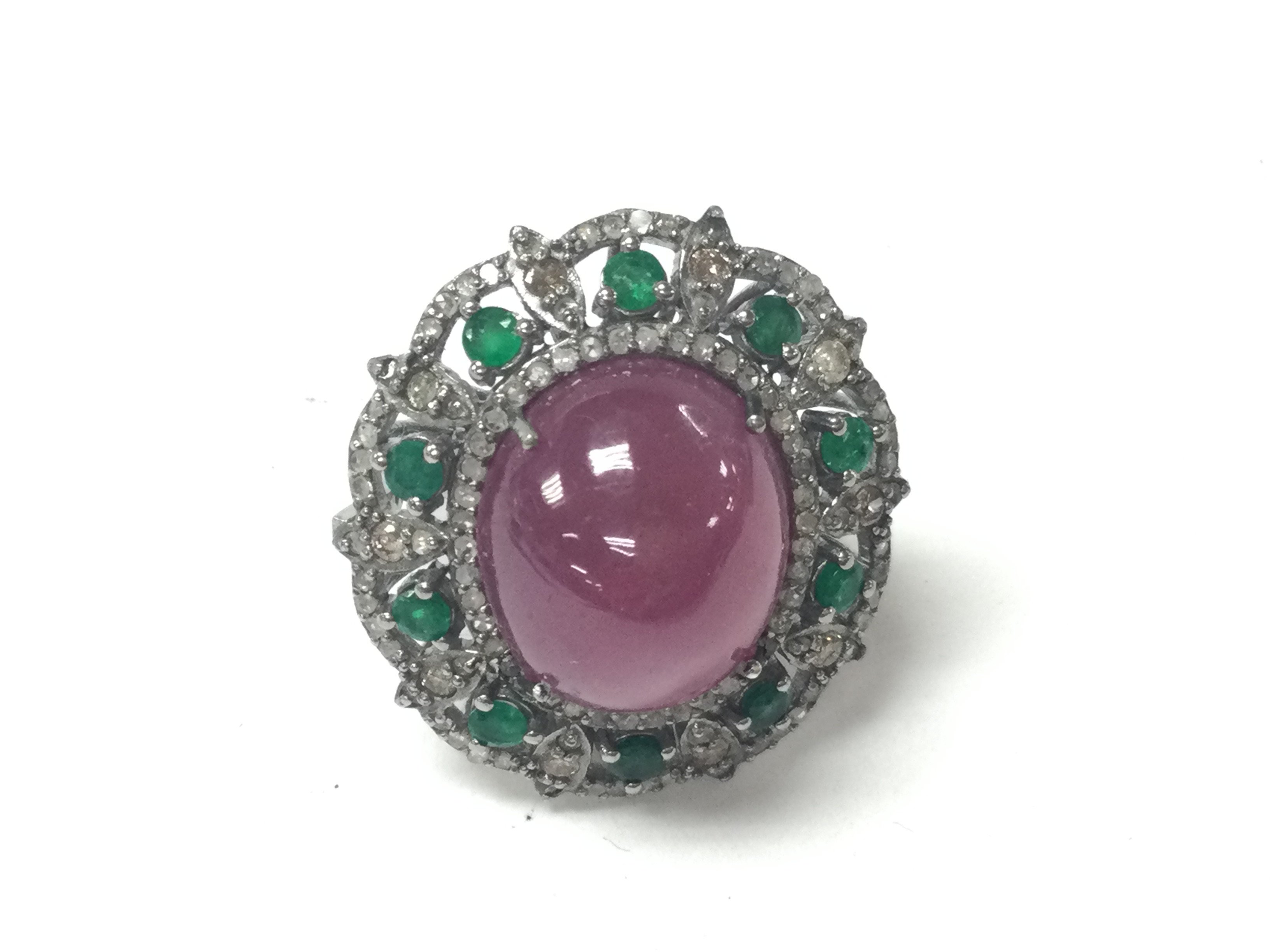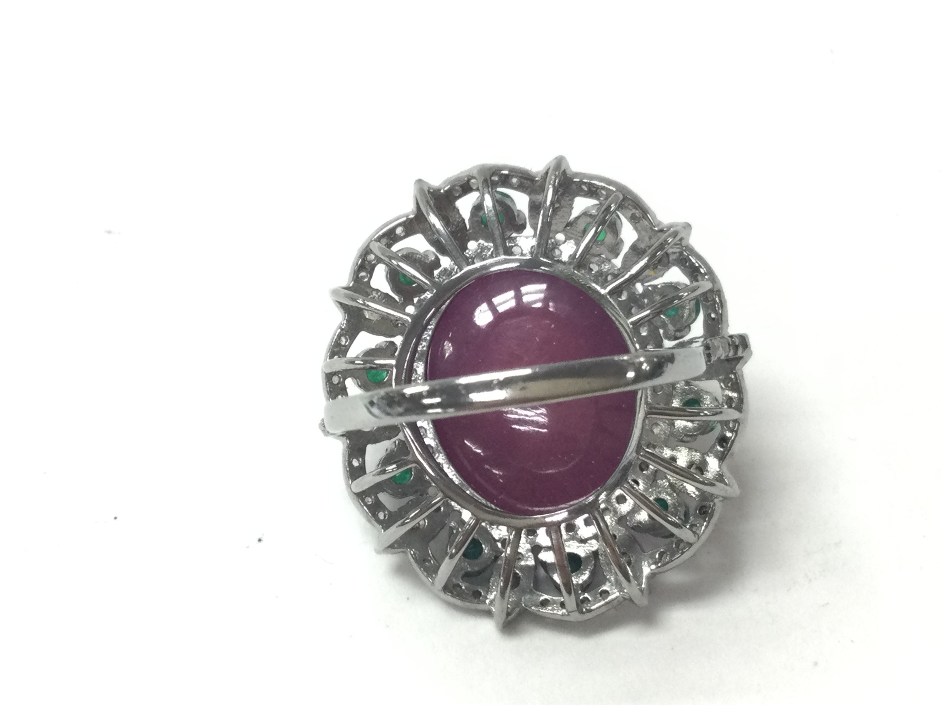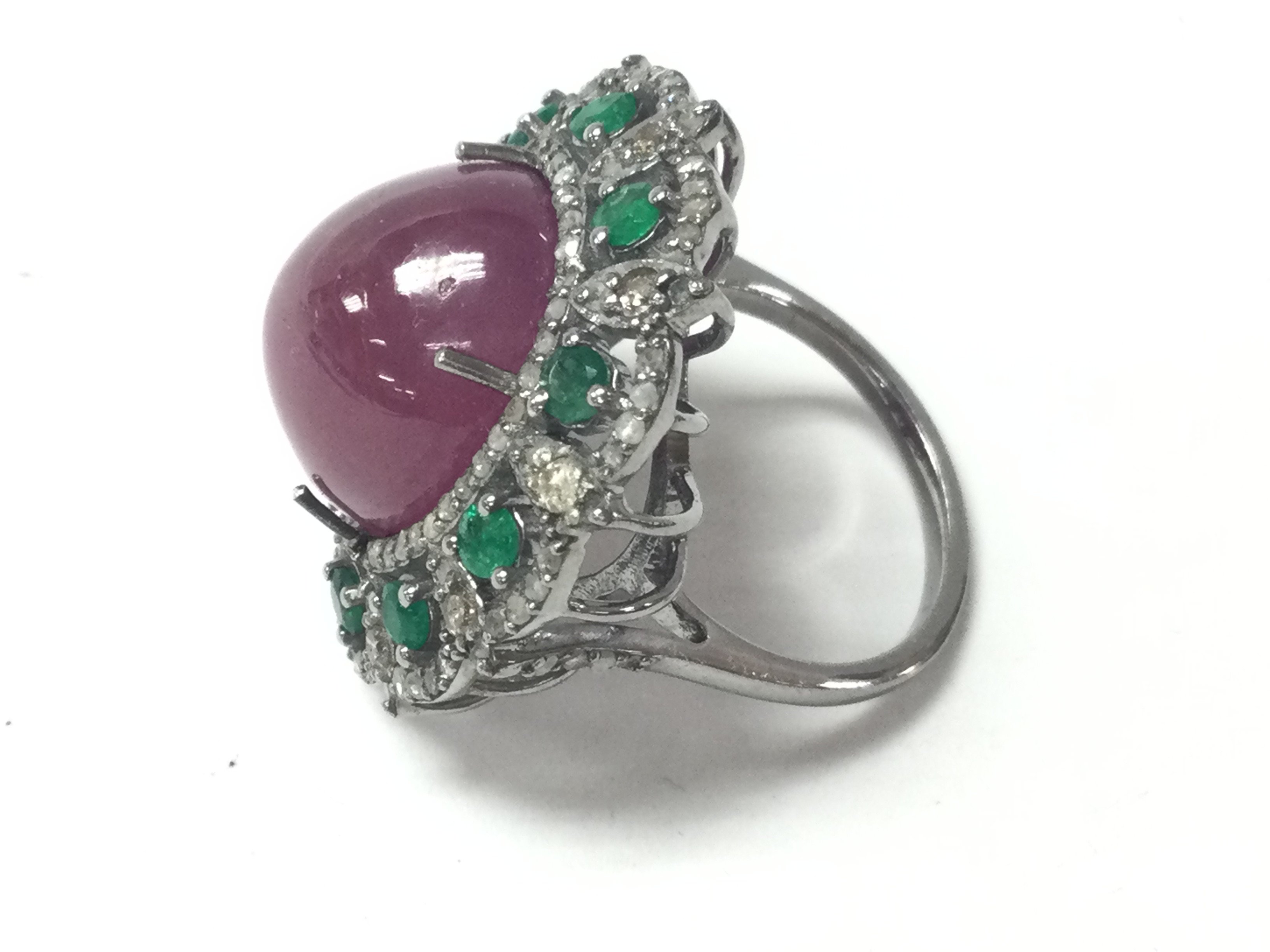 Large dress ring in white metal set with an oval cabochon ruby round emerald and RC diamonds in a stylish box. Ruby 22.35ct emerald 0.85ct and diamonds 0.60ct approximately. Ring size O