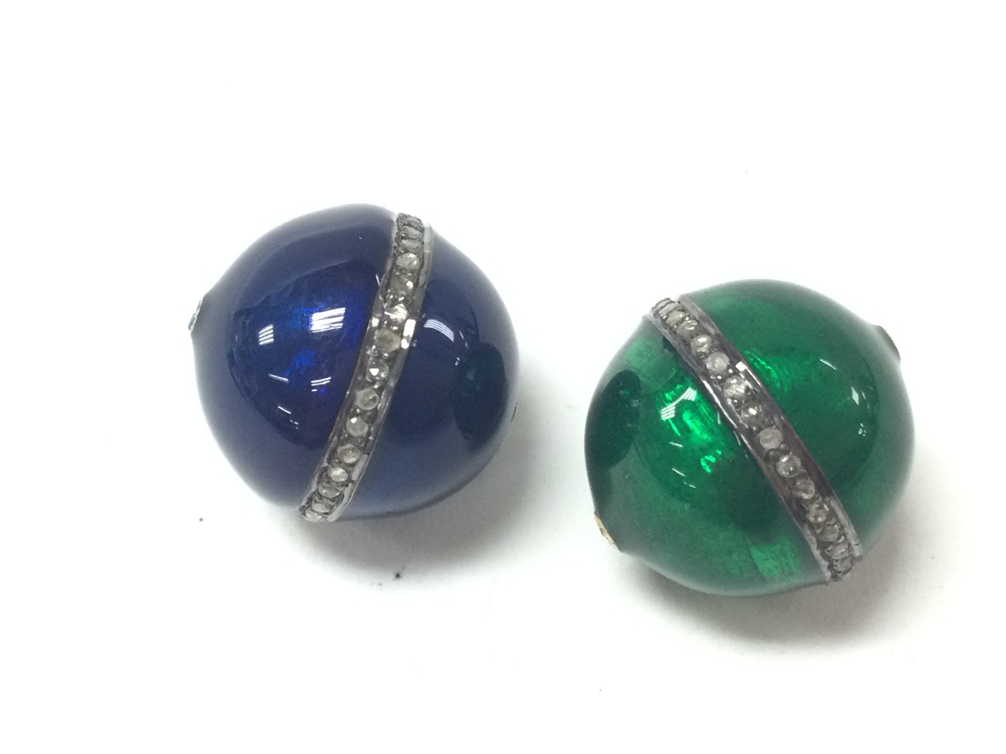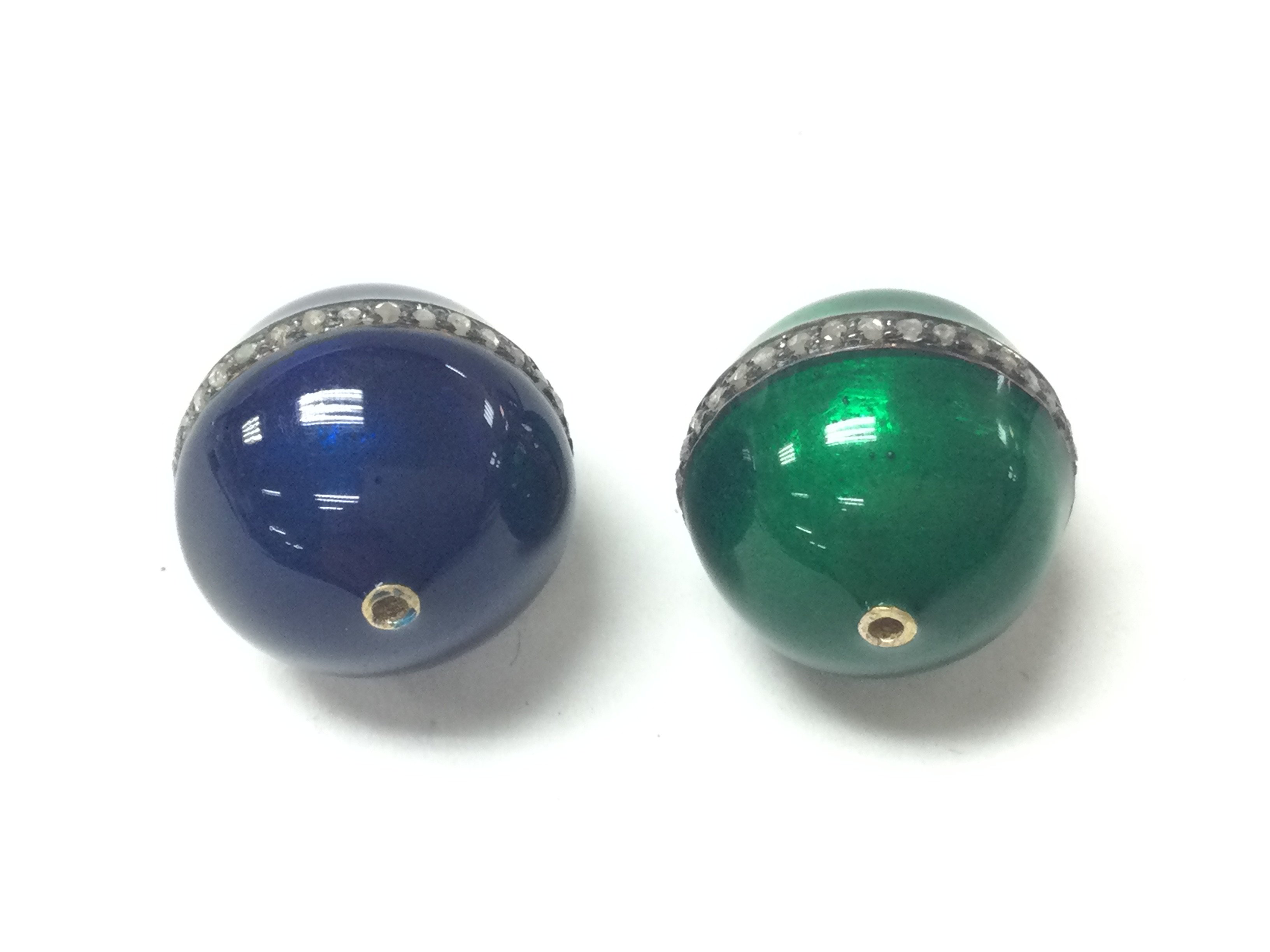 A pair of diamond and enamel beads one blue and one green. Both set with a line of diamonds approx 0.30ct total. Postage A