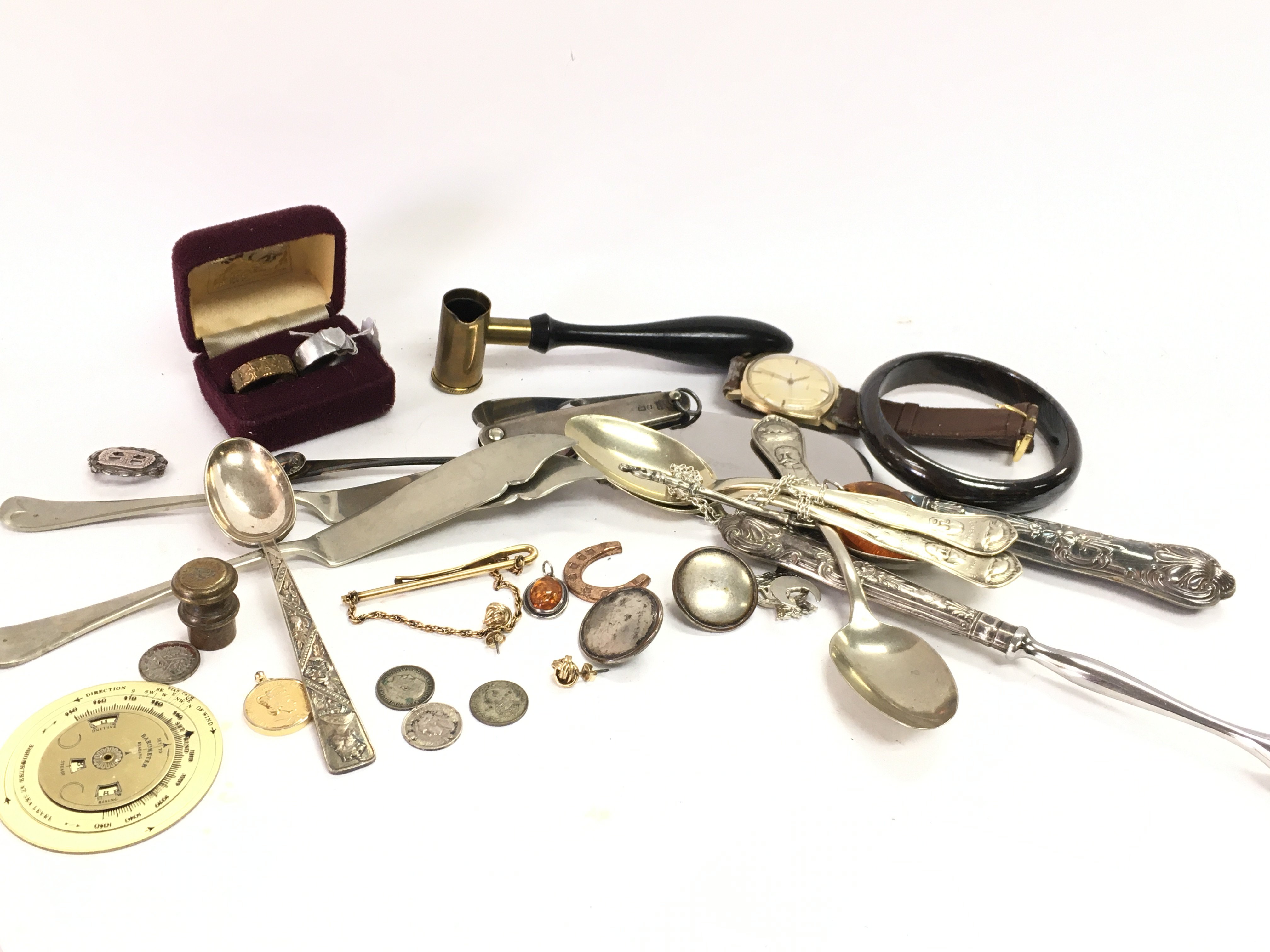 A collection of jewellery including a silver hallmarked pickle fork, WW1 trench art Mizpah ring, silver hallmarked pen knife. Postage category B