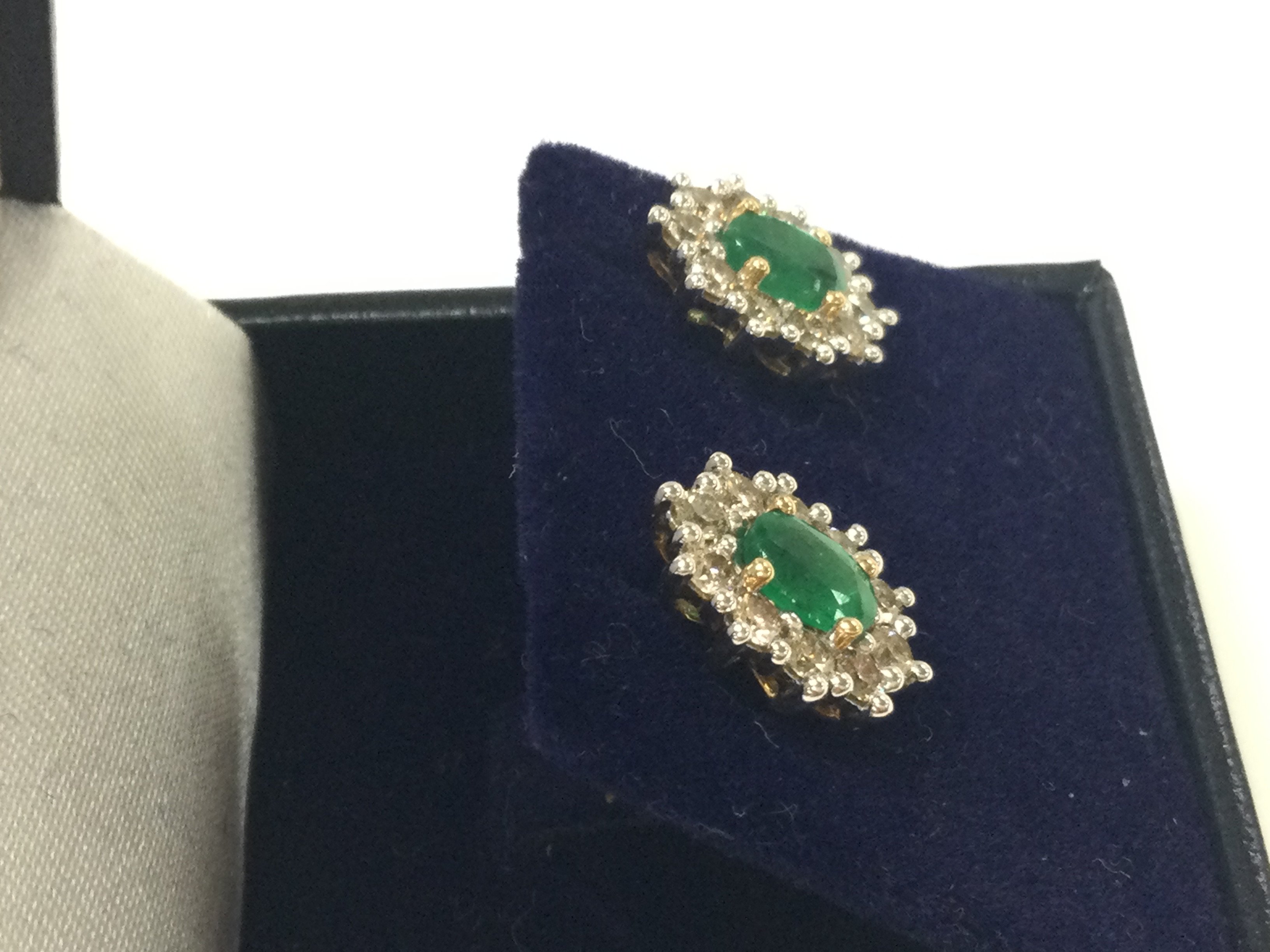 A pair of 9ct yellow and white gold oval emerald and RBC diamond cluster studs. Emerald 1.01ct and diamonds 1ct approximately. Postage A